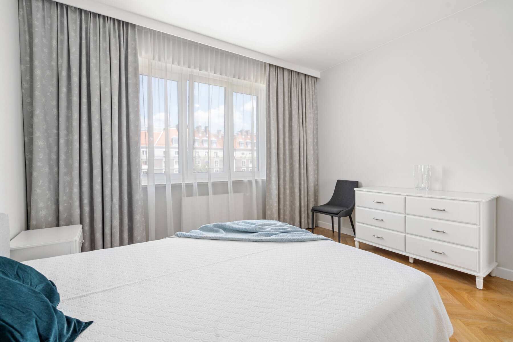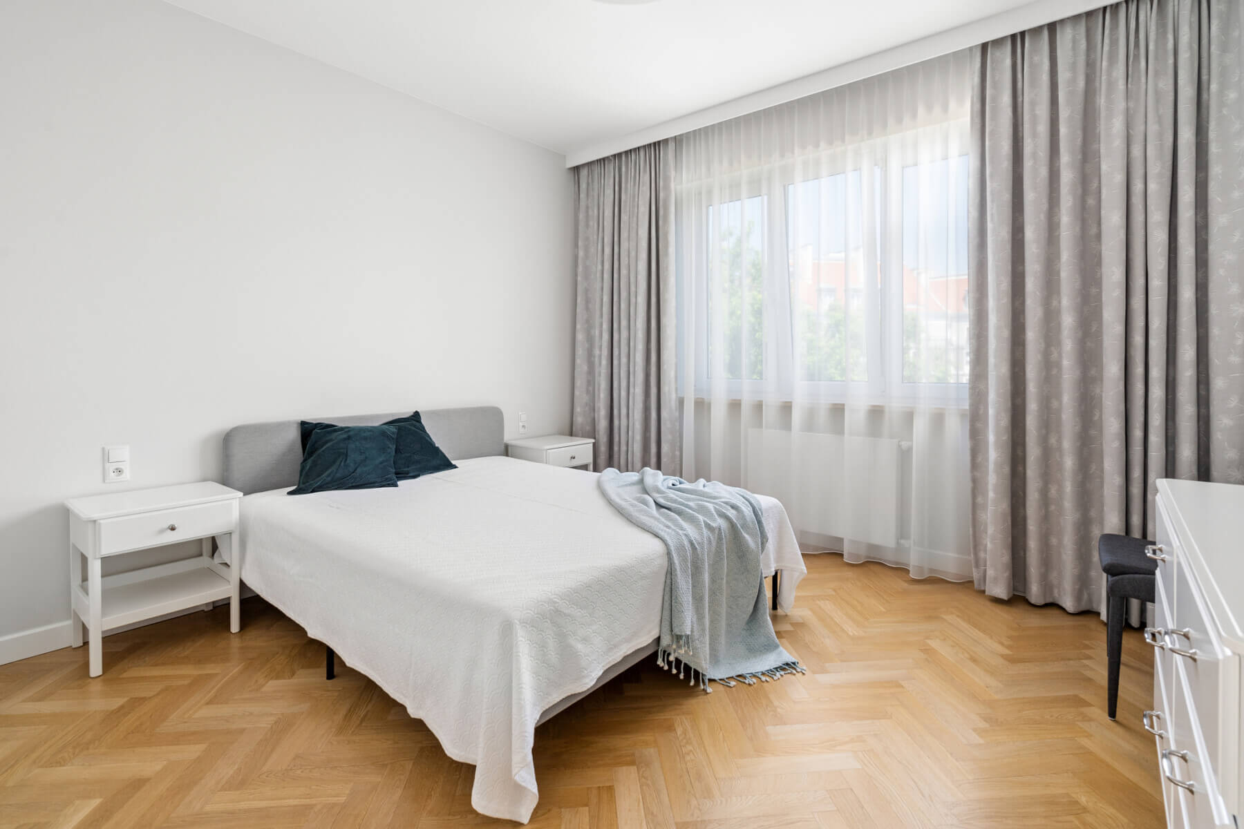The apartment is located on the 4th floor of a five-story building with an elevator. The bedroom windows overlook Aleja Wyzwolenia Street, while in the living room and a smaller room on the back side of the building. The whole creates an extremely friendly space to live in the very center of the city.