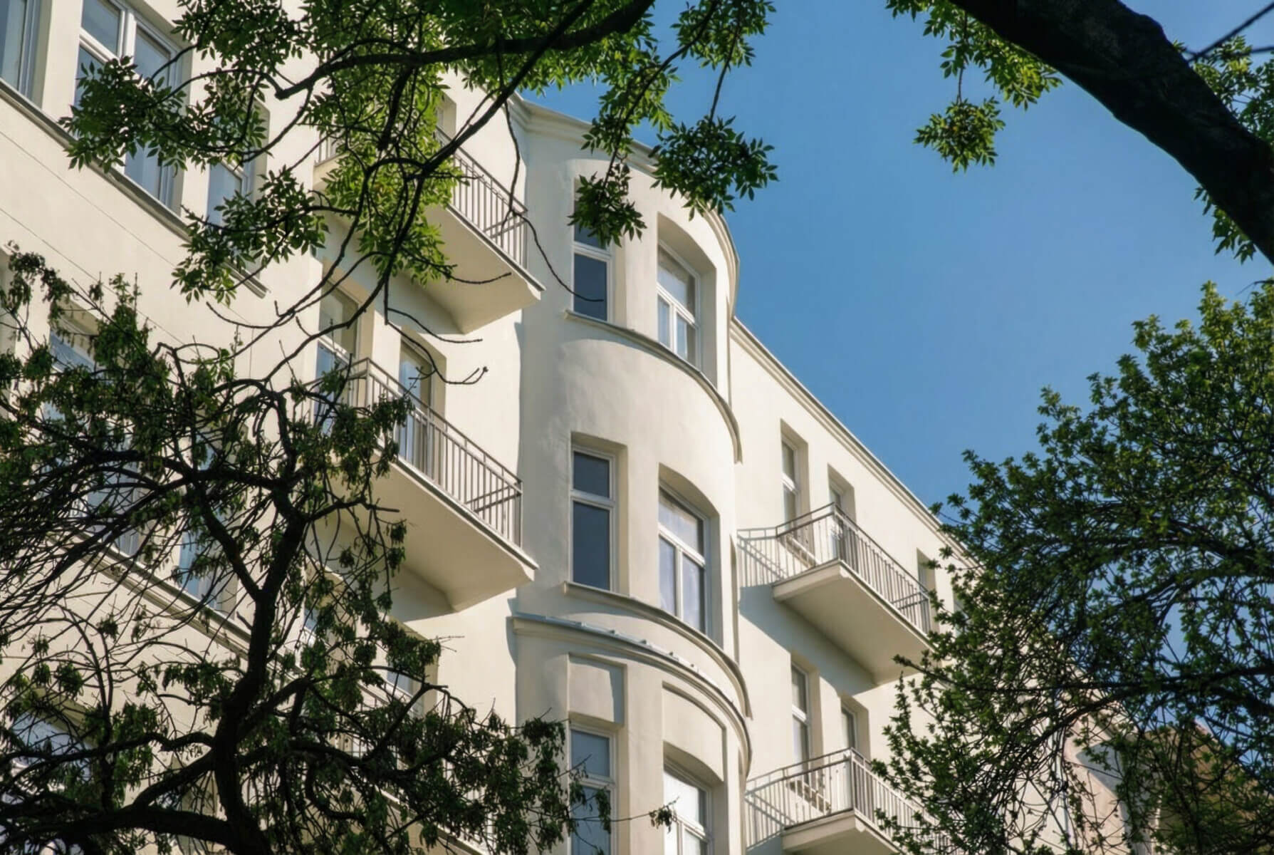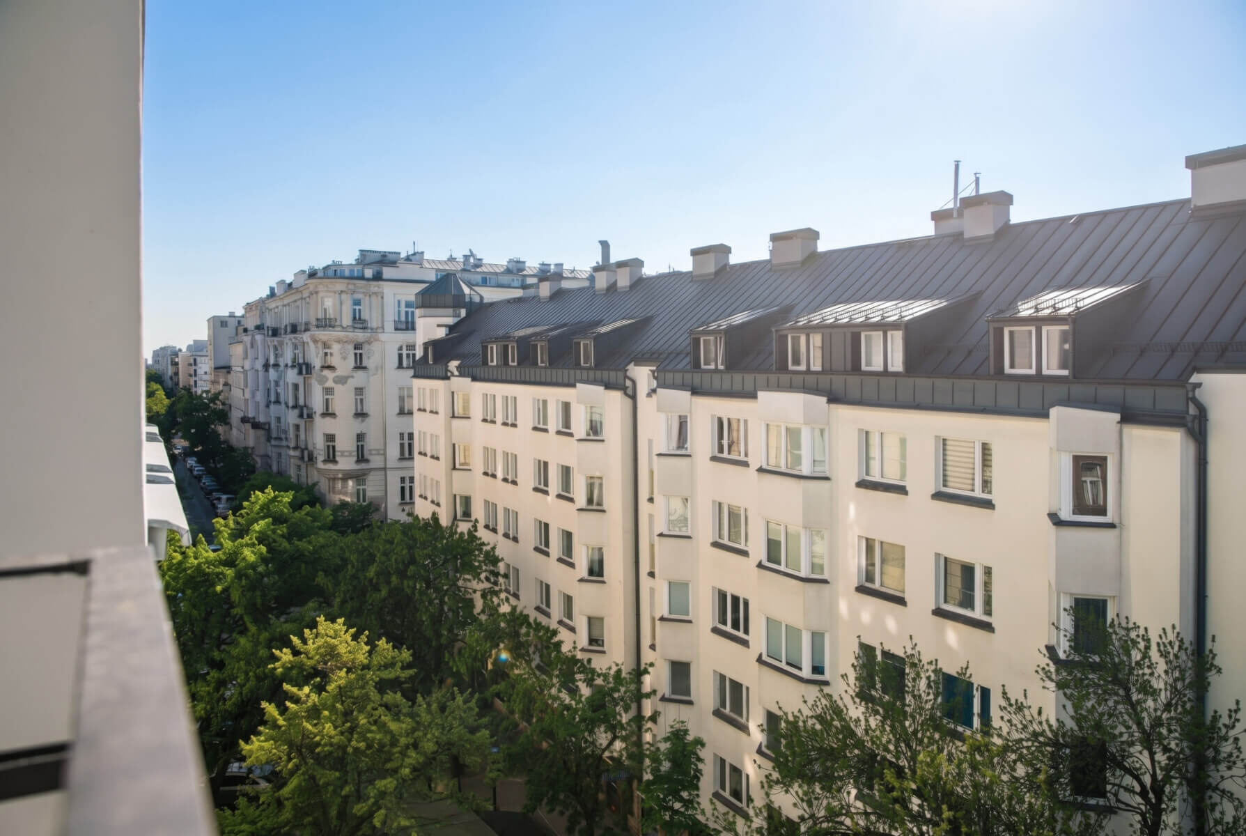 Front-facing, single-sided apartment overlooking a tree-lined street.