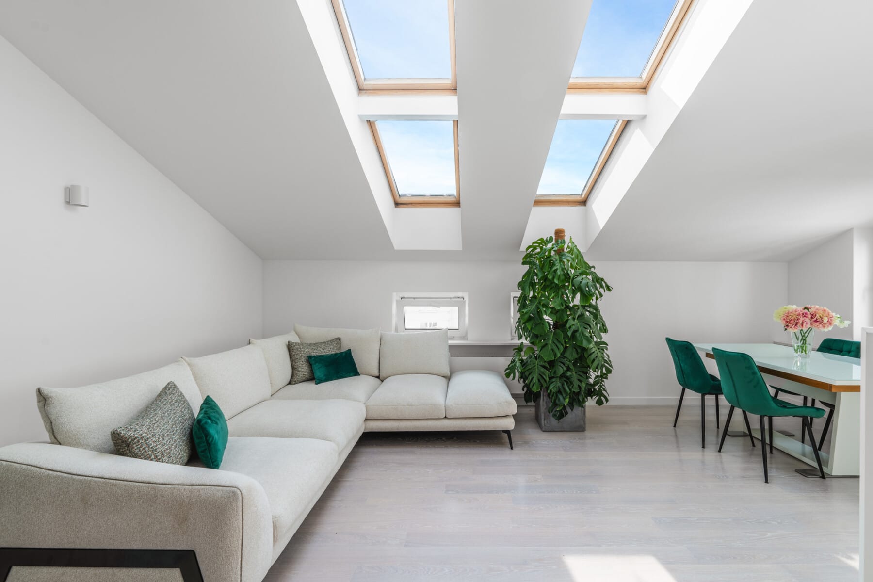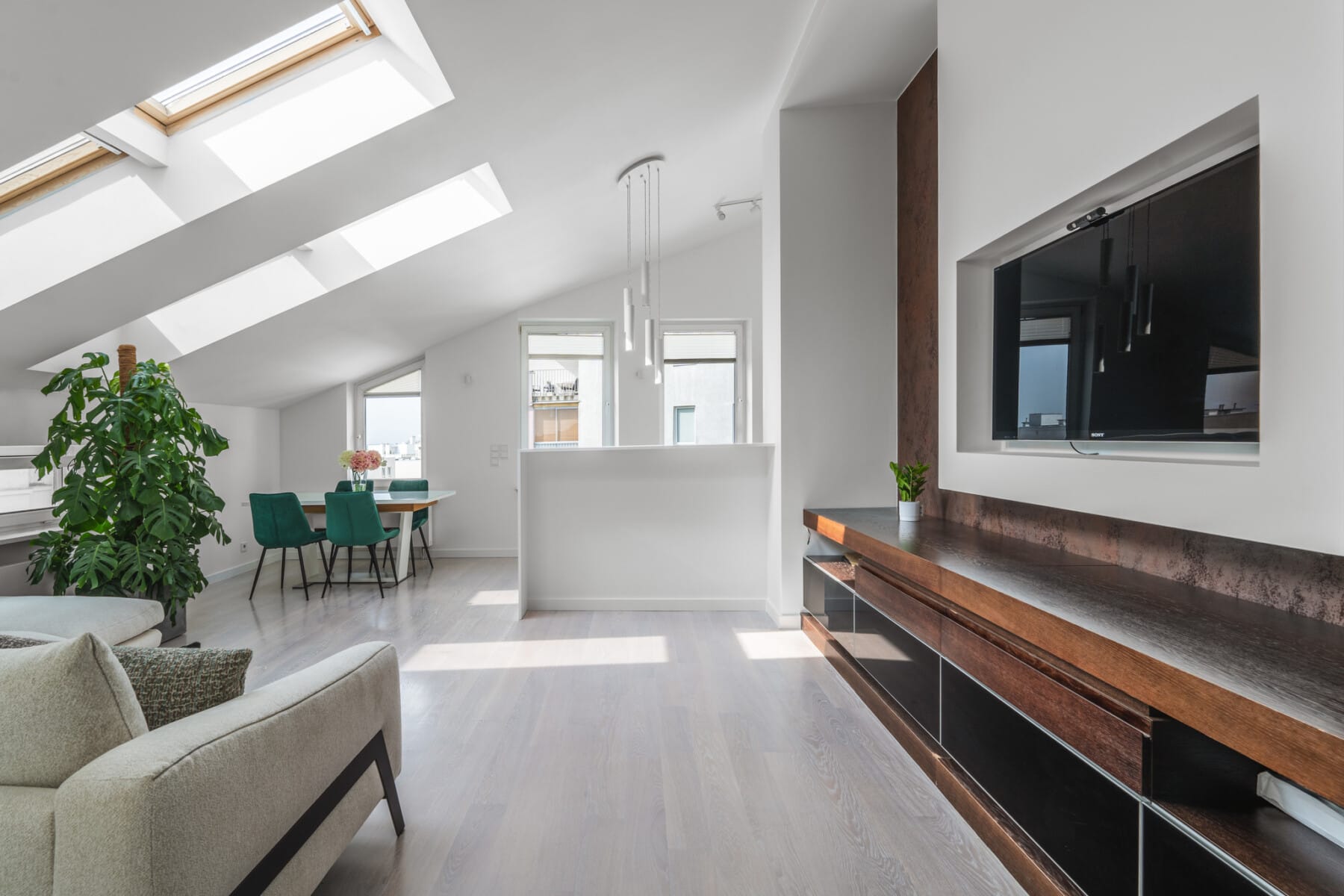 Spacious, bright living room: Large floor-to-ceiling windows allow ample natural light, which visually expands the space. The interiors are finished with top-quality materials, and the elegant design highlights the modern character of the apartment.