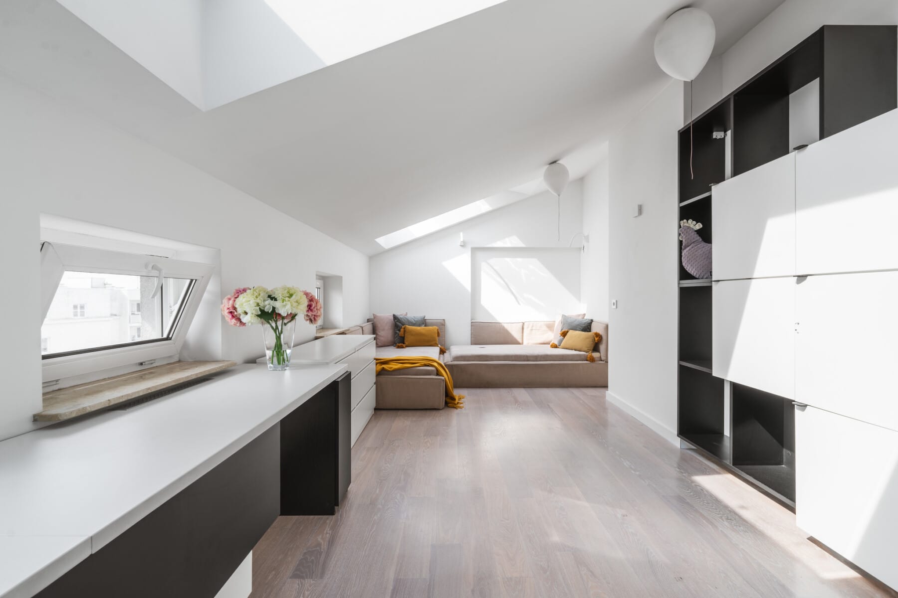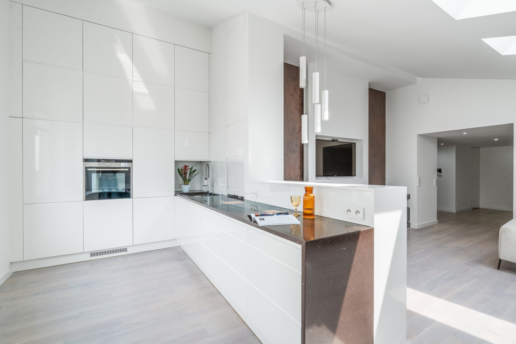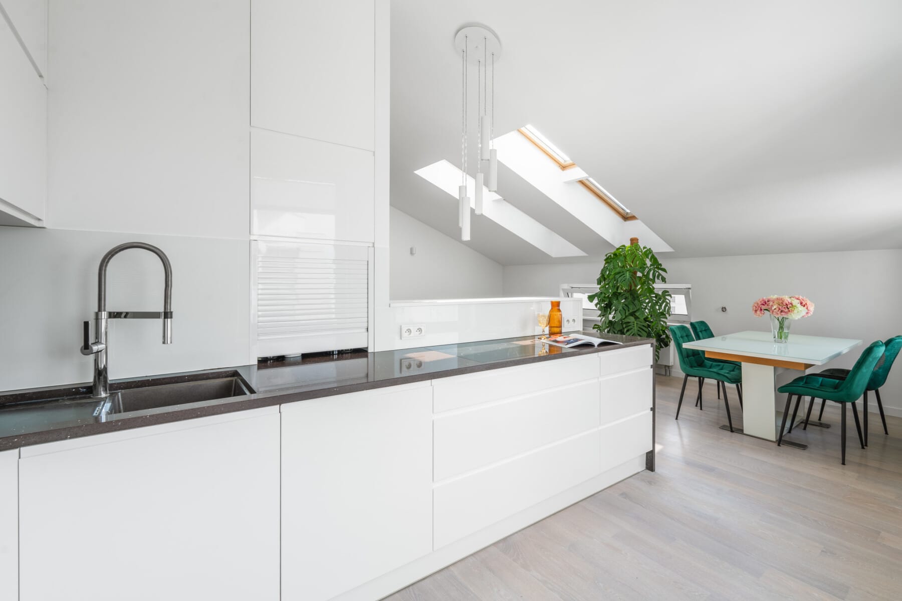 Open kitchen connected to the living room: Fully equipped with high-end household appliances, the kitchen seamlessly flows into the dining area. A large countertop and numerous cabinets provide comfort in everyday use.