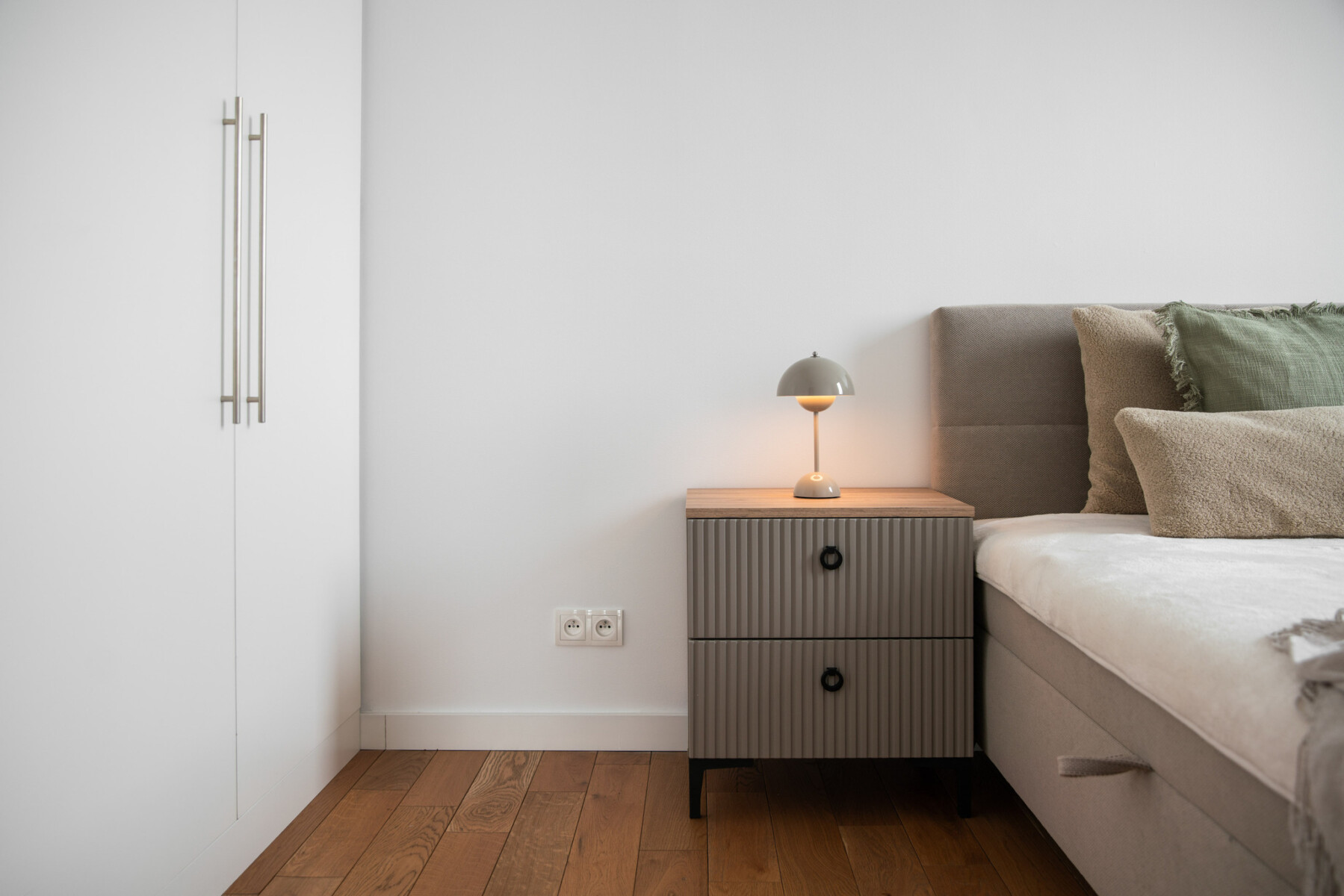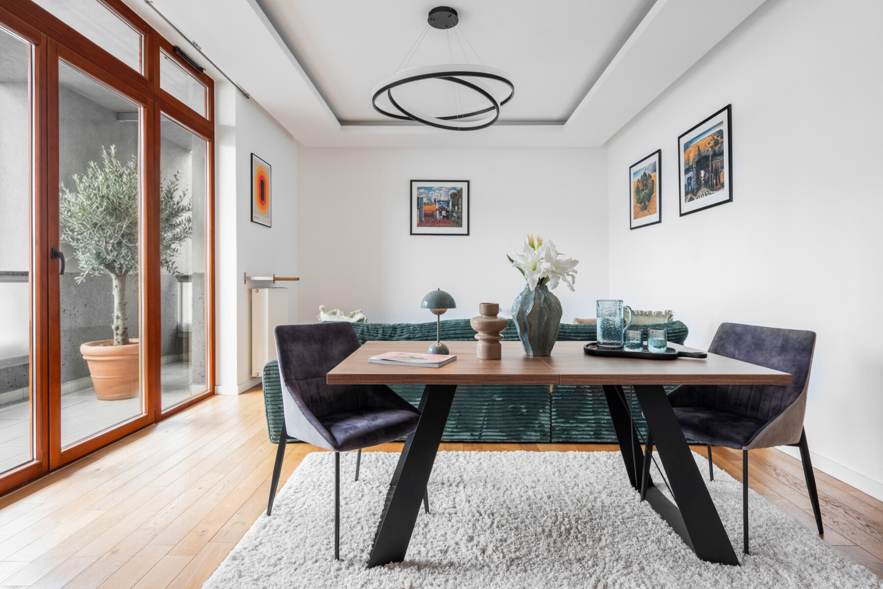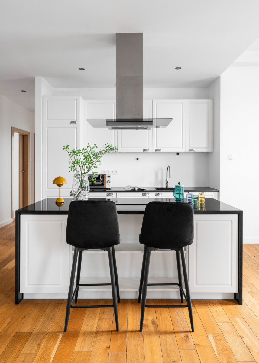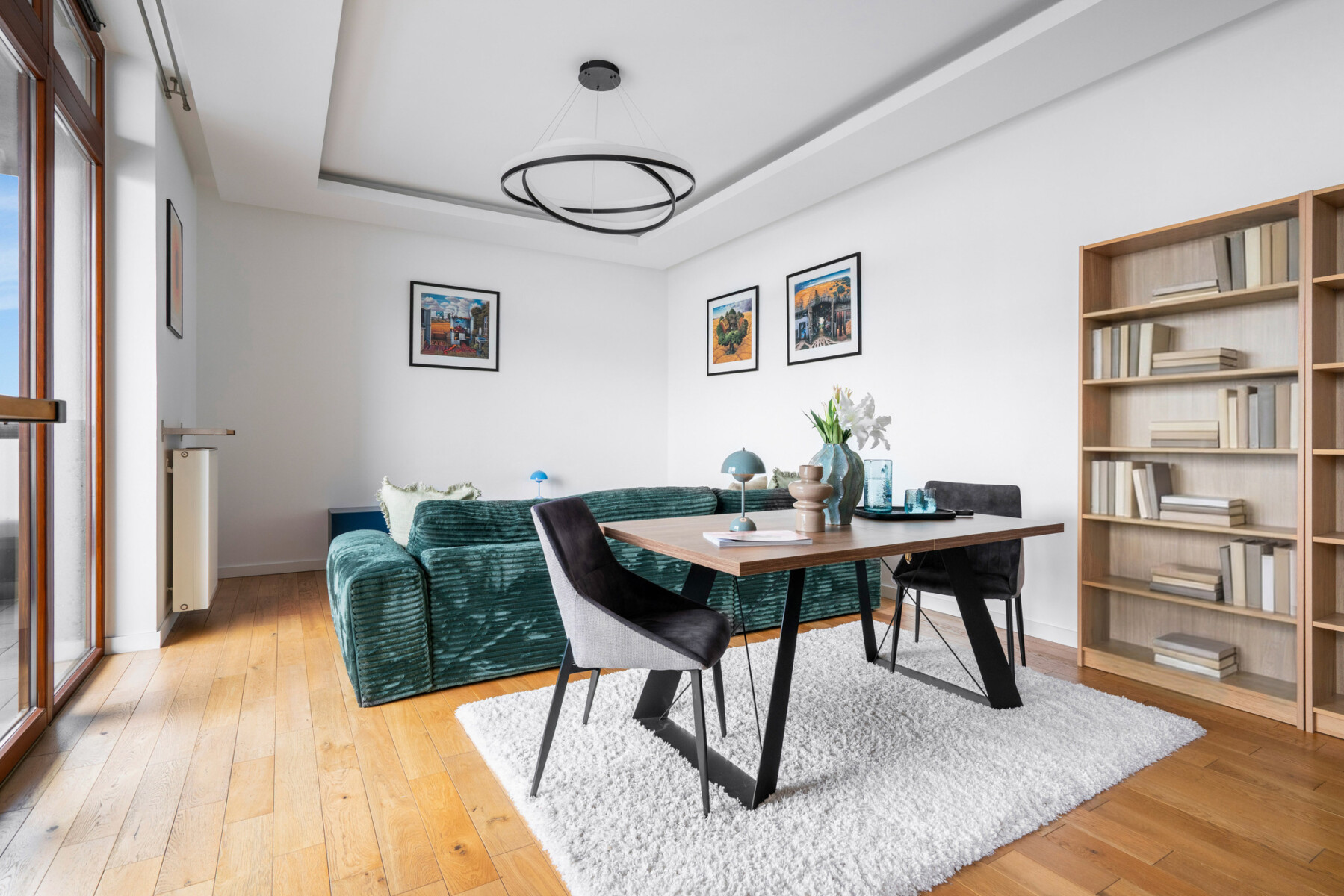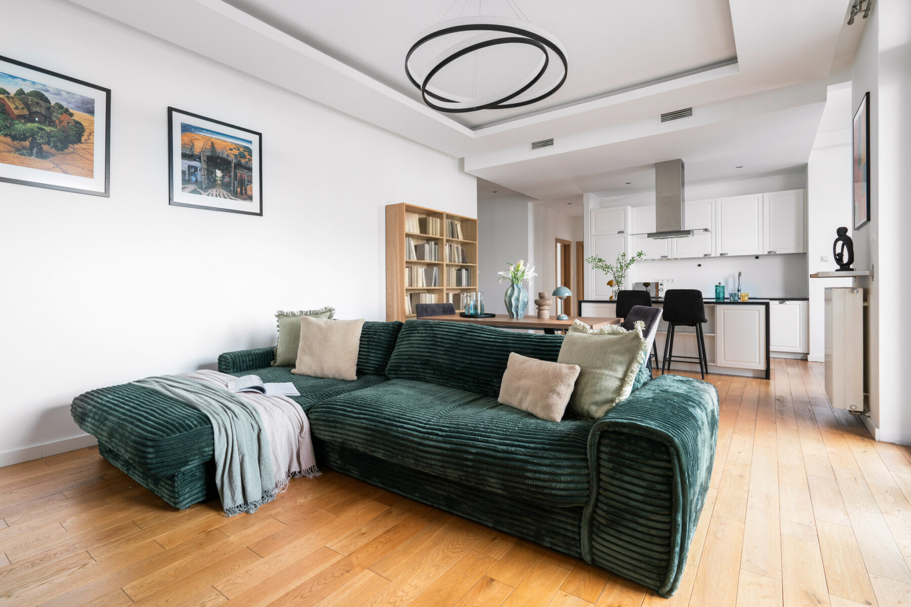 The functional layout of the 100 m2 apartment introduces a natural division into living and private areas.