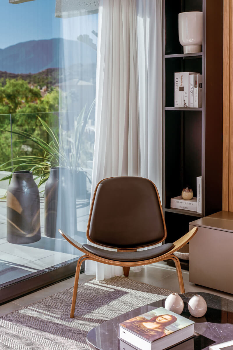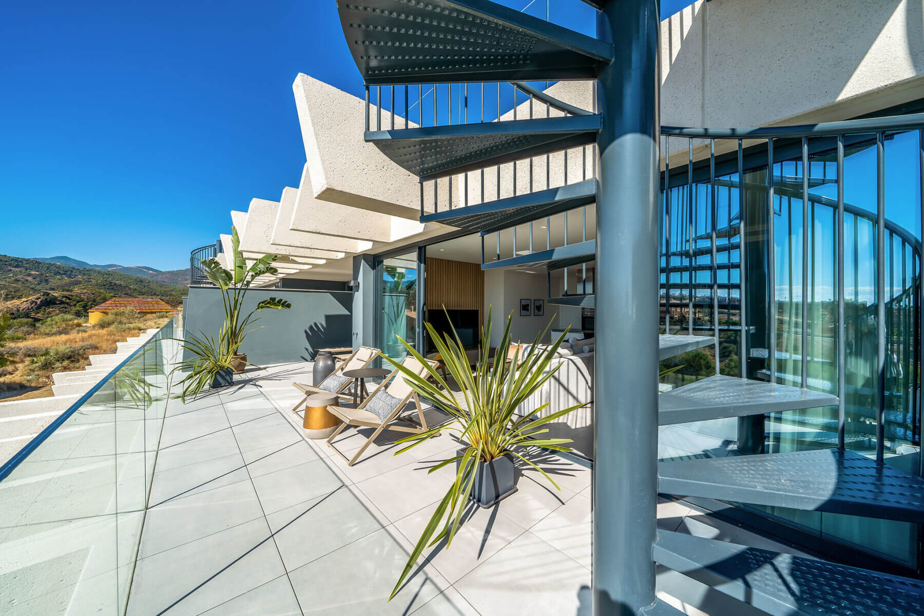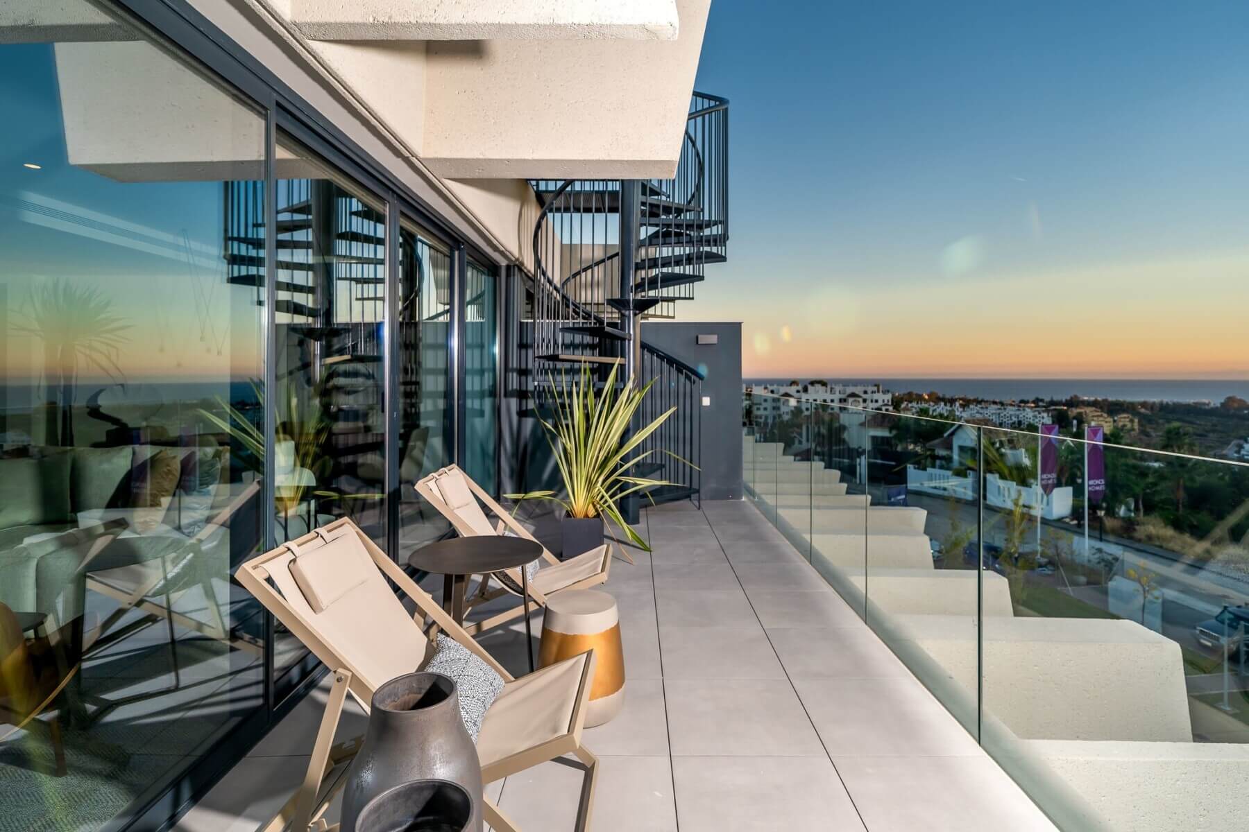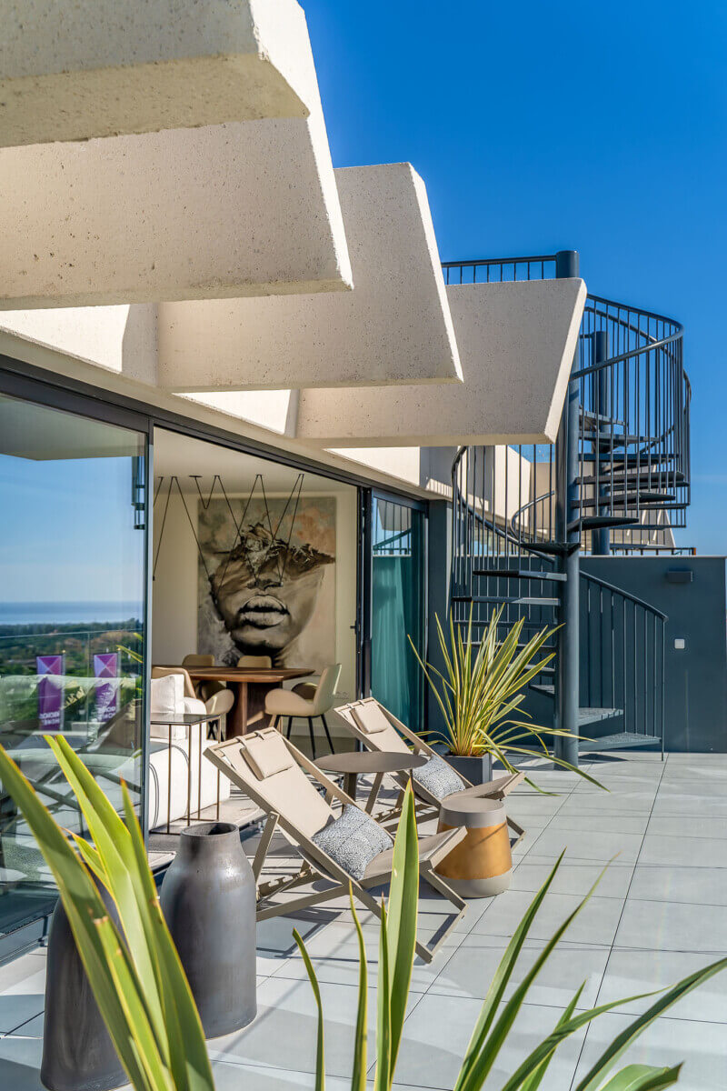 The penthouses in Osis 325 have a panoramic view of Estepona and the surrounding Selwo Natural Park. The glazed balustrades of the terraces and the solarium allow natural sunlight and lush vegetation to enter the interior, blurring the boundary between the outside and inside.