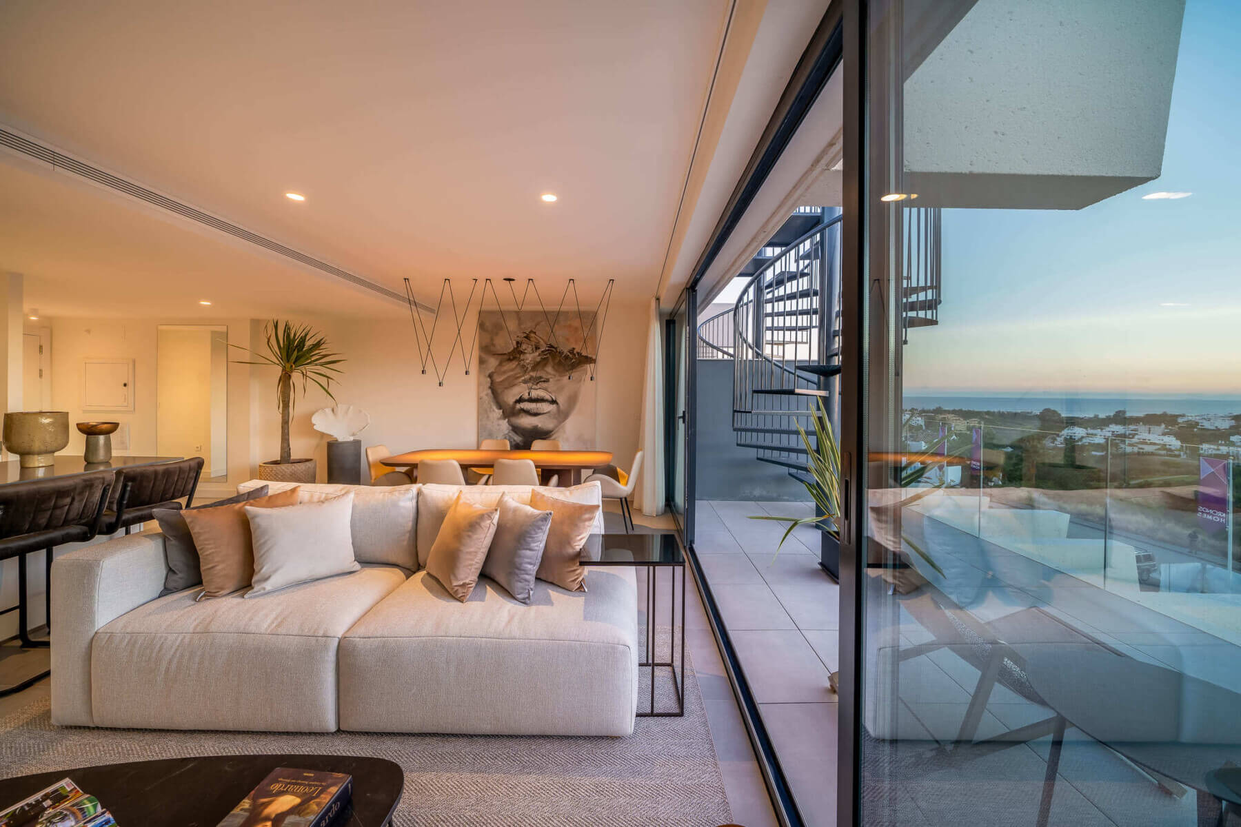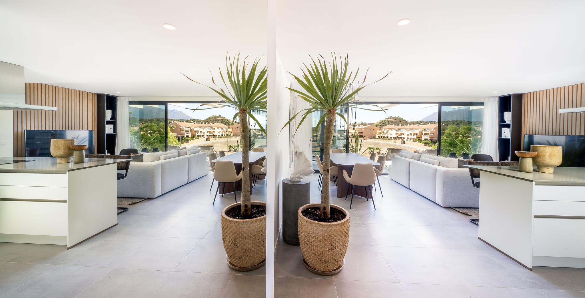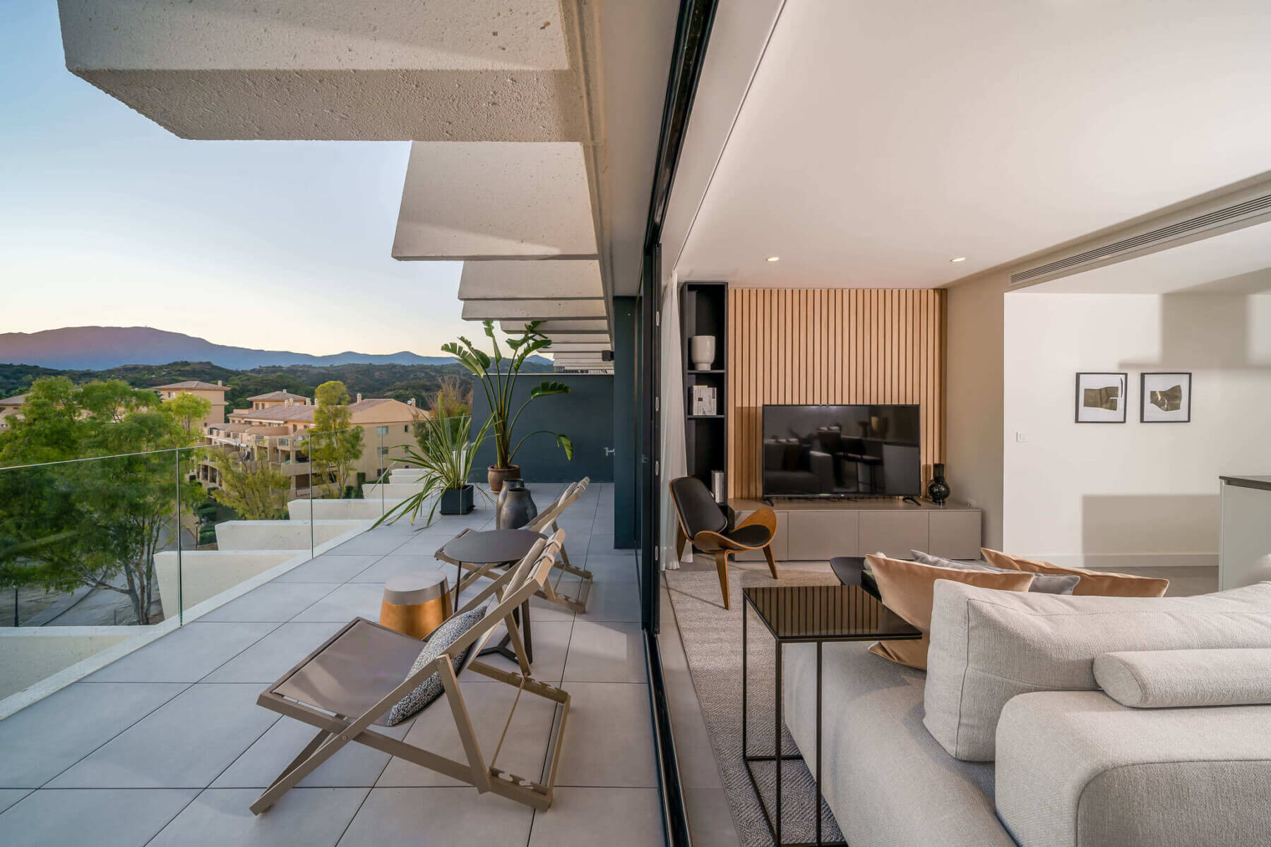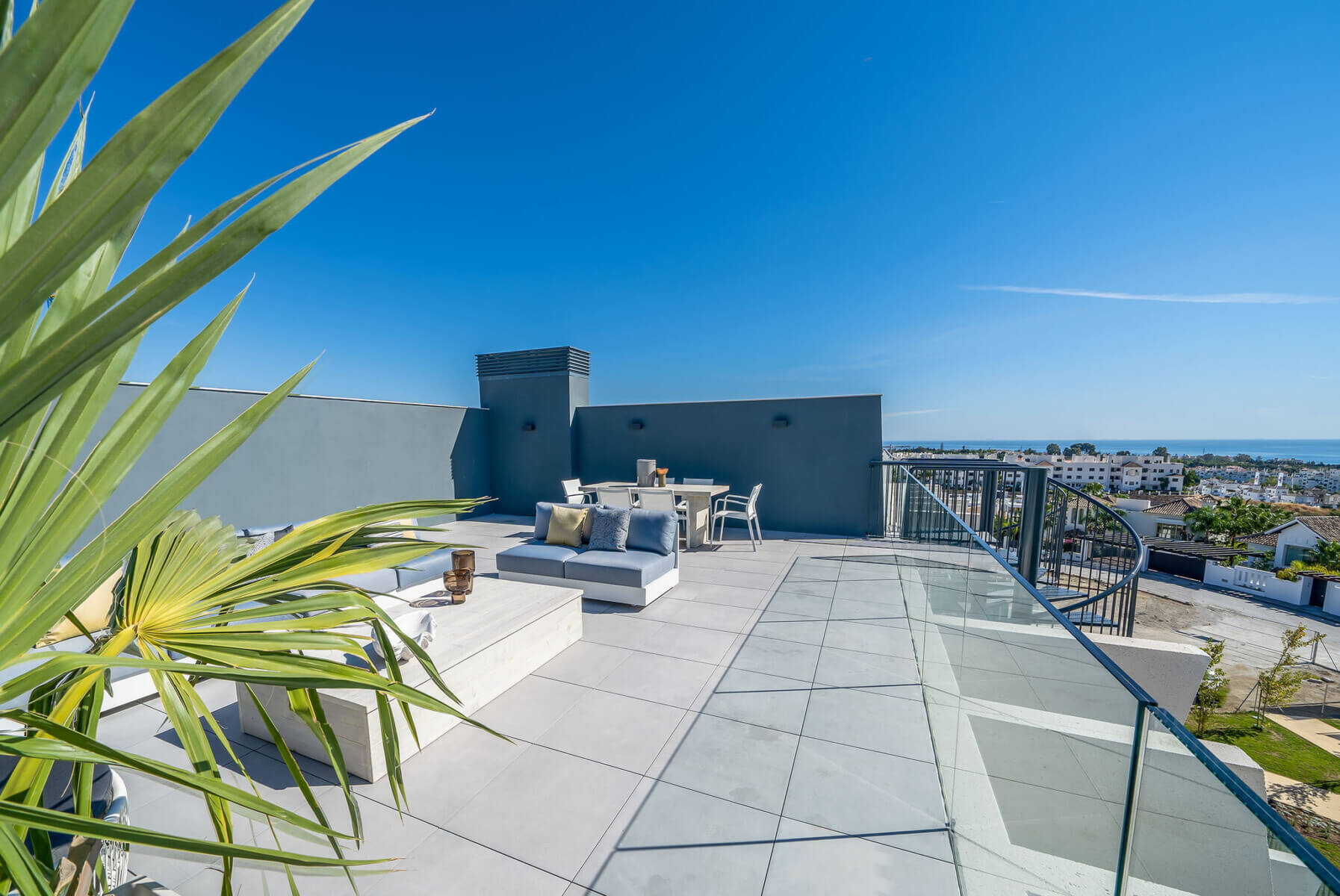 The penthouses in Osis 325 have a panoramic view of Estepona and the surrounding Selwo Natural Park. The glazed balustrades of the terraces and the solarium allow natural sunlight and lush vegetation to enter the interior, blurring the boundary between the outside and inside.