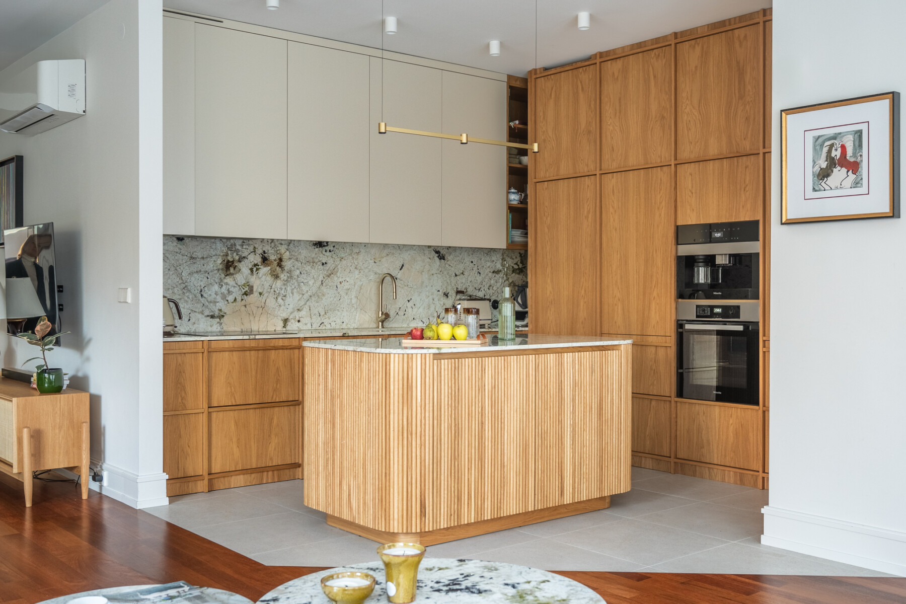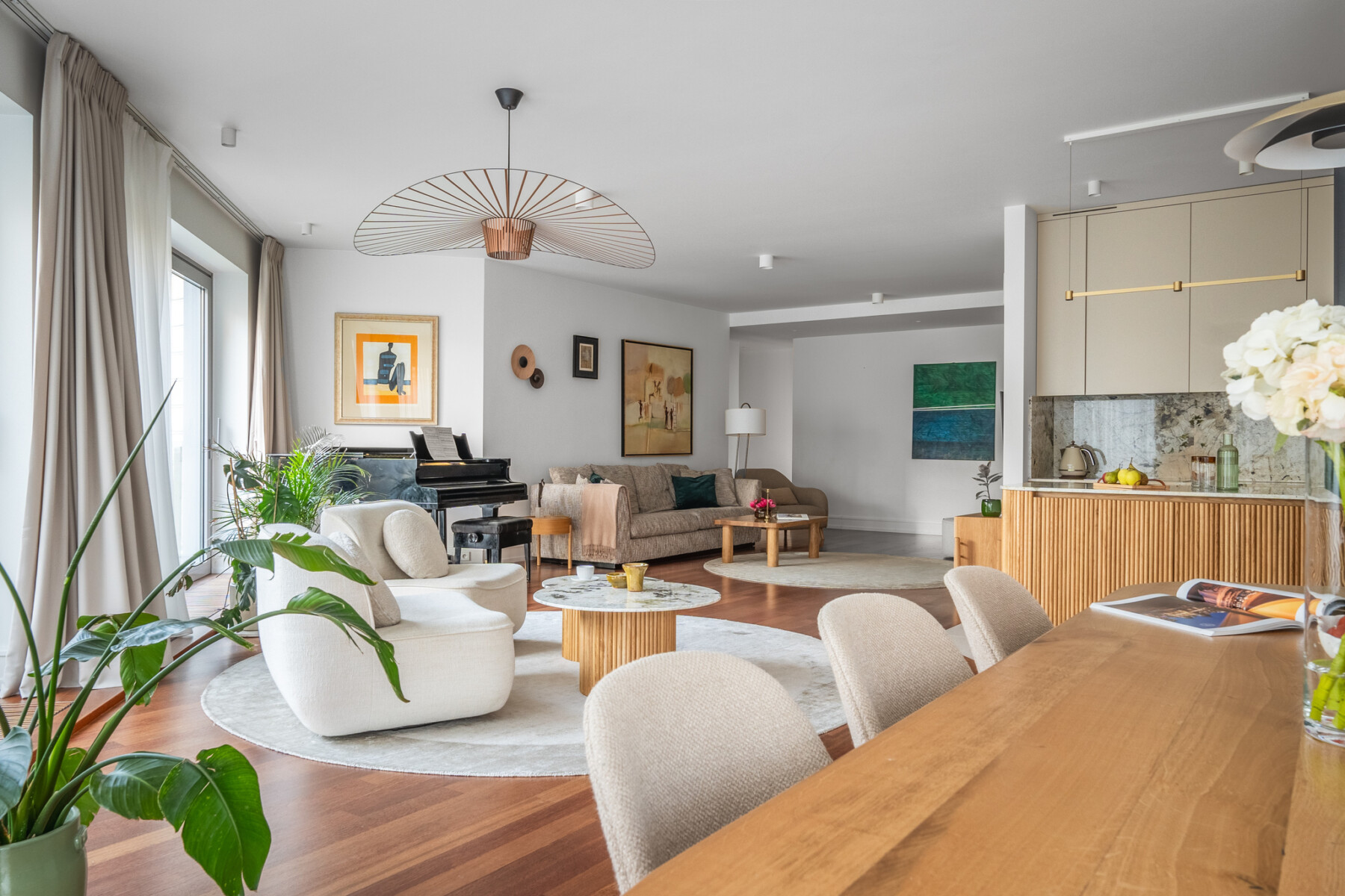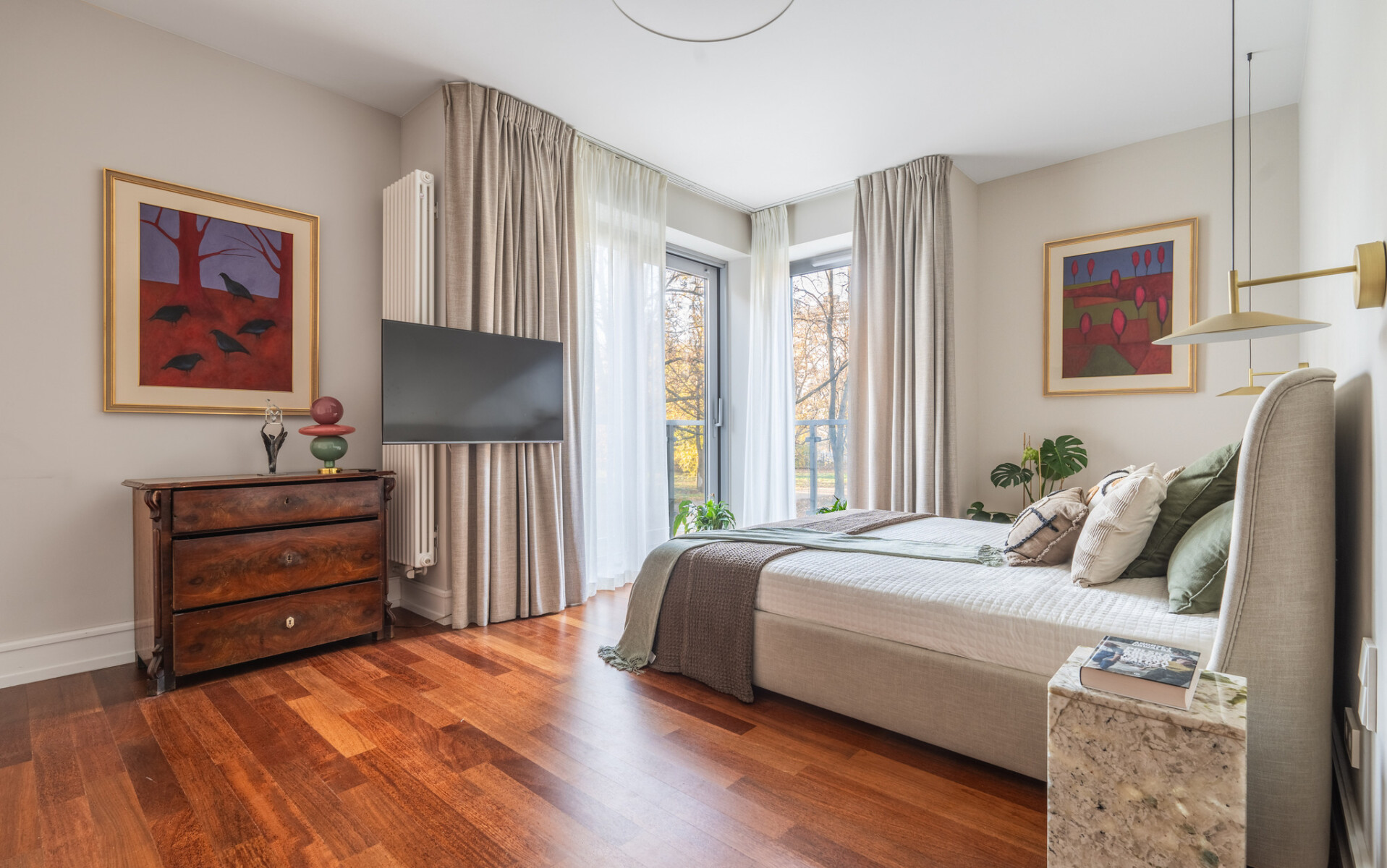 This elegant property in the Japandi style with a living area of over 65 m2 will delight anyone who likes spacious and atmospheric interiors, and the panoramic windows and view of the park will soothe after a day full of impressions.