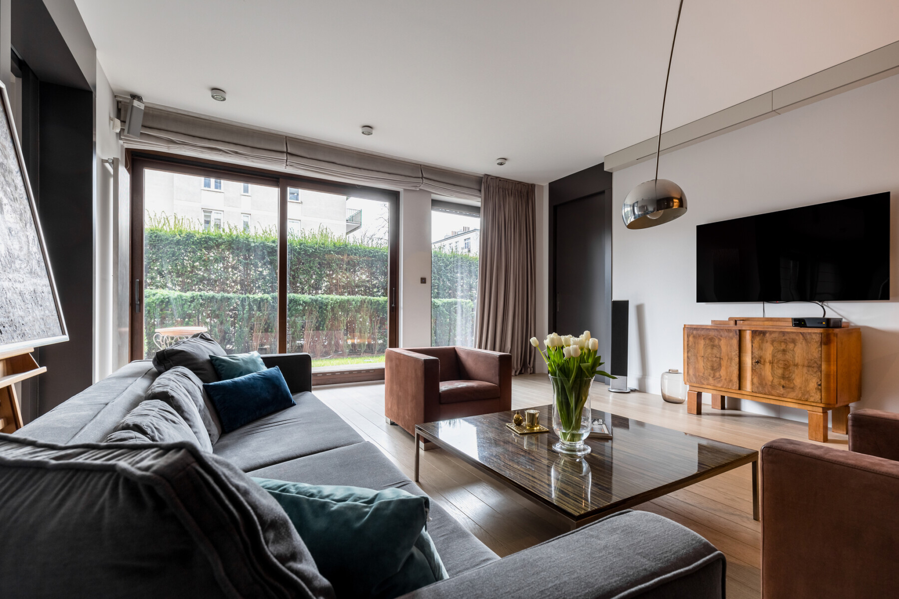 – a second living room with a large dining room connected to a functional kitchen equipped with Gaggenau appliances with access to the intimate garden,