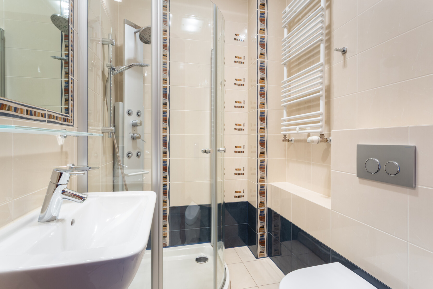 The apartment is located on the third floor of a four-story building with an elevator. The building is distinguished by its high quality of finish – spacious, elegant staircases are lined with natural stone, and the building’s facade is decorated with sandstone slabs. The underground garage does not have platforms, which ensures convenient and safe parking.