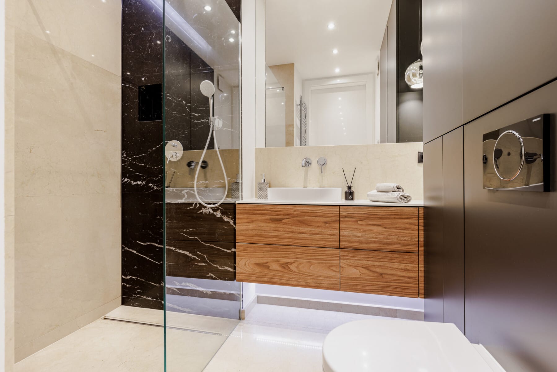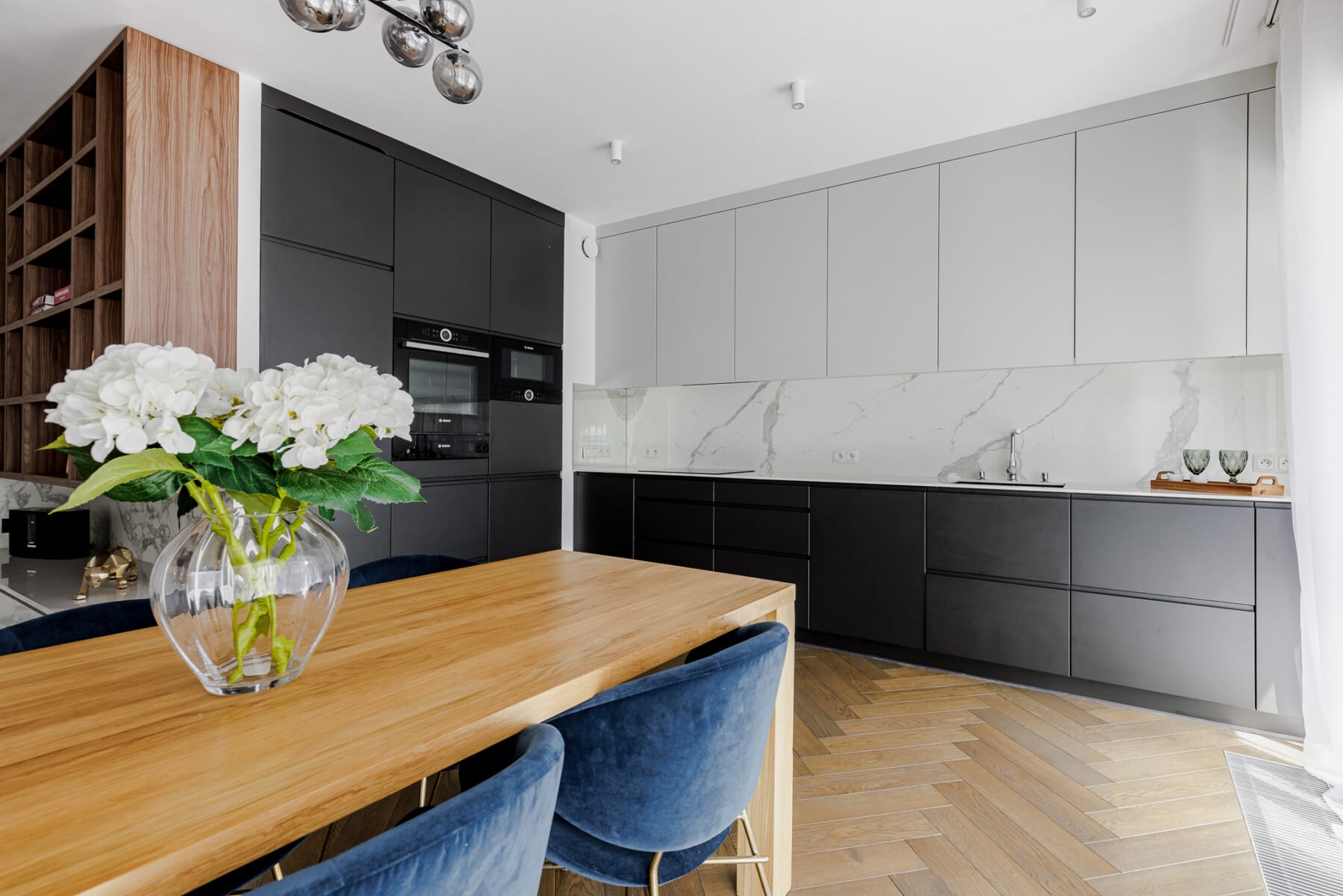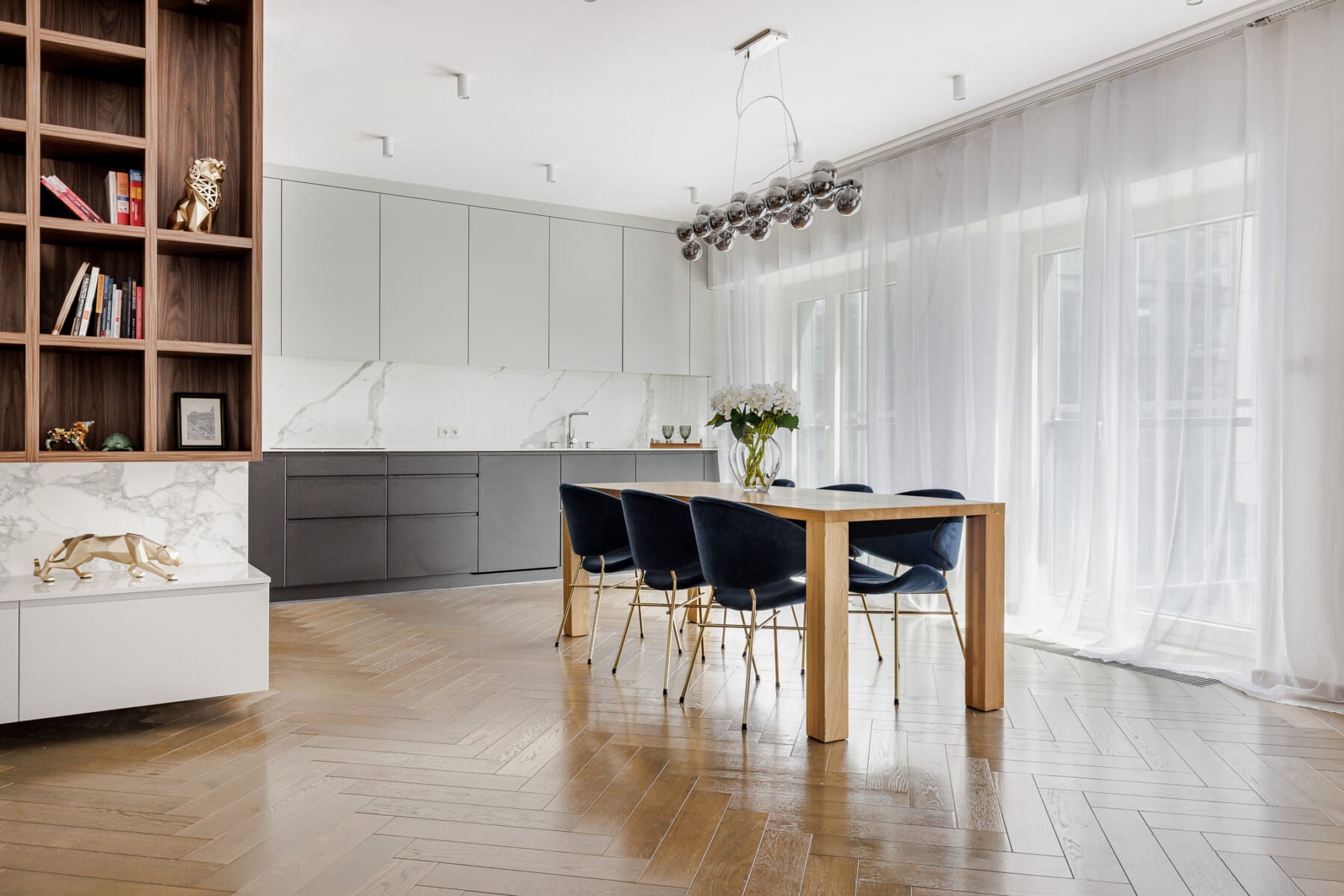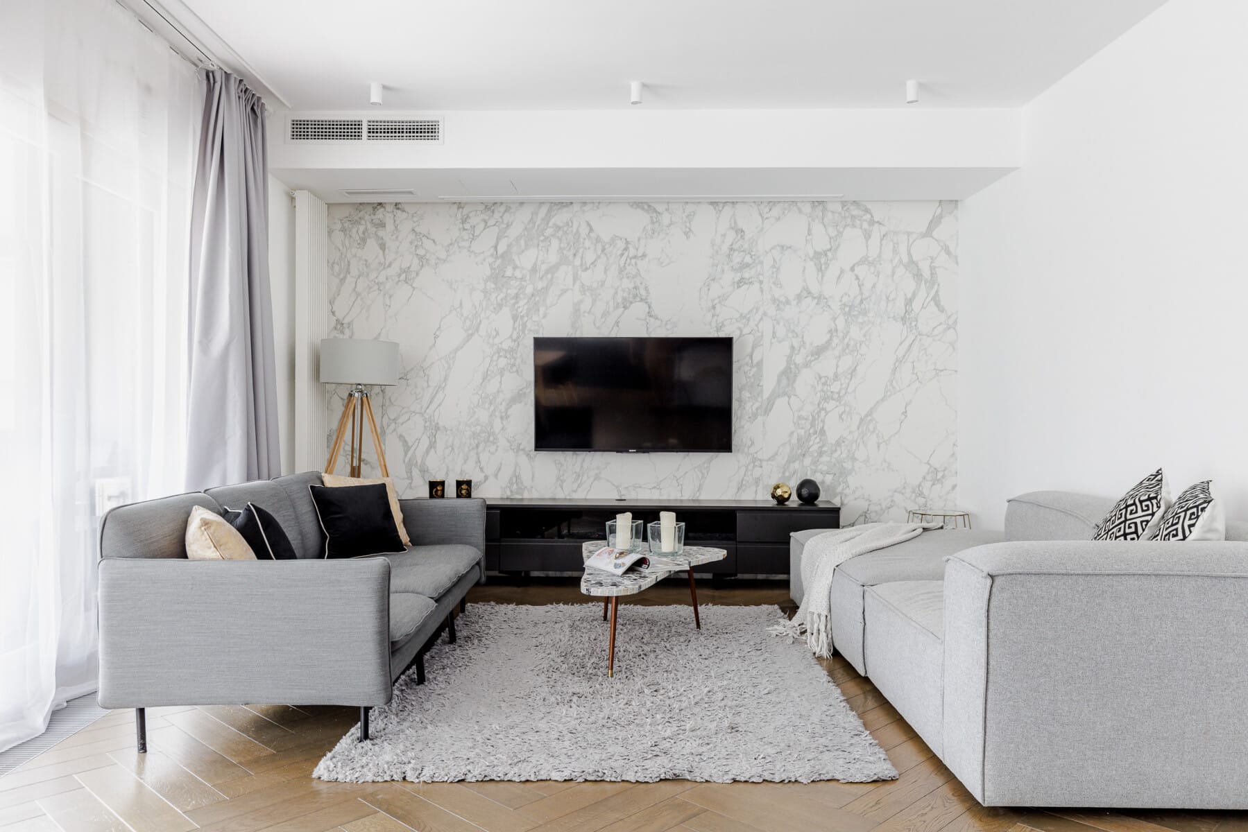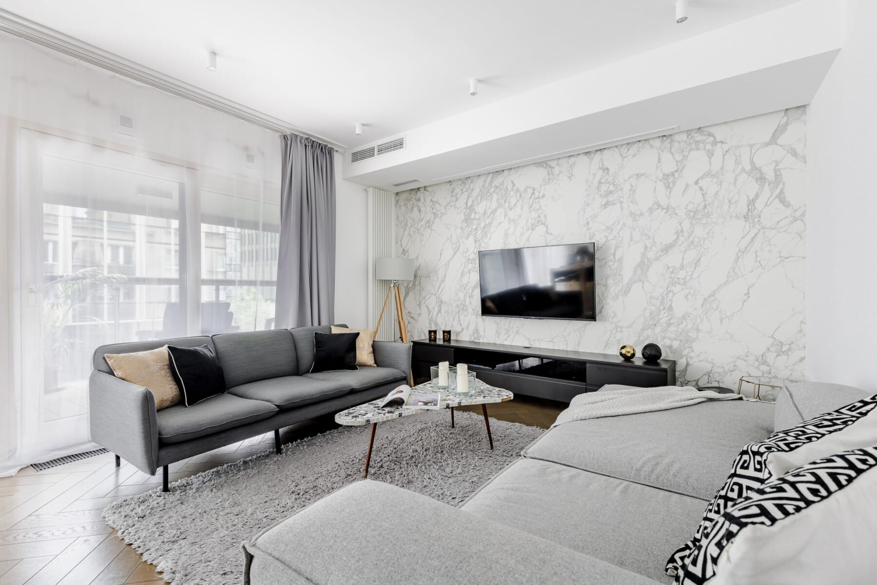 Apartment with the highest quality finishing. The modern and elegant interior includes, among others: selected marble, oak parquet floor, air conditioning, underfloor heating, effective room lighting, built-in screen and sound system for home cinema and a smart home system. The comfortable living area is separated from the private area, which guarantees the functionality of the interior and the comfort of the residents.