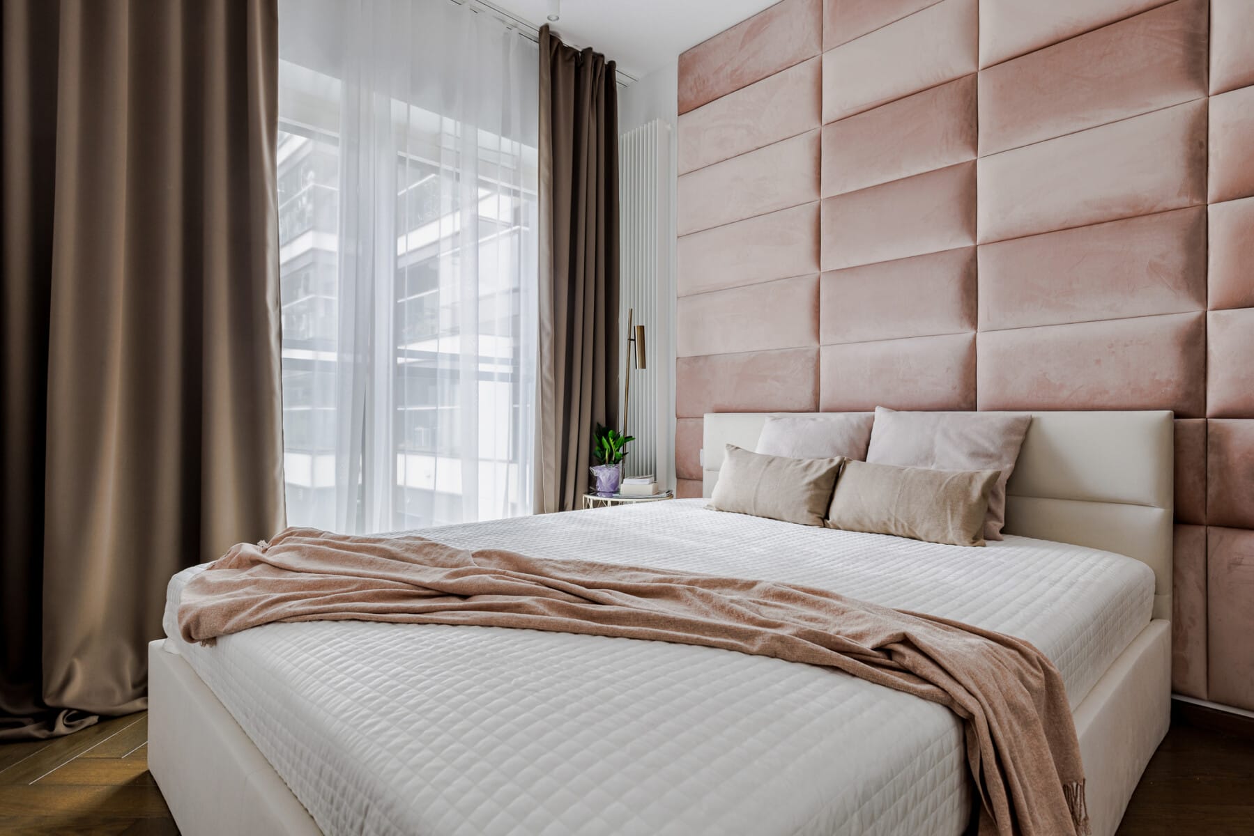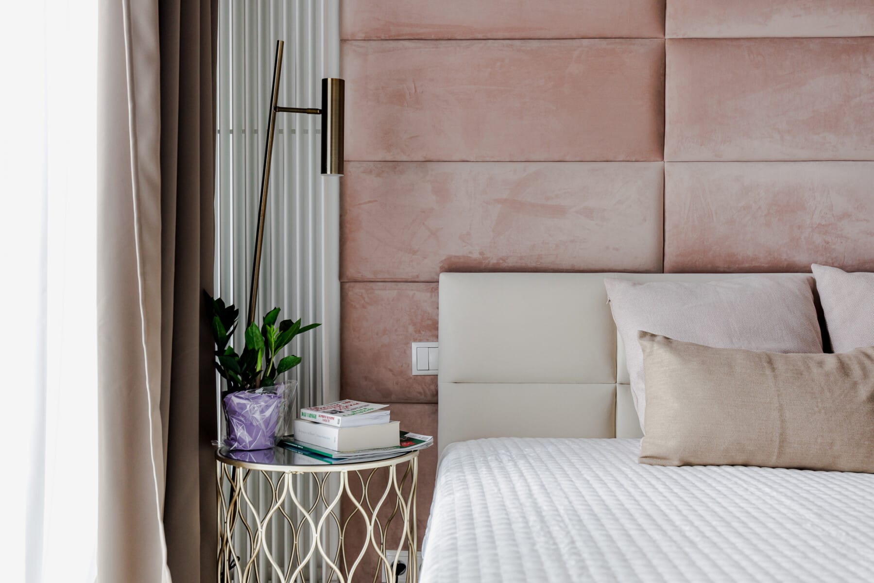 – a bright master bedroom with a beautiful, upholstered bedhead, a wardrobe and a bathroom with a bathtub;