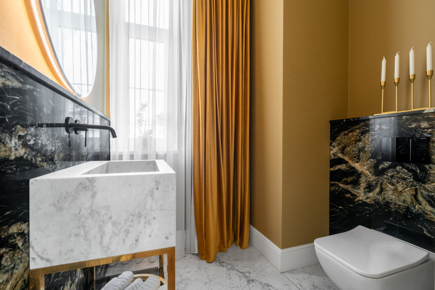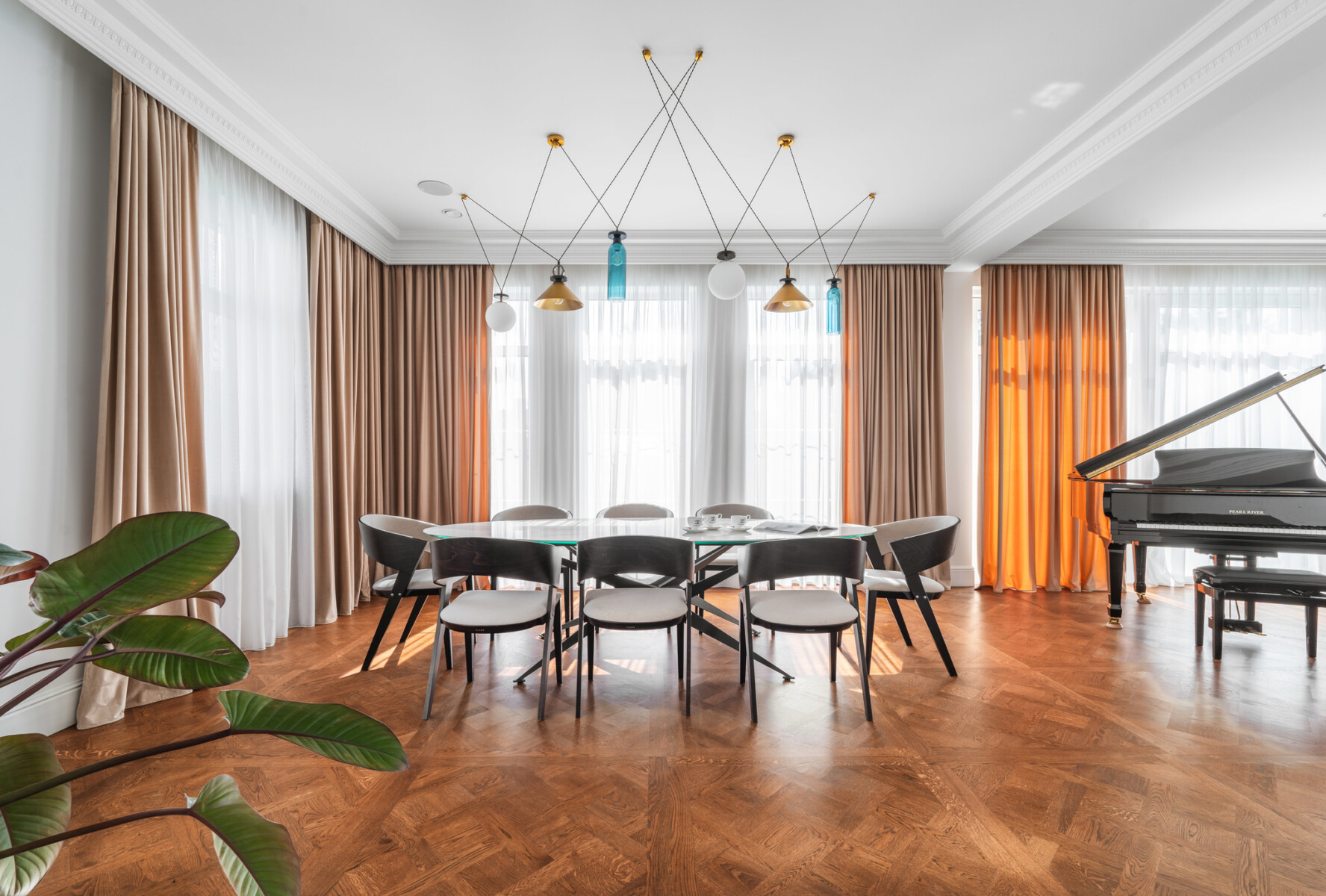 Particular attention should be paid to the design of the corridor. This space welcomes residents and guests entering from the outside, while connecting the living room with the dining room. Polish artists and art conservators working in Milan, unmatched in techniques such as fresco or sgraffito, created a unique wall decoration here. The work took several weeks. The wall surface was first protected with many layers of bolus clay, and then hand-coated with Florentine 24-carat gold leaf. Finally, a cherry blossom motif was painted on it – an effective and at the same time harmonious element with a very classic interior character. The effect was complemented by specially designed marble stairs, a brass balustrade and double doors welcoming residents and guests.
