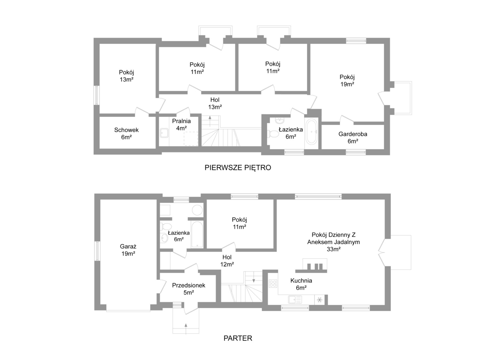 The ground floor comprises a spacious living area with an open-plan living room, kitchen and dining area. Large windows with exposure to three sides of the world open the interior to the garden and provide views of the escarpment and Wilanów. The living room features a fireplace finished with original marble. This level also includes an additional bedroom or study, a bathroom, a spacious entrance hall, a pantry and a garage integrated into the building. The kitchen is bright, with a west-facing window overlooking the entrance to the property.