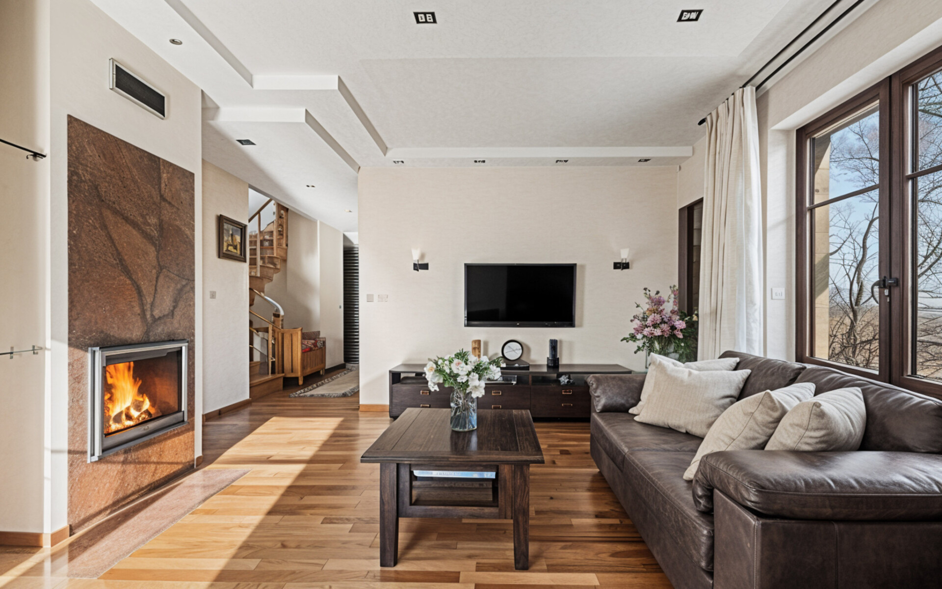 The upper floor consists of four bedrooms and two bathrooms. The interiors stand out for their coherent use of materials, including natural stone applied in the bathrooms, kitchen and around the fireplace.