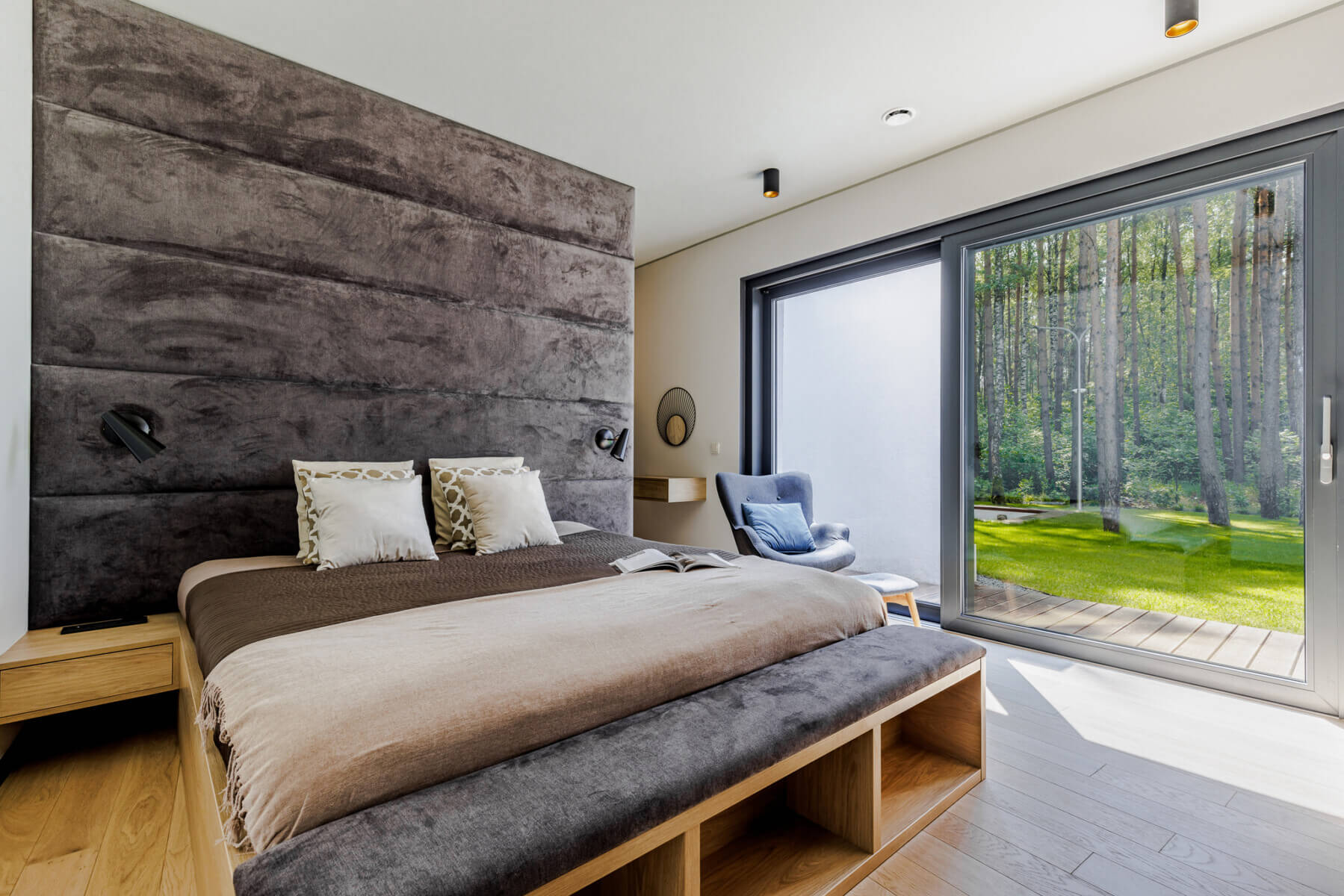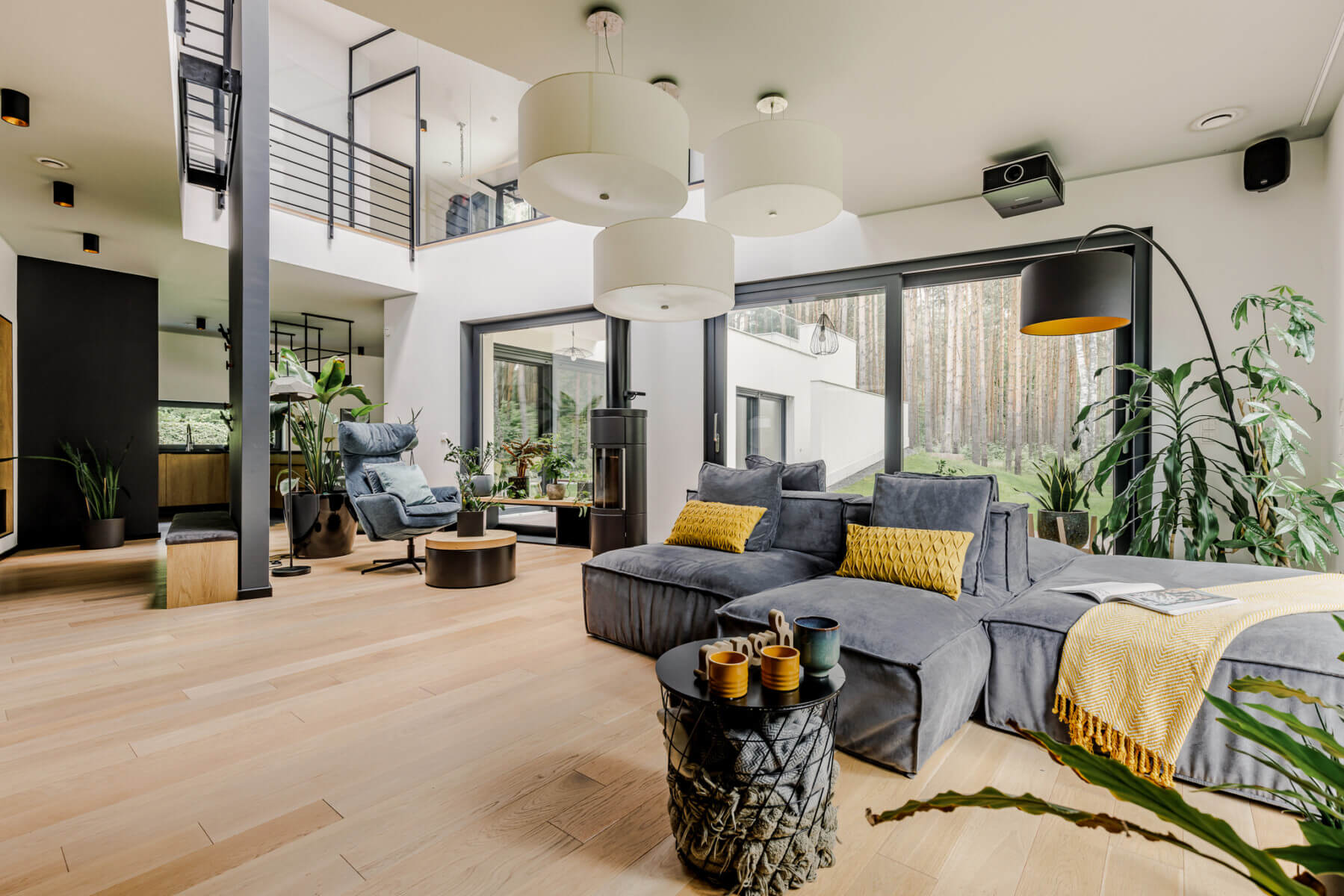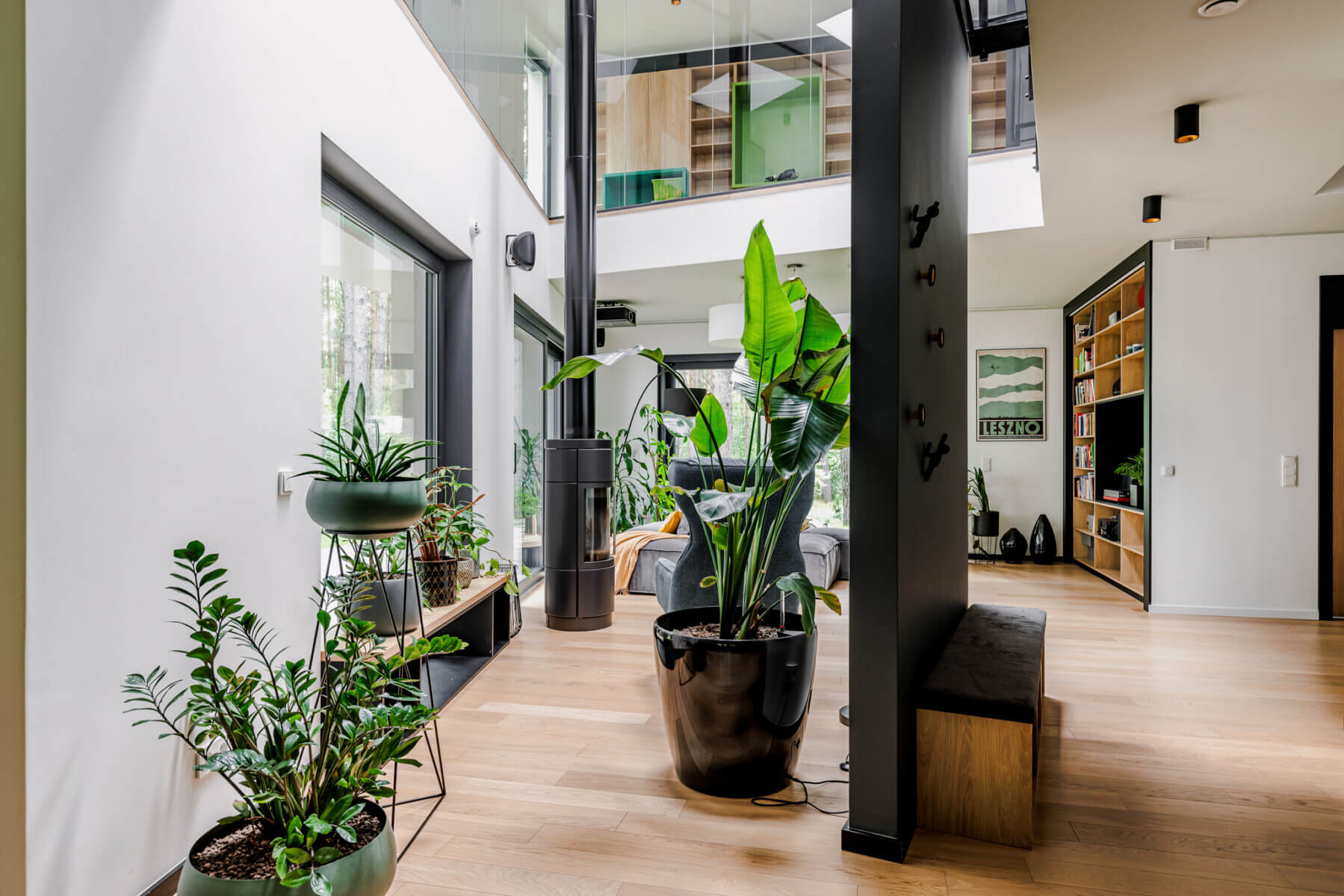 – a spacious, 6 m high living room with a separate TV zone equipped with a projector and an automatically retractable screen and a relaxation zone with a view of the beautiful garden and forest