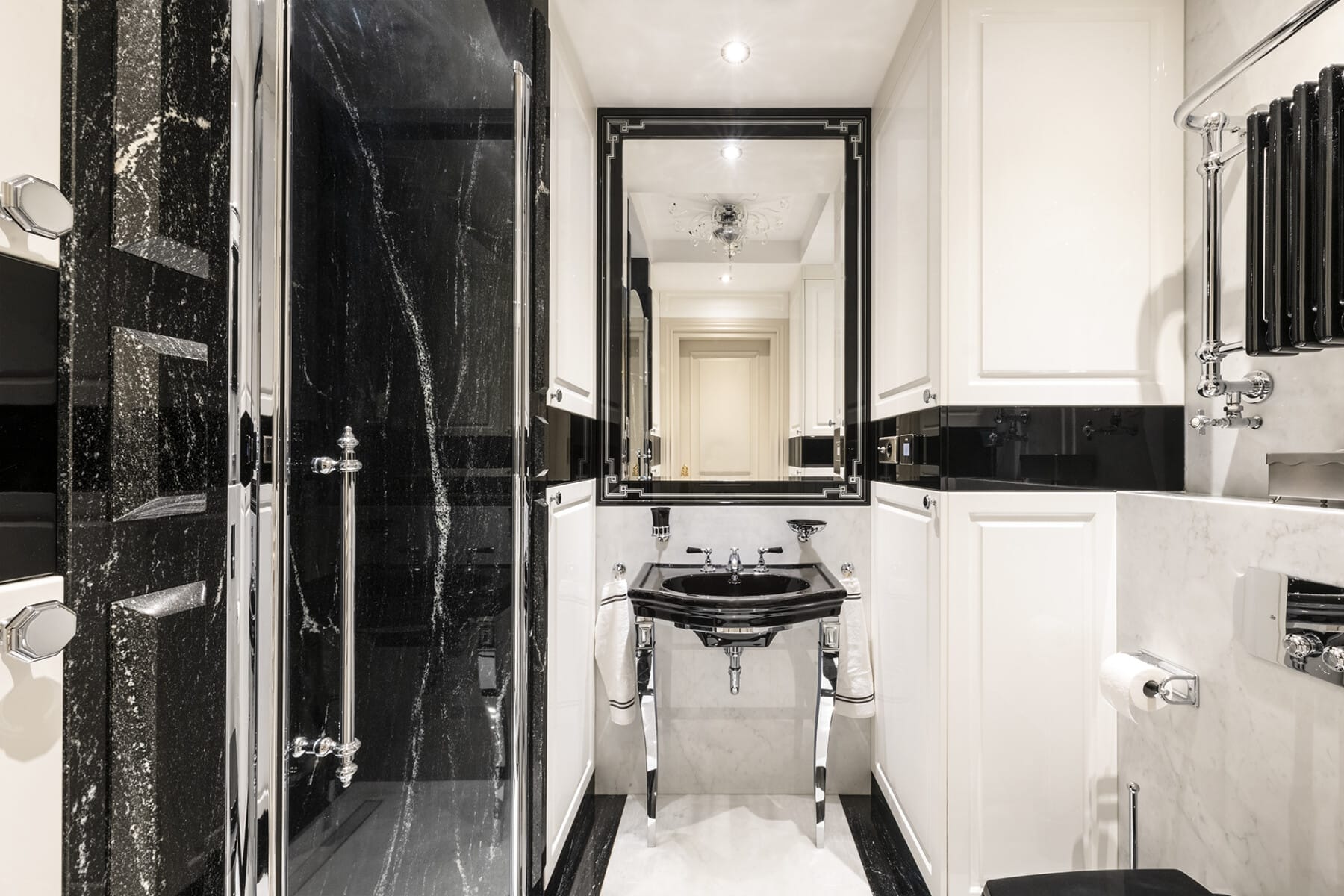 – Łazienki: dwie łazienki wykończone marmurami (z wyczerpanych już złóżCarrara Michael Angelo, Rosso Portugal, Emperador), wyposażone w stylowe elementy firm Devon & Devon, Lefroy Brooks; kabiny prysznicowe włoskiej firmy Box Doccia , w salonie kąpielowym wolnostojąca wanna Devon & Devon oraz ozdobne grzejniki. Komfort zapewnia elektronicznie sterowane ogrzewanie podłogowe. Jedna łazienka, przy sypialni master z wejściem z sypialni, to w zasadzie przestronny ponad 20 metrowy salon kąpielowy z oknem.