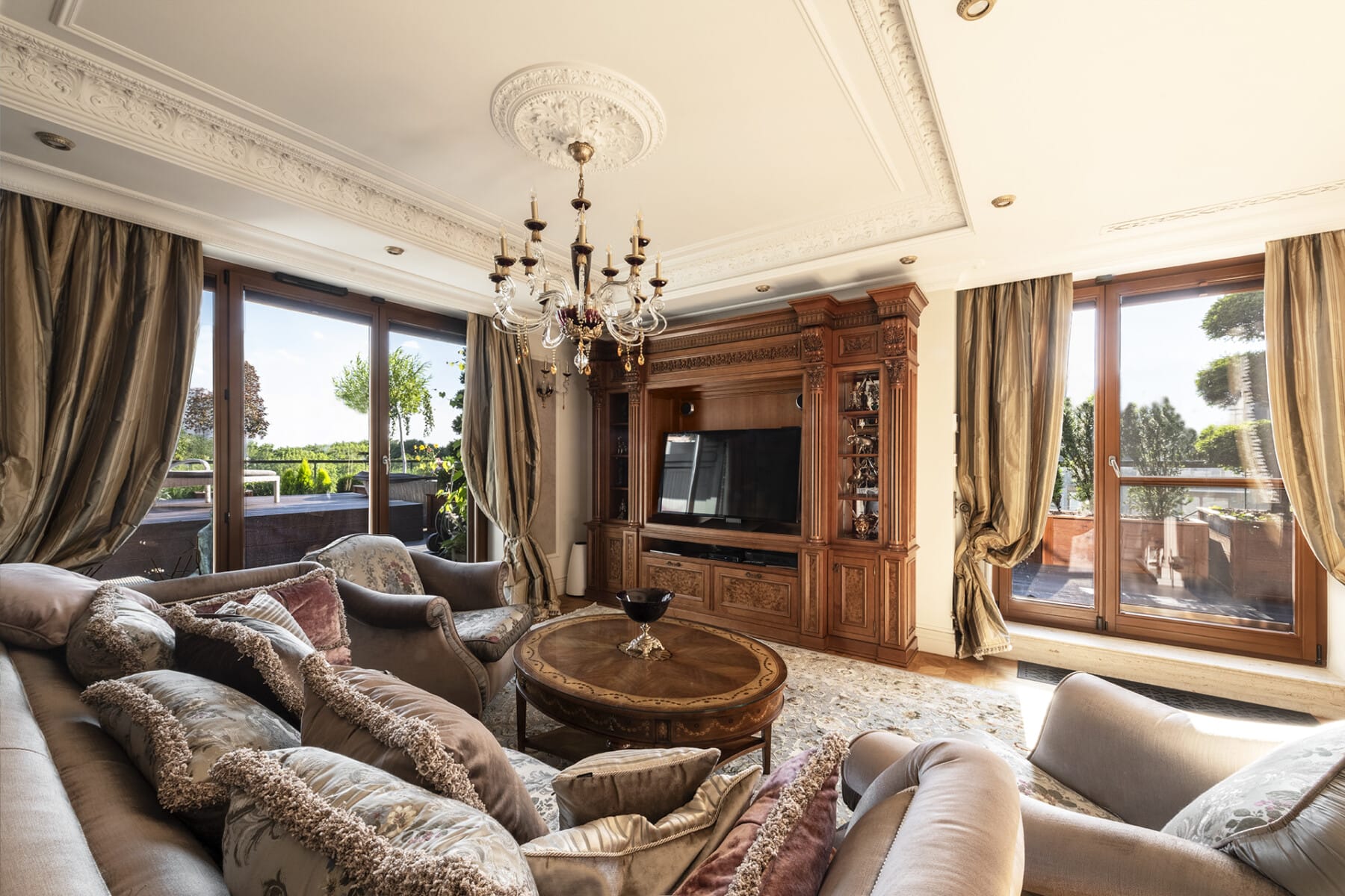 – Salon: wyposażony w system drewnianej zabudowy TV z orzecha, zestaw wypoczynkowy renomowanej włoskiej marki EPOQUE by FURSTENBERG oraz biokominek z marmuru Crema marfil. W salonie zainstalowano system kina domowego Bang & Olufsen, wraz z telewizorem Bang & Olufsen Avant 55.