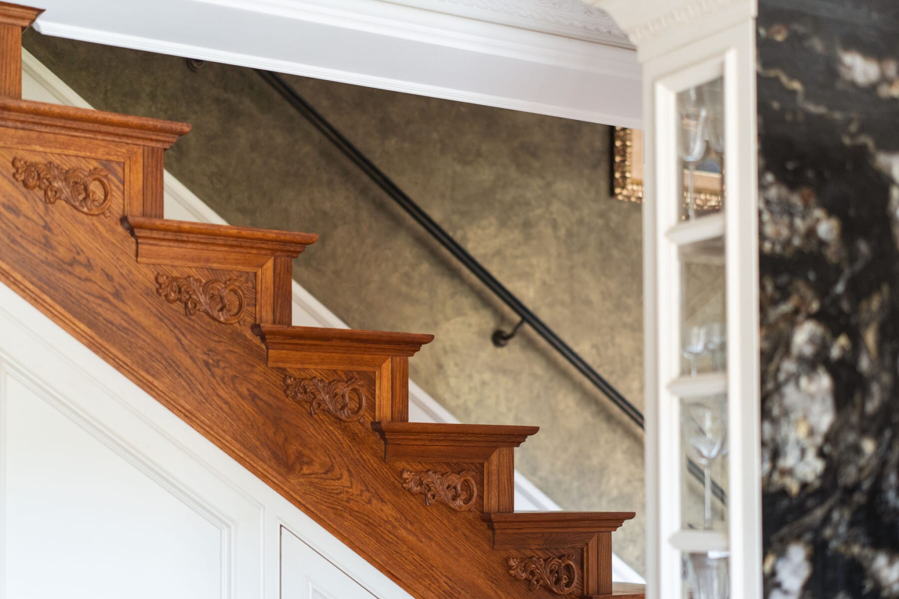 – Gabinet: elegancko urządzony z dębową zabudową biblioteczną.