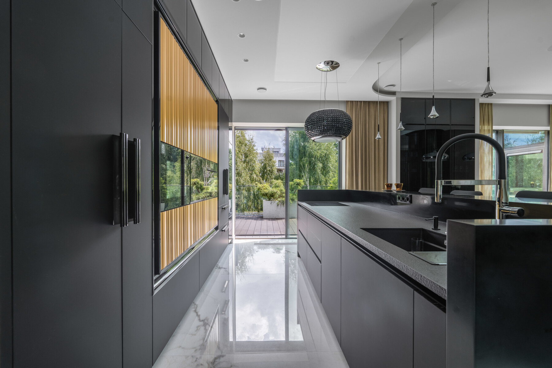 W apartamencie znajdziemy również wewnętrzną windę osobową do poziomu tarasu dachowego, kino domowe, nowoczesny centralny system rekuperacji i uzdatniania jakości powietrza, system uzdatniania wody, odkurzacz centralny oraz centralny systemy wentylacji i klimatyzacji.