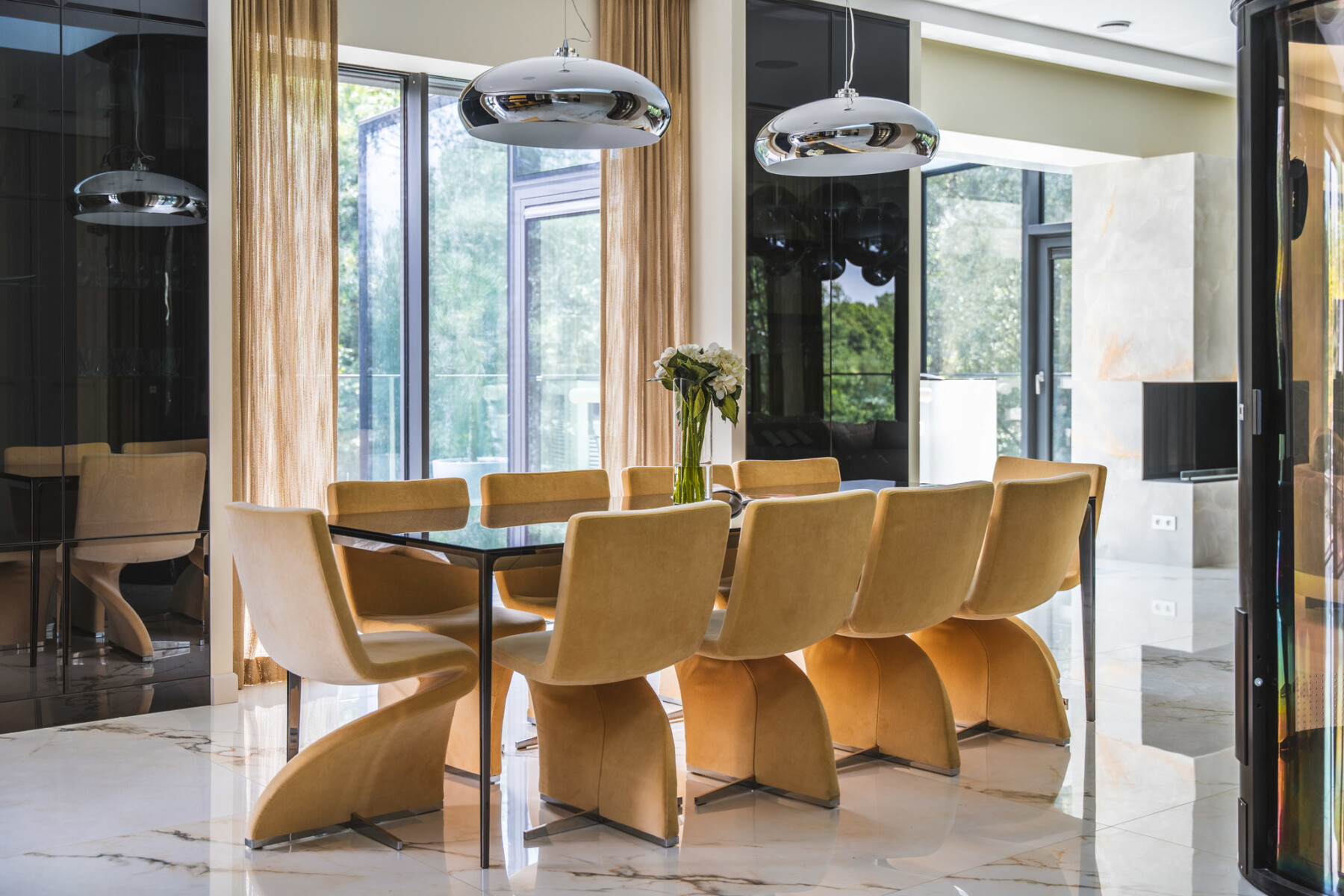 Znajdziemy tu salon z ogrodem zimowym oraz wyjściami na taras. Salon płynnie łączy się z kuchnią, jadalnią oraz gabinetem, który można oddzielić na czas rozmów czy pracy. W ogrodzie zimowym mamy miejsce do spotkań, z niedużym barem dla przyjmowania gości.