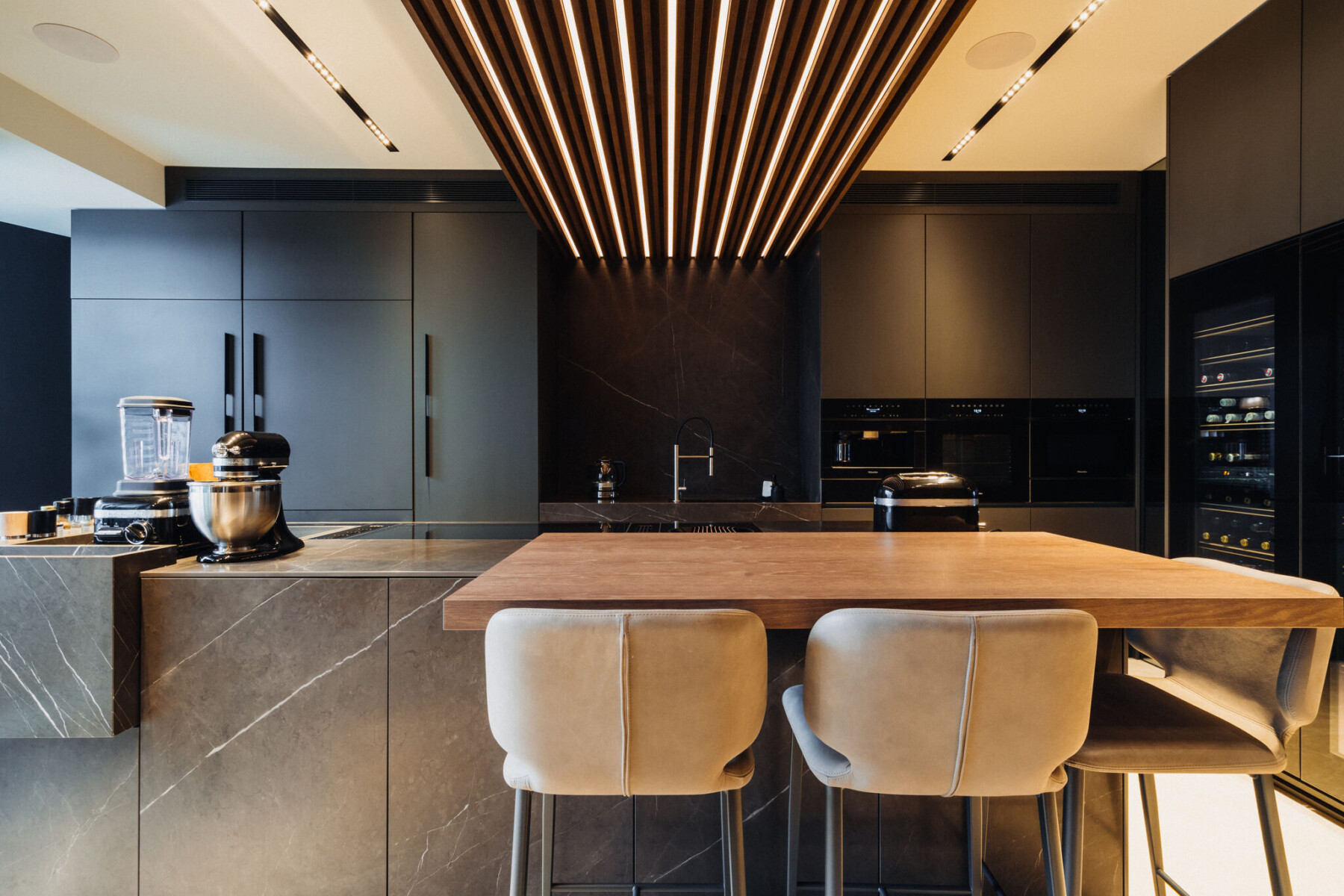 · Części wspólne wykończone w najwyższym standardzie (okładzina orzech amerykański, spiek ANIMA STATUARIO VENATO LUC CAESAR, Oświetlenie klatki FLOS i KRONE, sterowane elektronicznie.