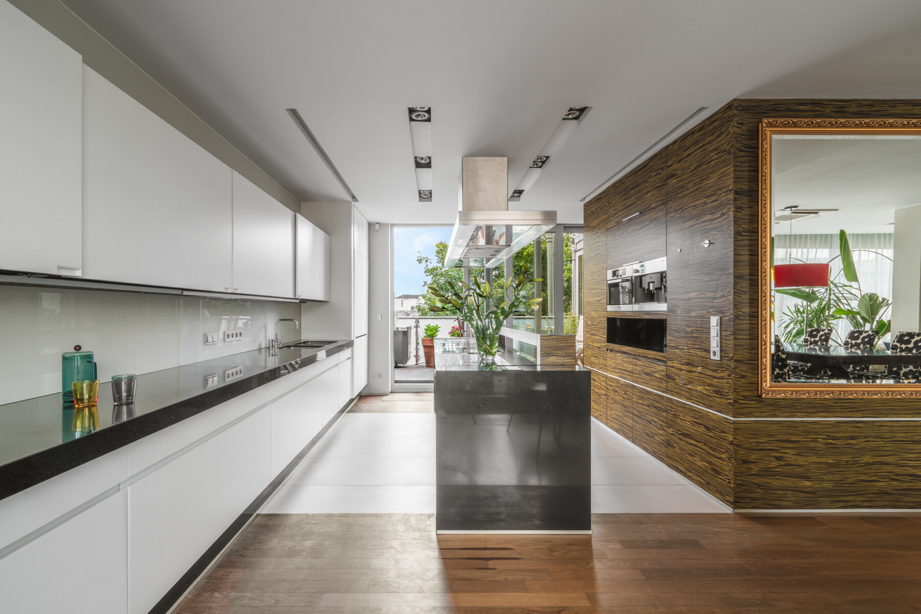 · eleganckiej kuchni wyposażonej w wysokiej klasy sprzęt AGD, z której wyjście prowadzi na drugi taras z grillem i z widokiem na zieleń