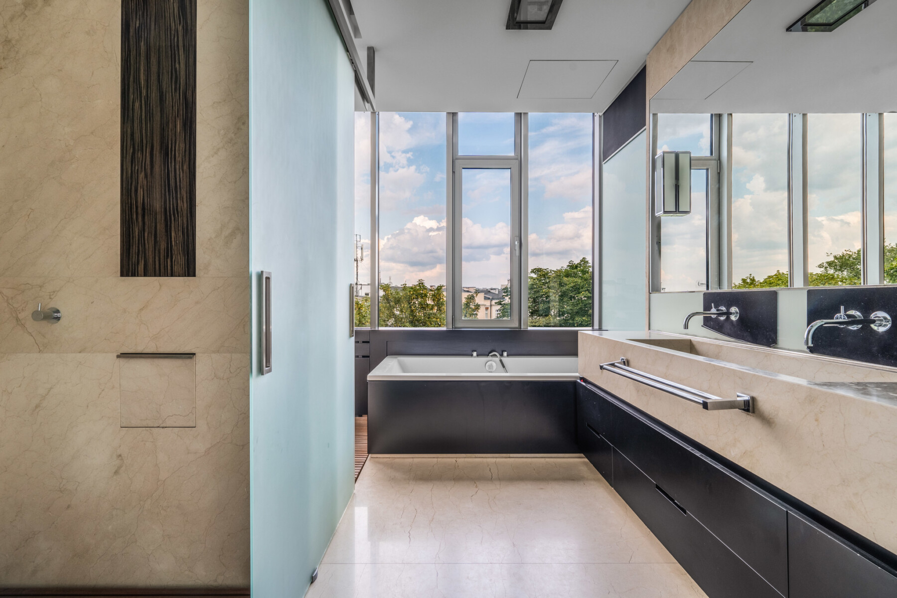 · master bedroom z własną komfortową łazienką z wanną i z widokiem na zieleń oraz dachy Warszawy