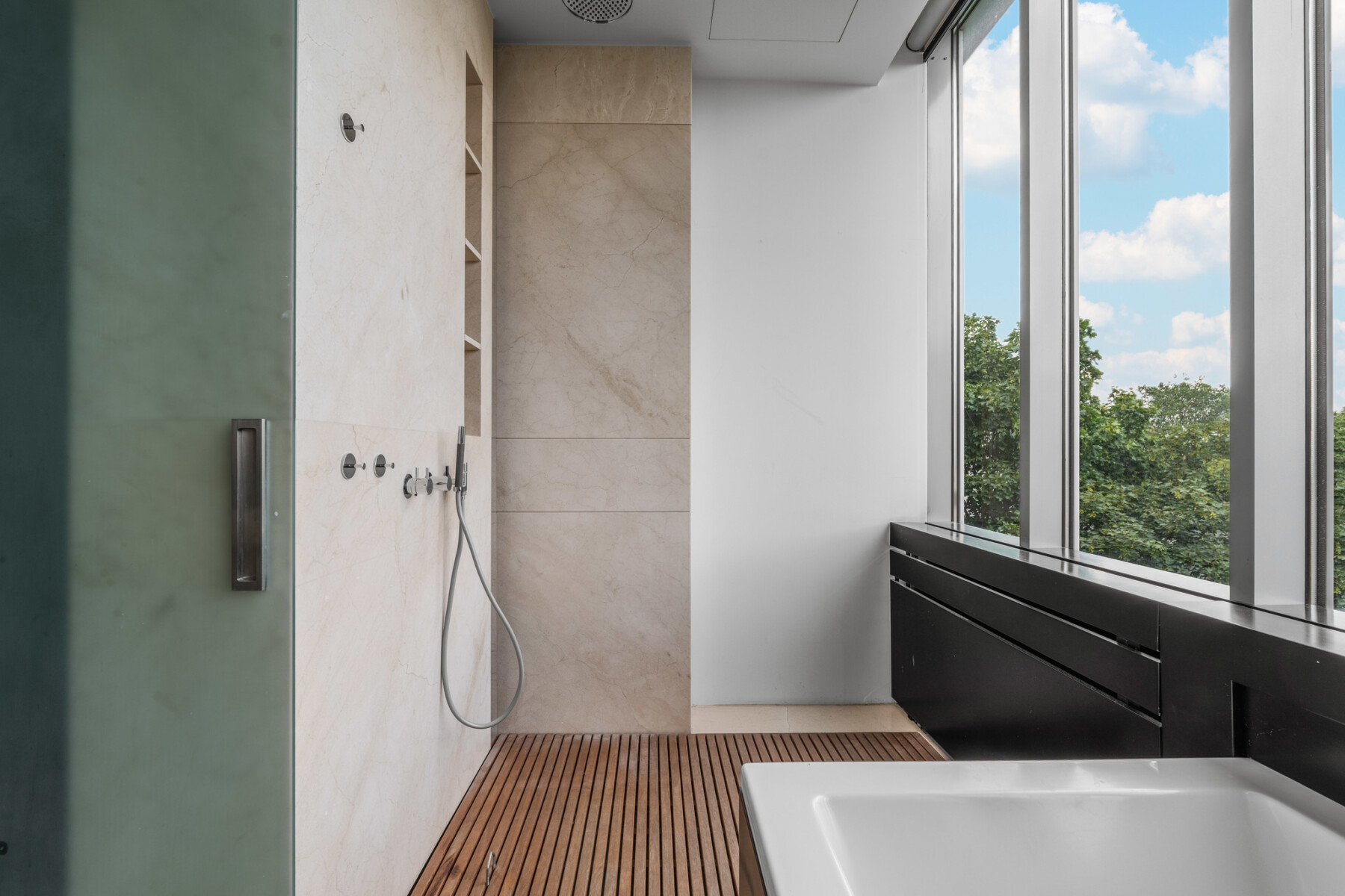 Ten przestronny i słoneczny apartament jest wykończony w bardzo wysokim standardzie z użyciem naturalnych fornirów i okładzin z kamienia. Jego dodatkowym atutem są 3 tarasy z pięknym widokiem na sąsiadujące kamienice oraz zielony dziedziniec.