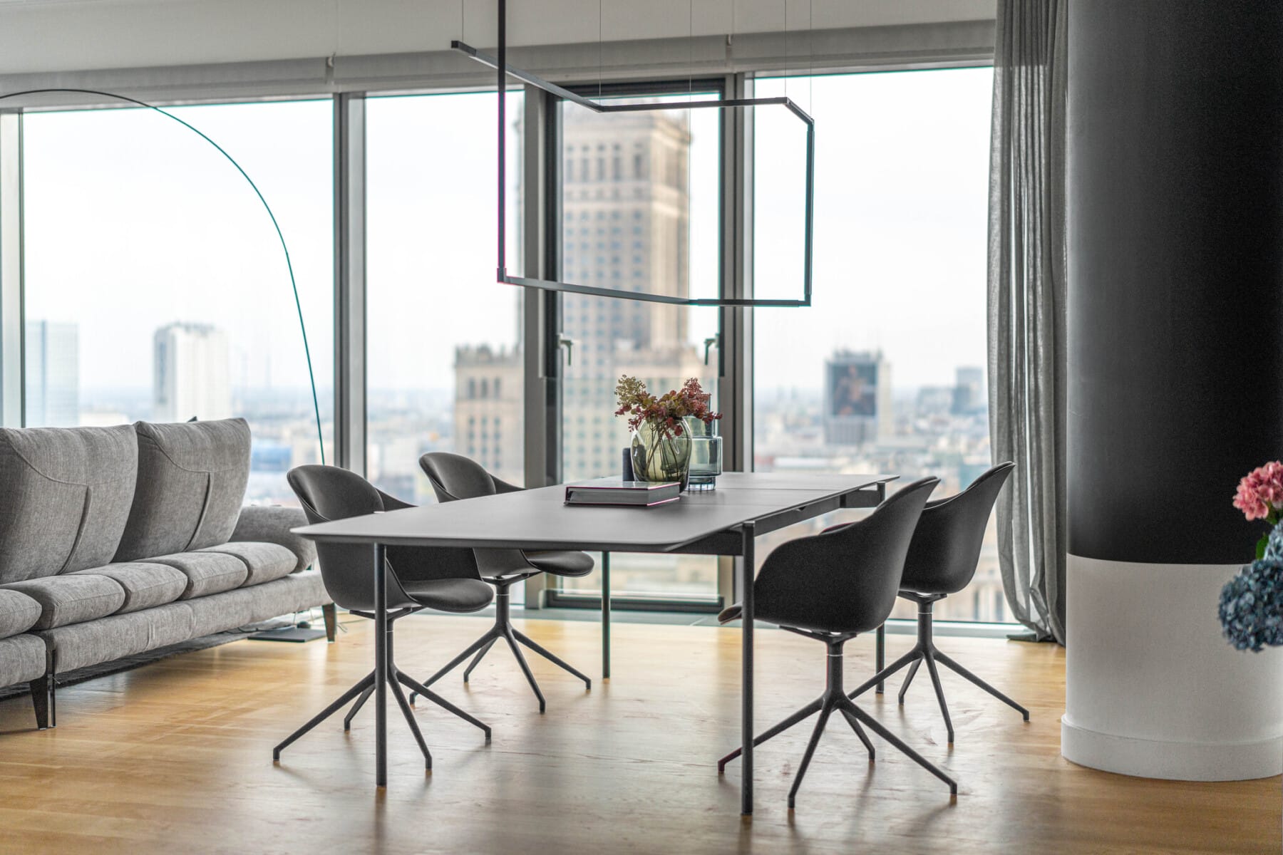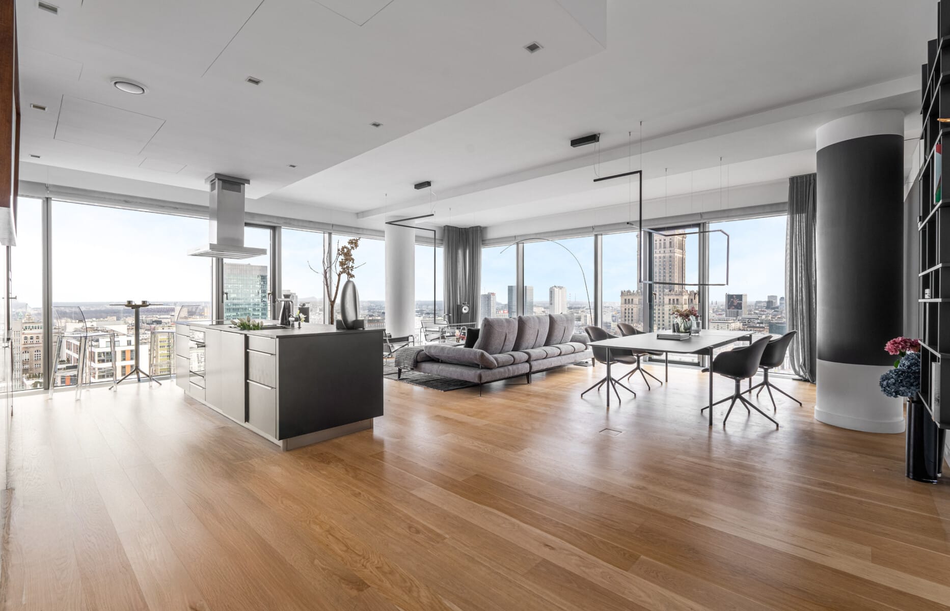 – serce apartamentu to przestronny niezwykle klimatyczny panoramiczny salon przepełniony słoneczną południową ekspozycją z zachwycającym widokiem na Pałac Kultury;