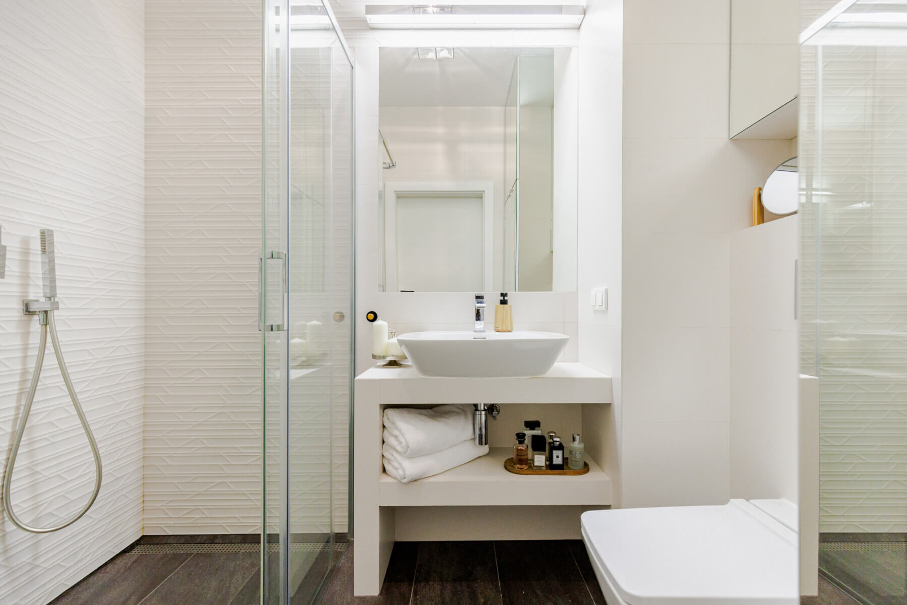 – Łazienka została urządzona z najwyższą starannością – znajduje się w niej wygodny natrysk, umywalka, zabudowana szafa z pralką i suszarką, oraz WC, co sprawia, że jest zarówno elegancka, jak i bardzo funkcjonalna.