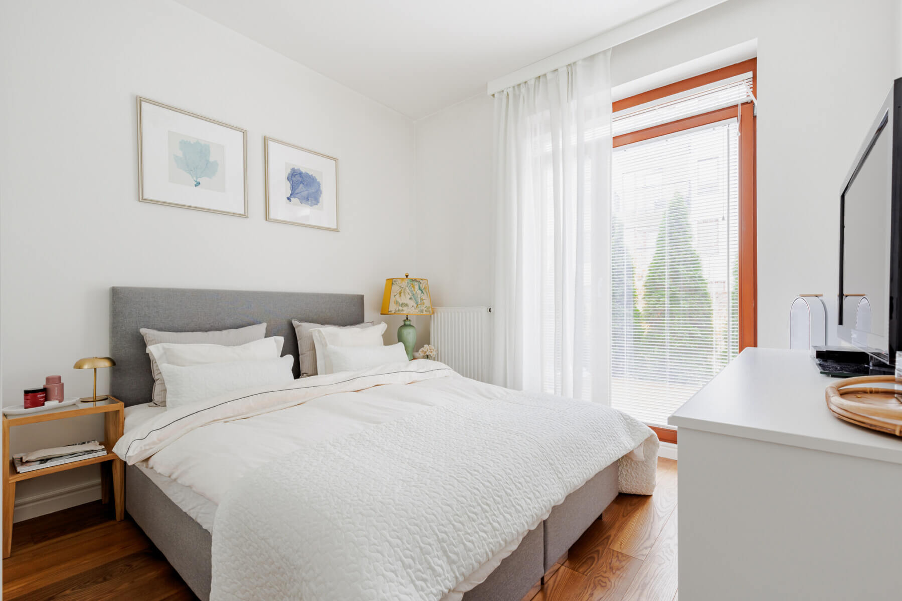 – Pierwsza sypialnia wyposażona w szafę w zabudowie, duże łóżko oraz toaletkę, stwarza idealne warunki do odpoczynku.