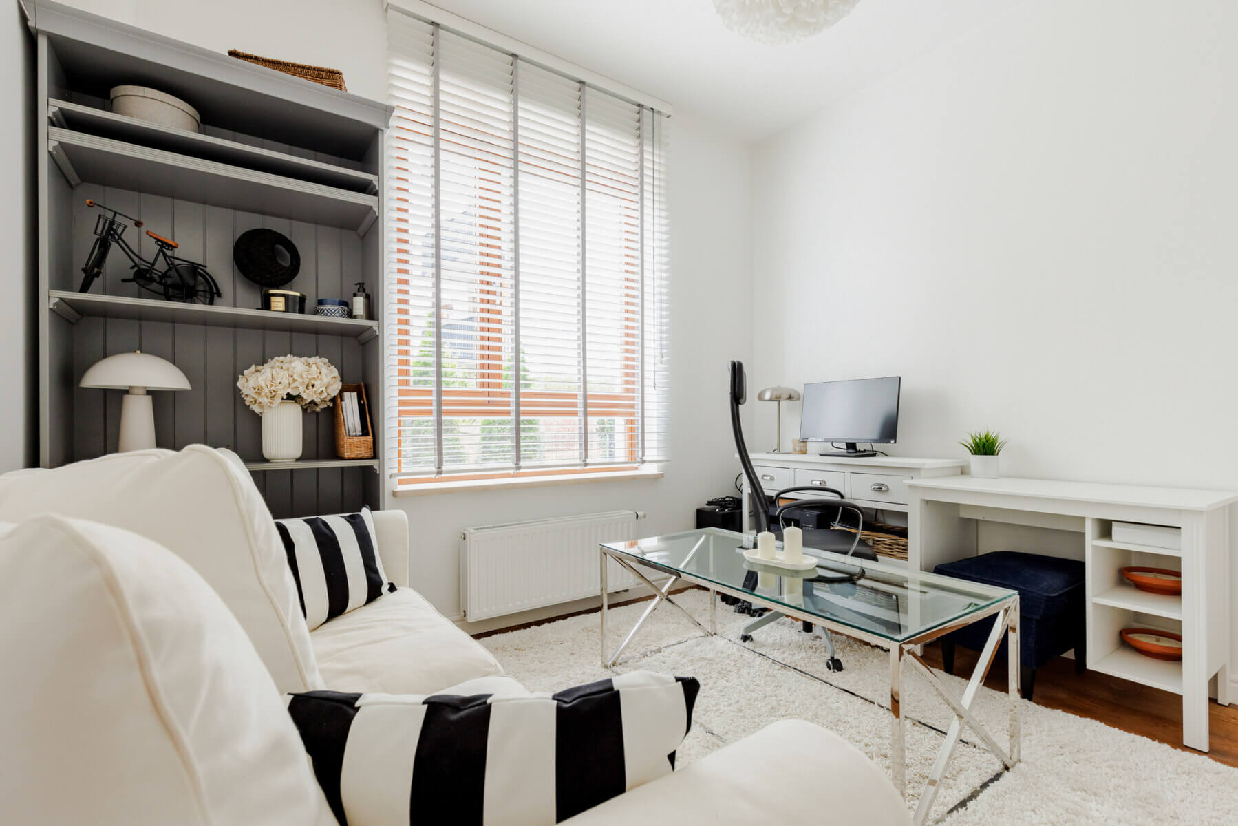 – Druga sypialnia z funkcjonalną szafą, biurkiem, sofą i stolikiem kawowym jest doskonała również na pokój gościnny, biuro, czy przestrzeń do relaksu.