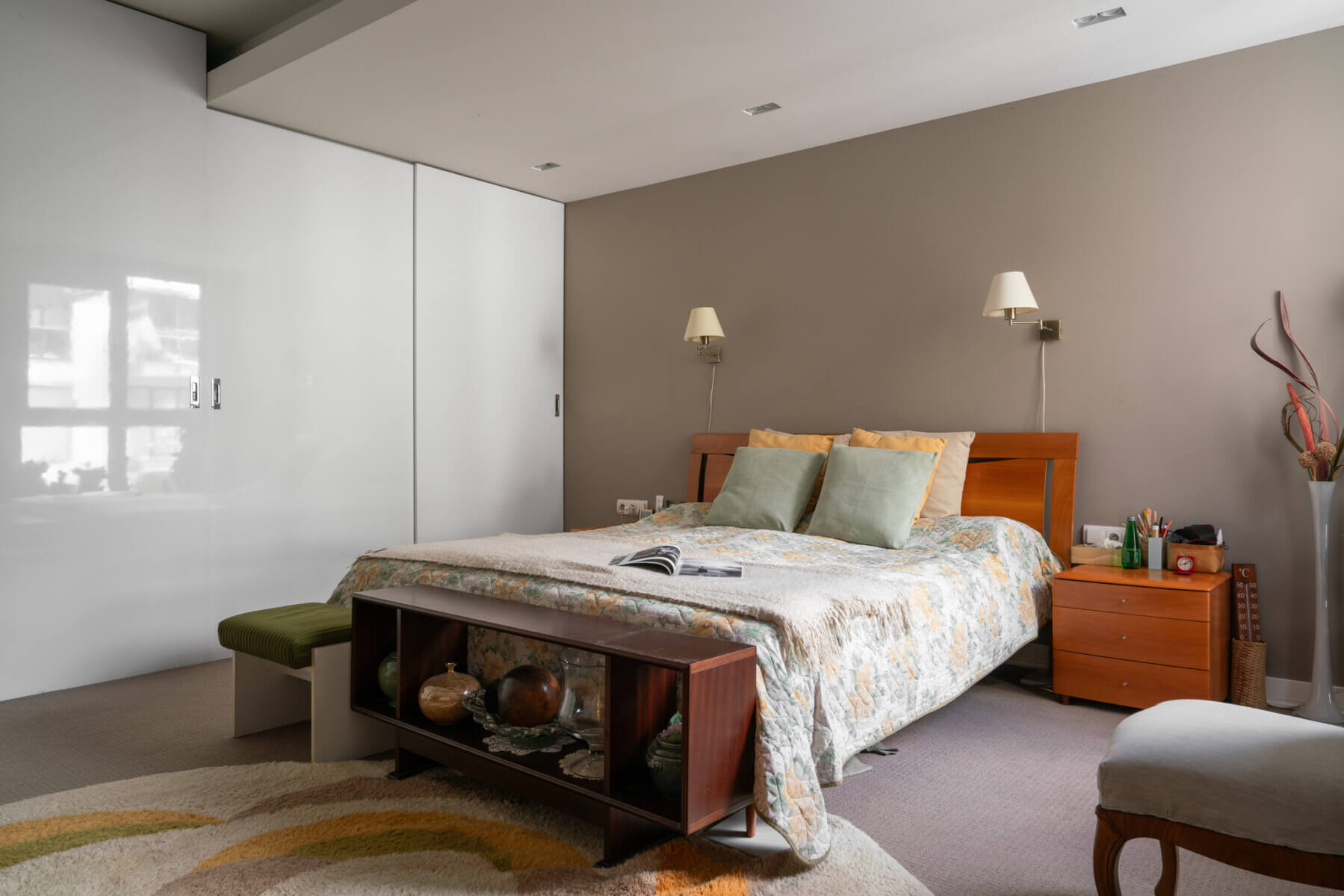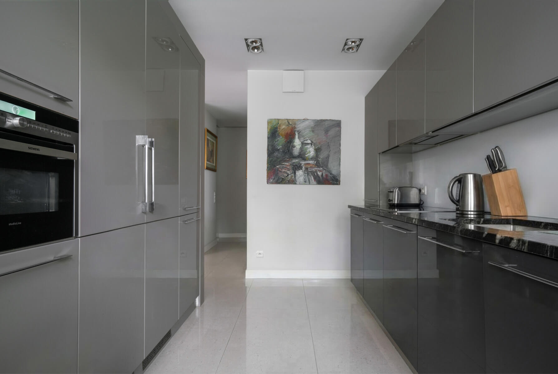 Strefa prywatna została oddzielona przesuwnymi, dodatkowymi drzwiami. Na podłogach znajdziemy polerowany trawertyn i dębowy parkiet. Kuchnia zabudowana szafami, a w całym mieszkaniu znajdziemy wiele miejsc do przechowywania.