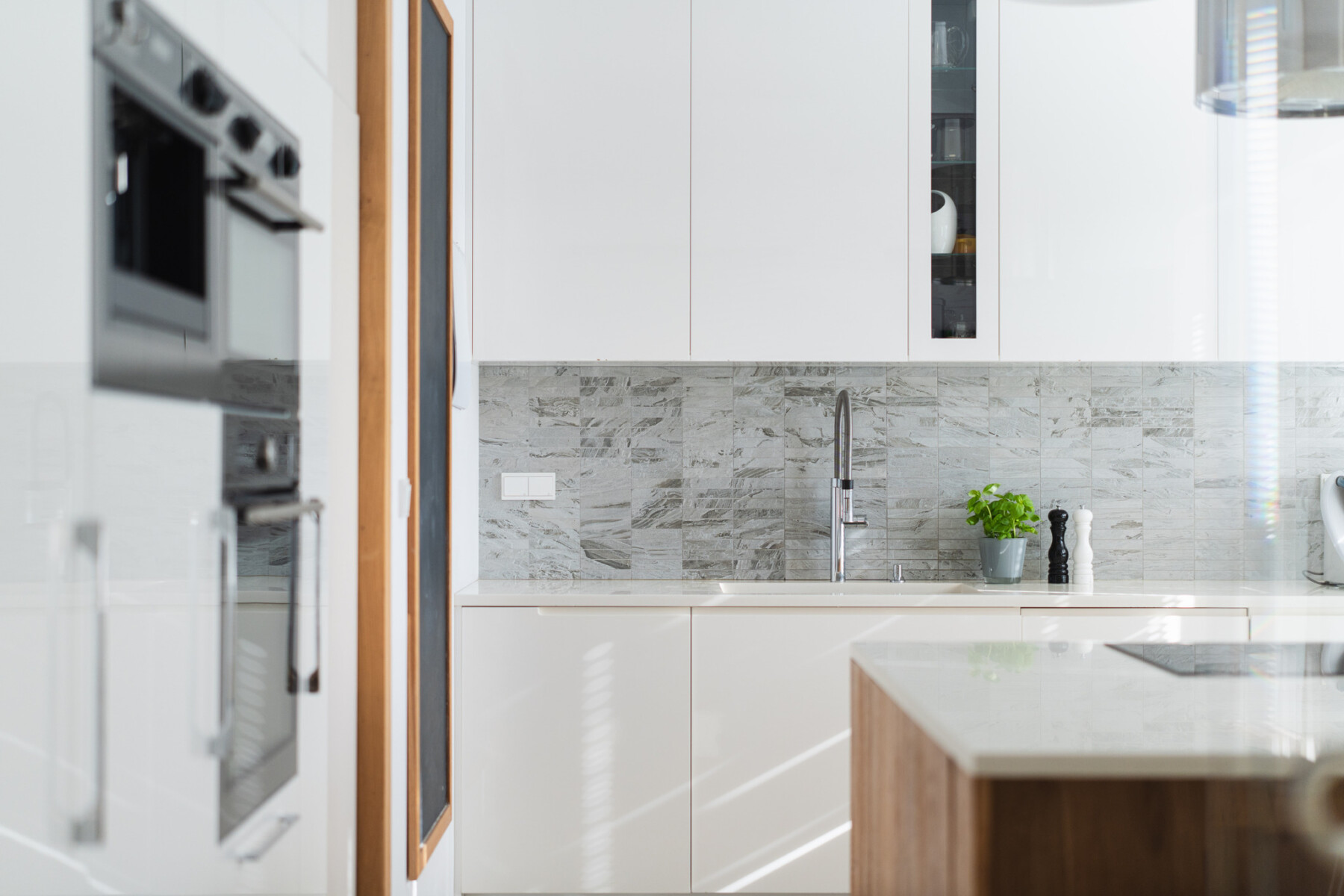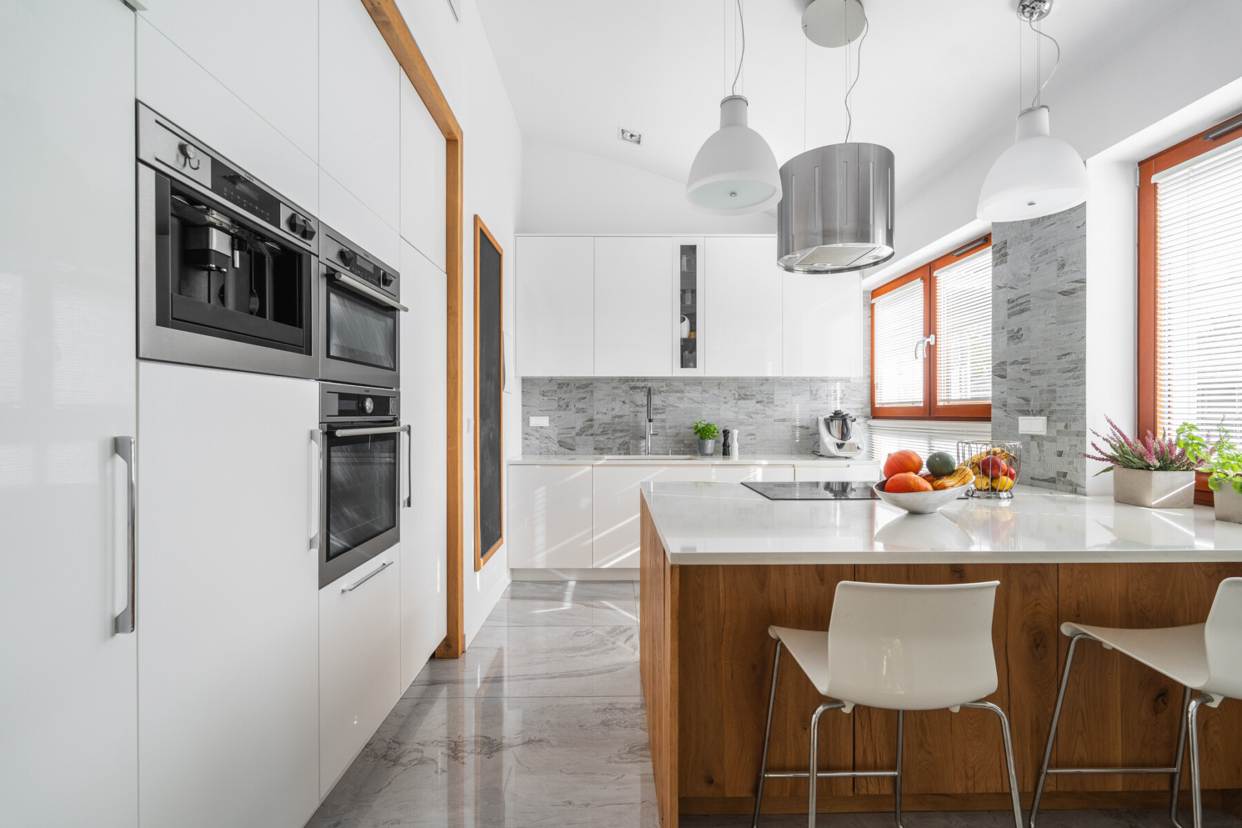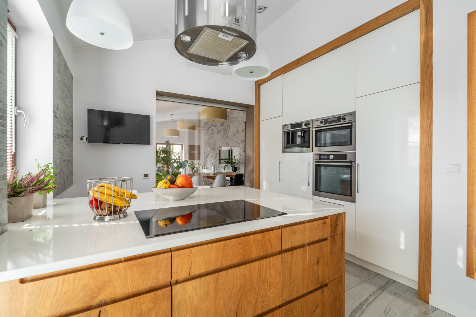 • oddzielnej kuchni (z zabudową na wymiar wyposażonej w wysokiej klasy sprzęt AGD oraz lodówkę na wino), z przeszklonym wyjściem do jadalni, w której mieści się stół dla 10 osób