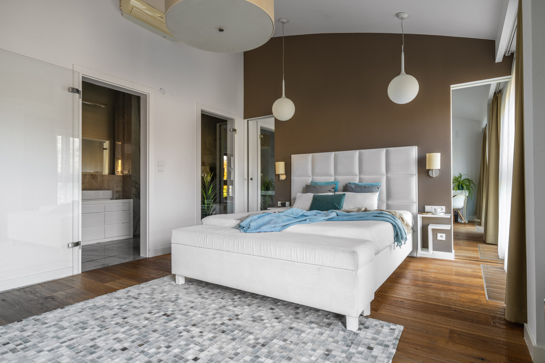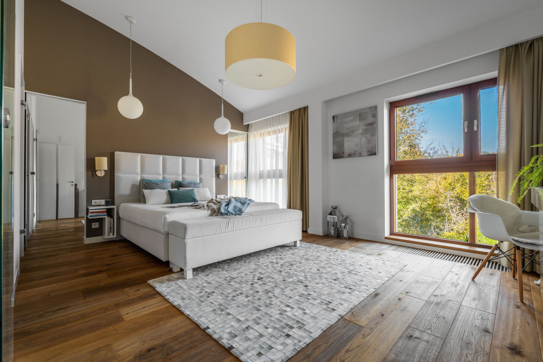 • sypialni nr 1 typu master z widokiem na starodrzew, dużą garderobą oraz łazienką z wanną, wygodną kabiną prysznicową i bidetem
