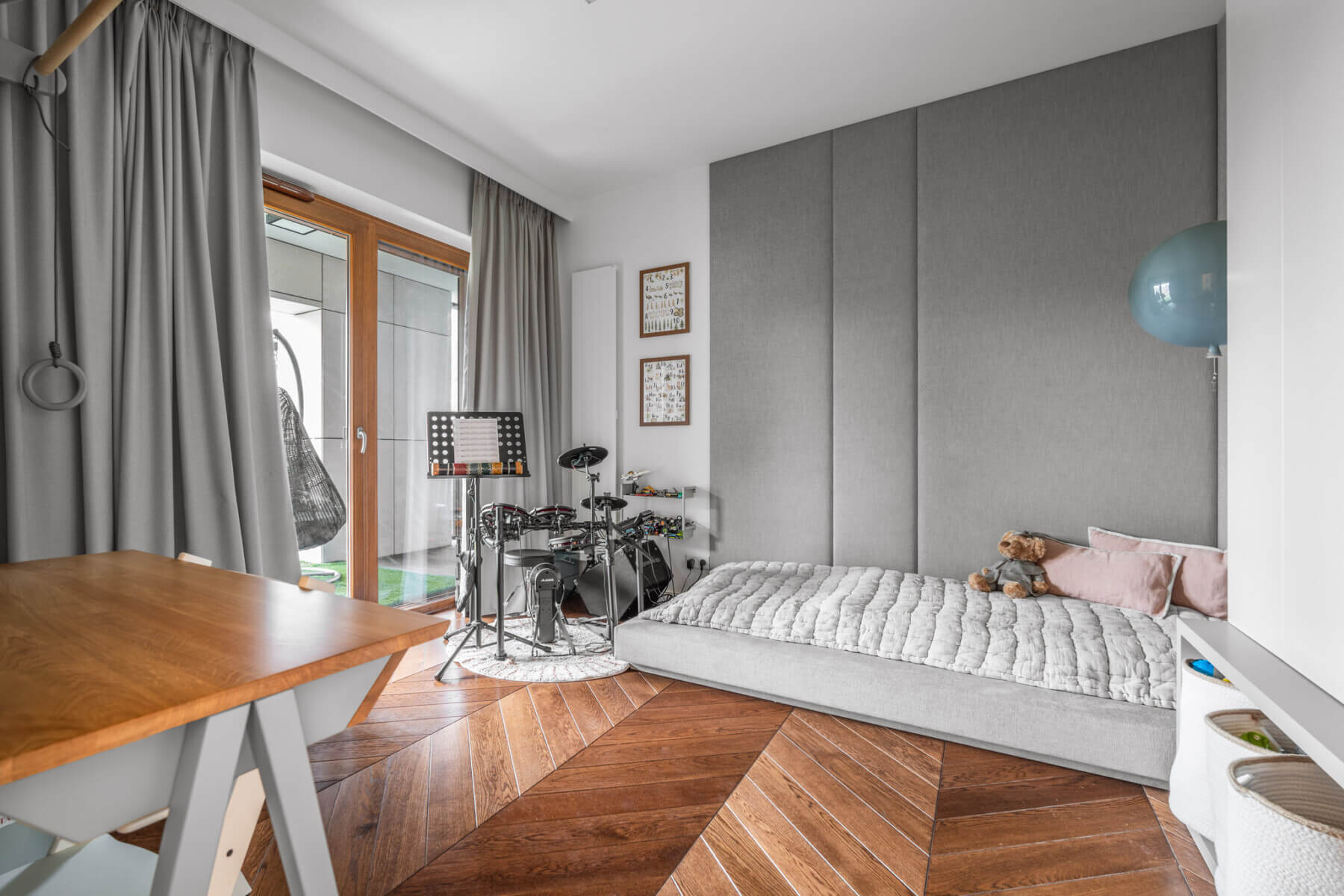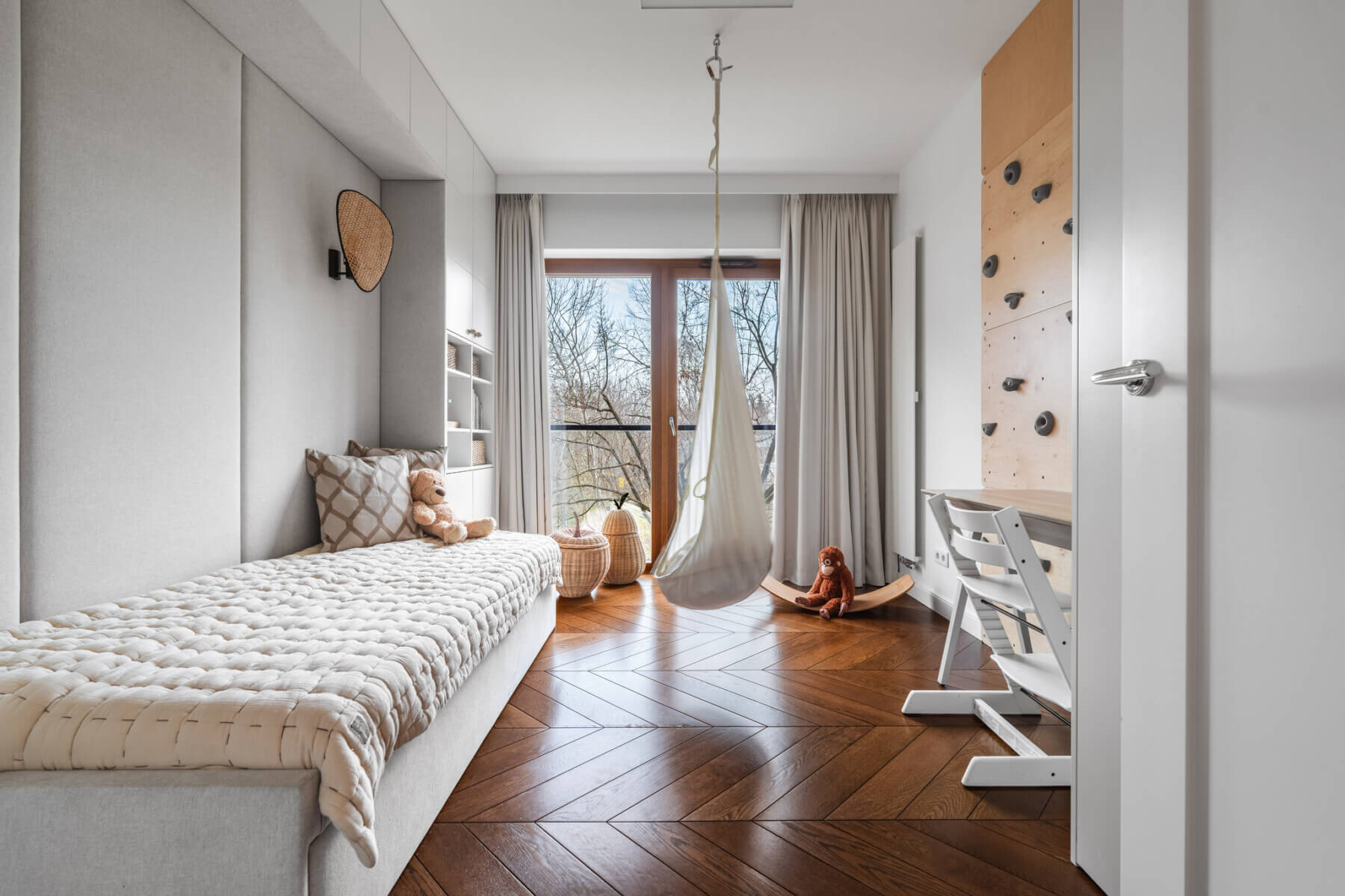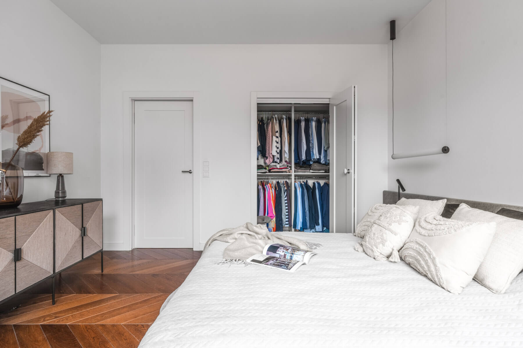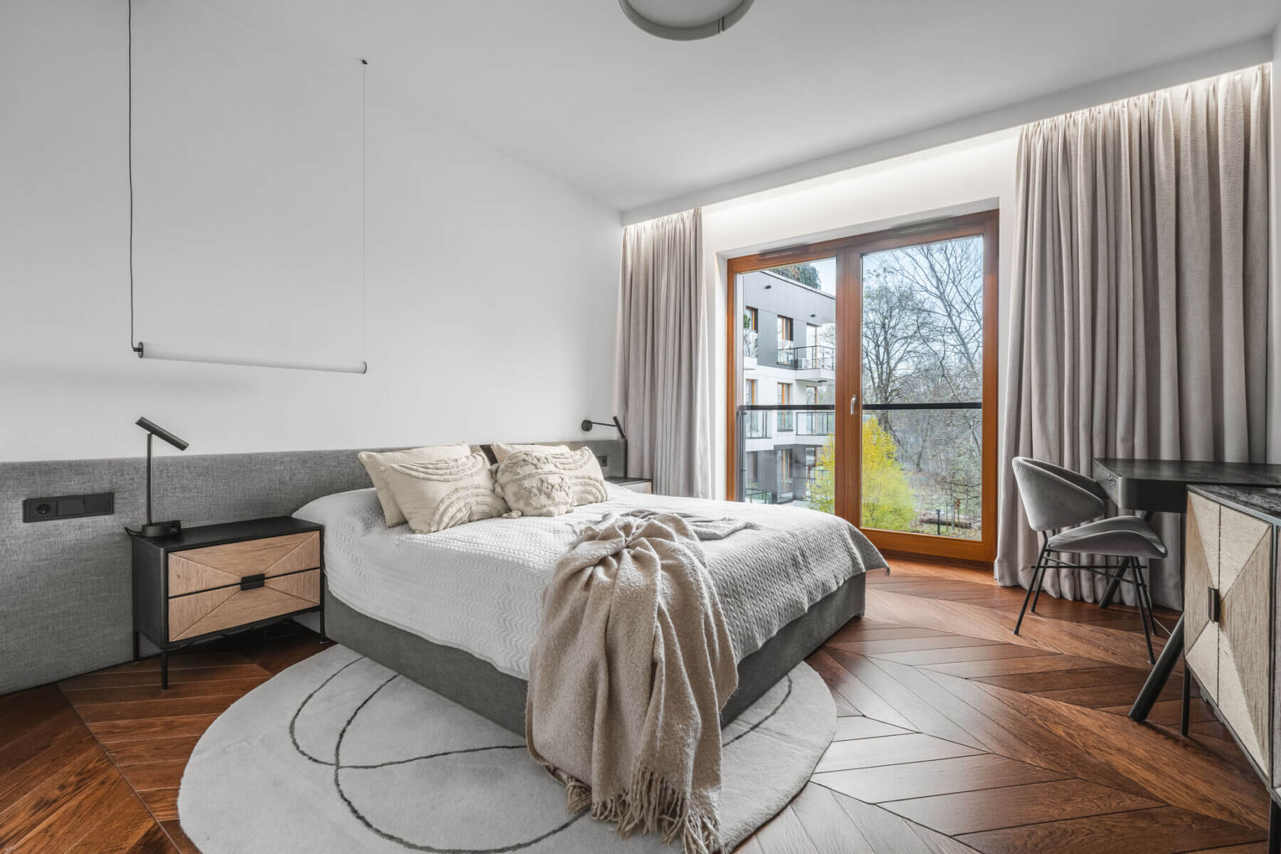 – komfortowo urządzona sypialnia z dużym łóżkiem w stonowanych barwach, z przestronną garderobą oraz miejscem do pracy (16m2);