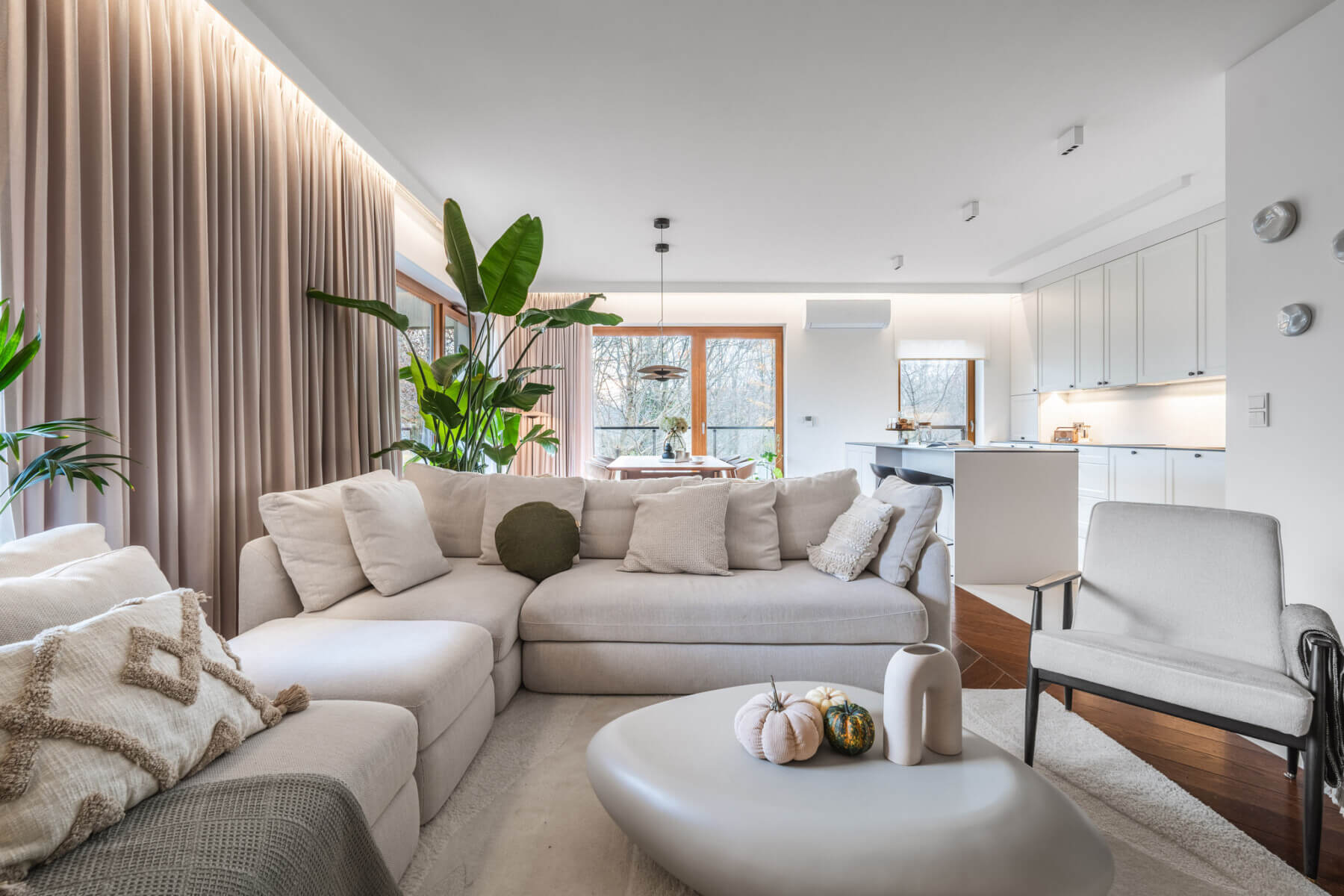 – przestronny niezwykle klimatyczny salon (47m2) z ponoramicznymi oknami, klimatyzacją oraz z bezpośrednim wyjściem na uroczy narożny taras (37m2);