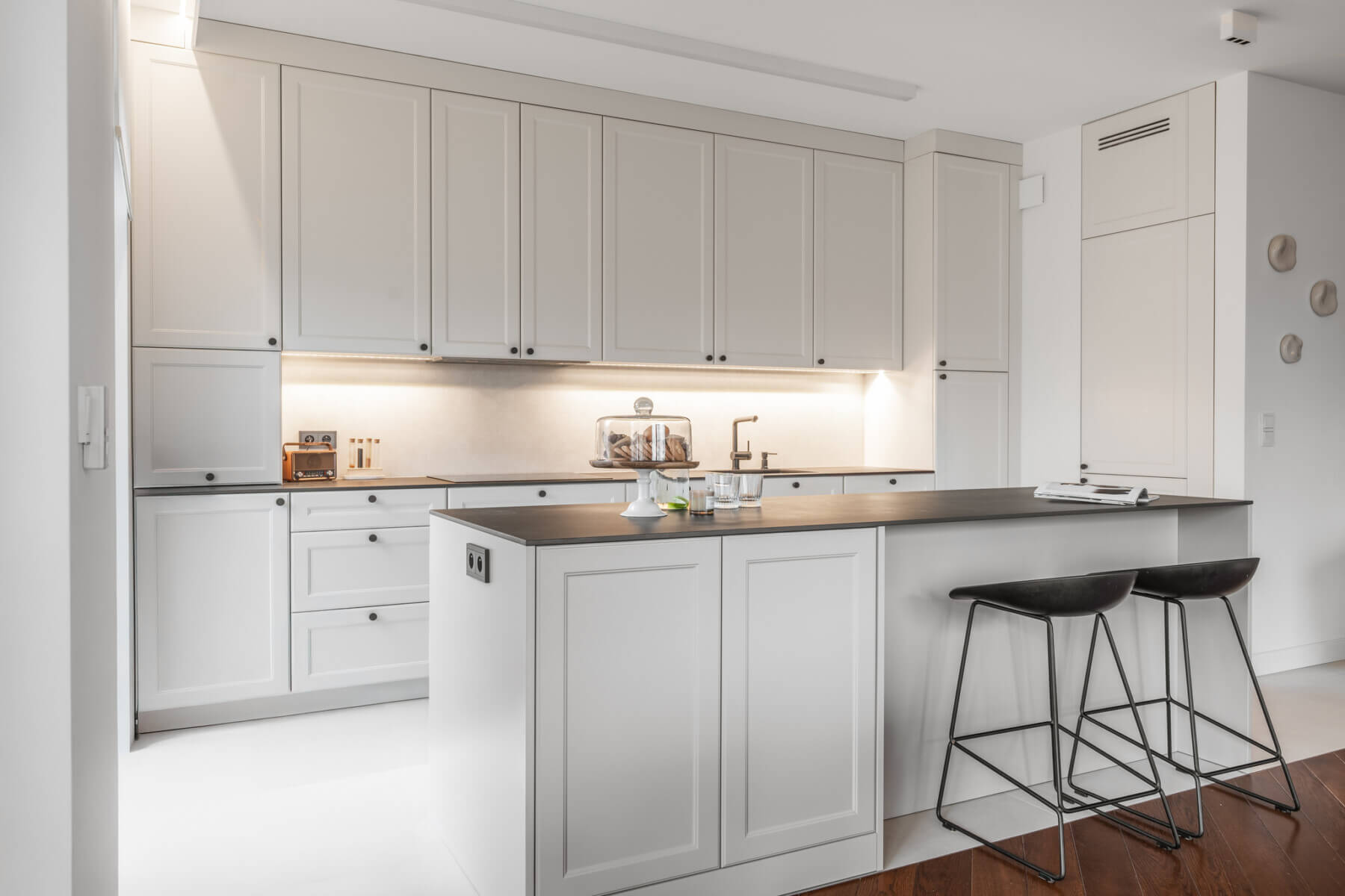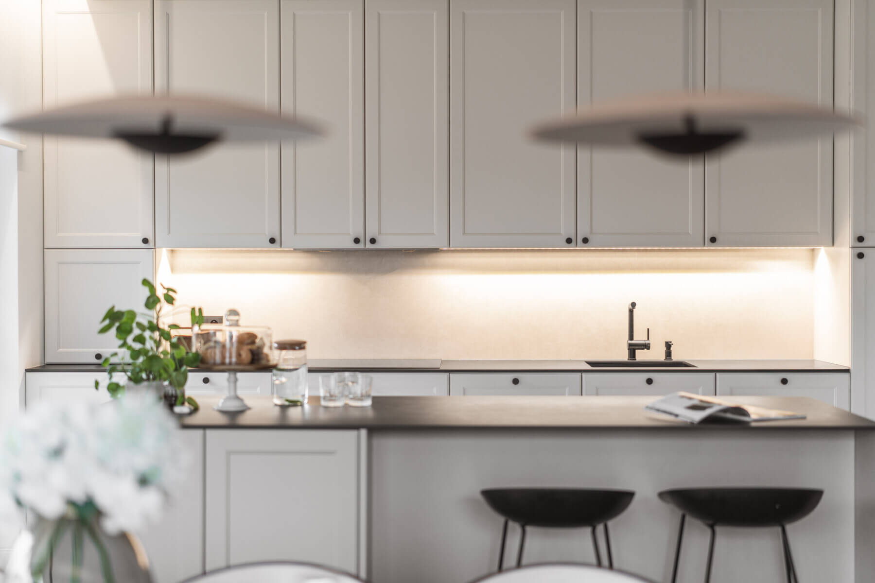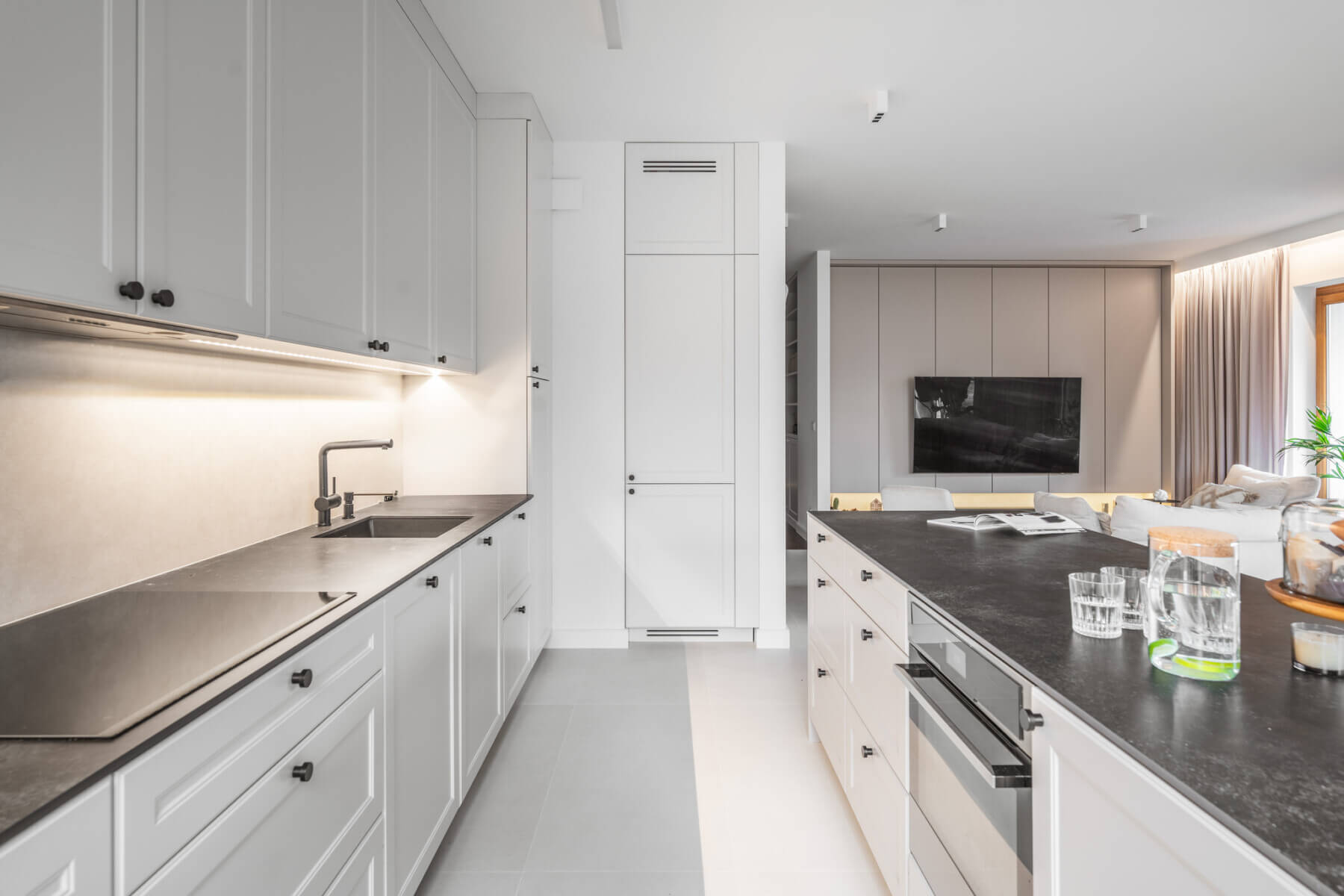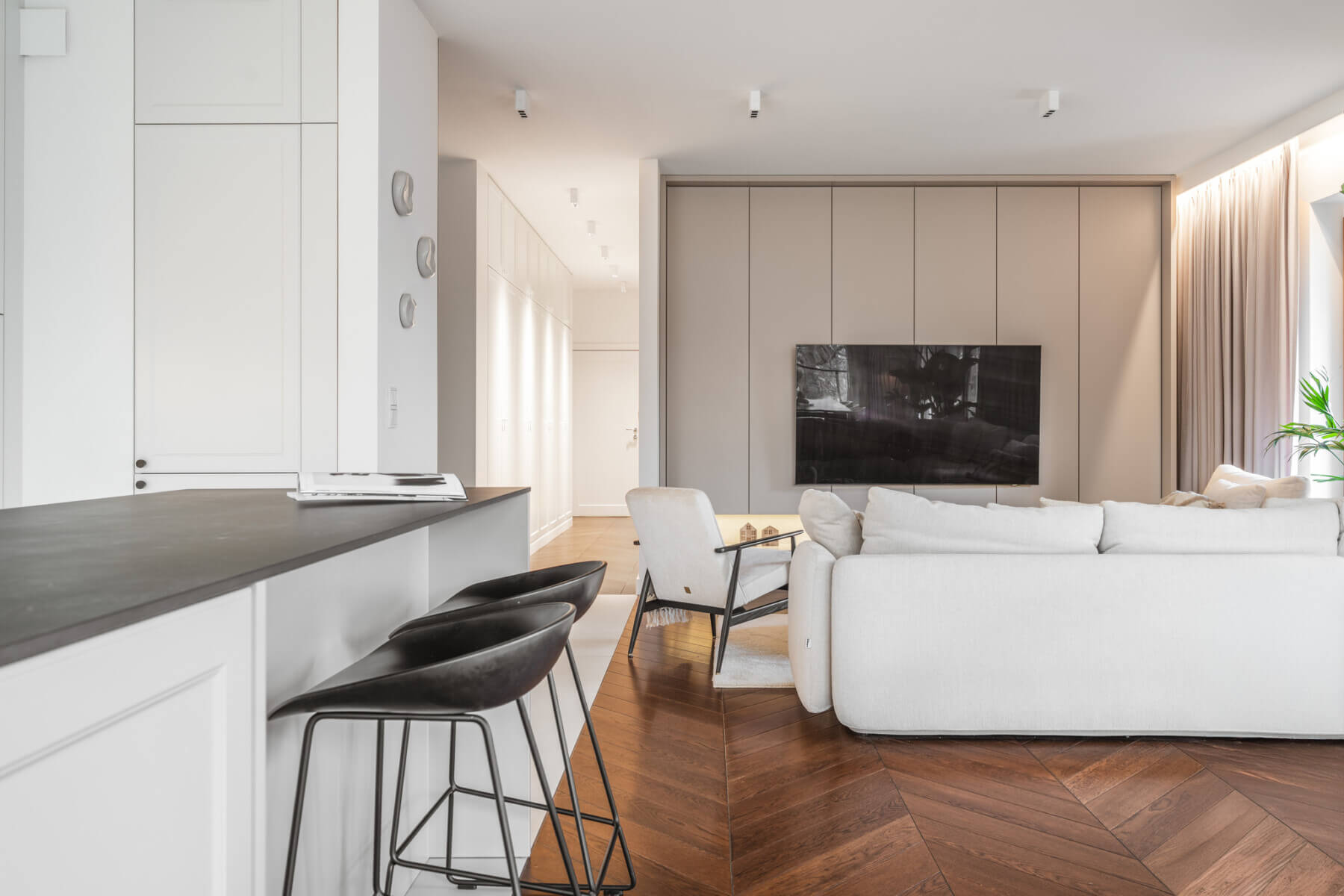 – serce apartamentu to funkcjonalna, otwarta na salon kuchnia, wyposażona w wysokiej jakości sprzęt AGD – strefa jadalniana, łącząca kuchnię i salon;