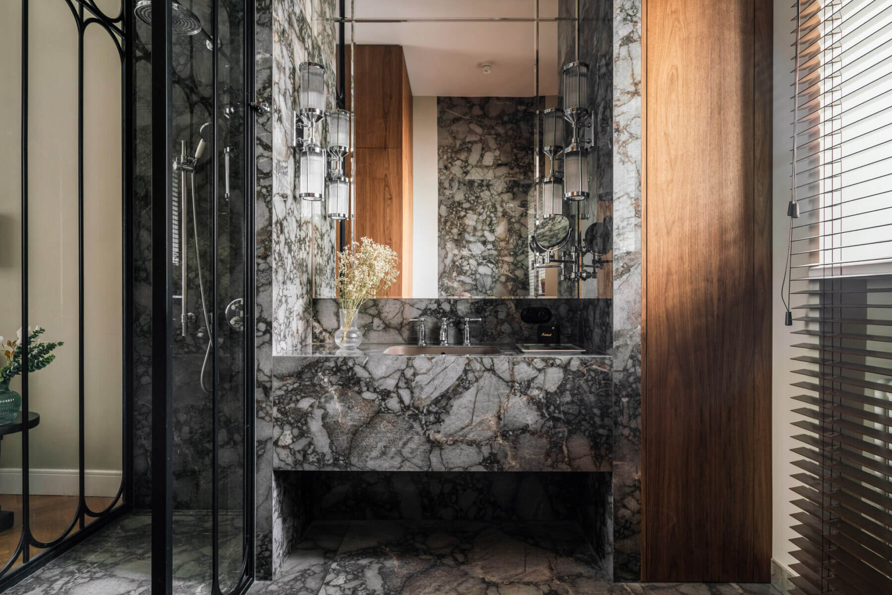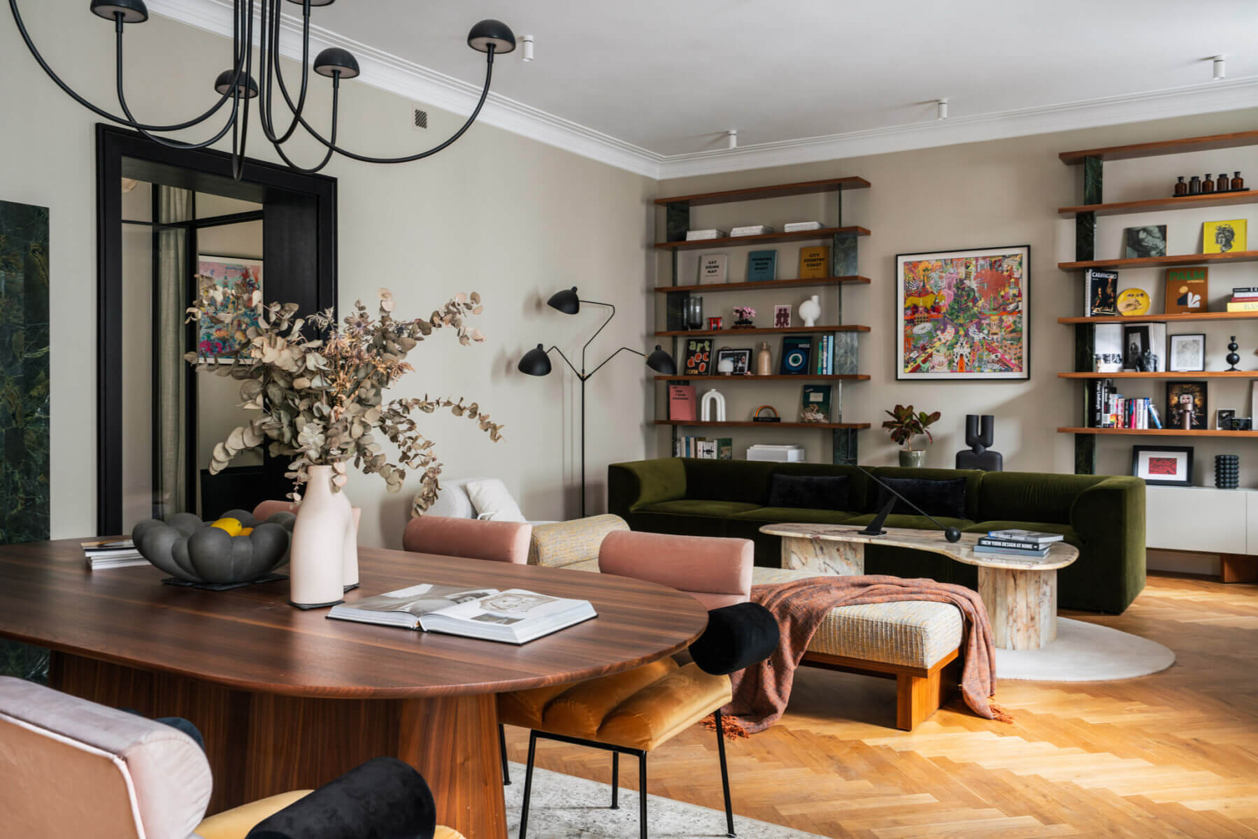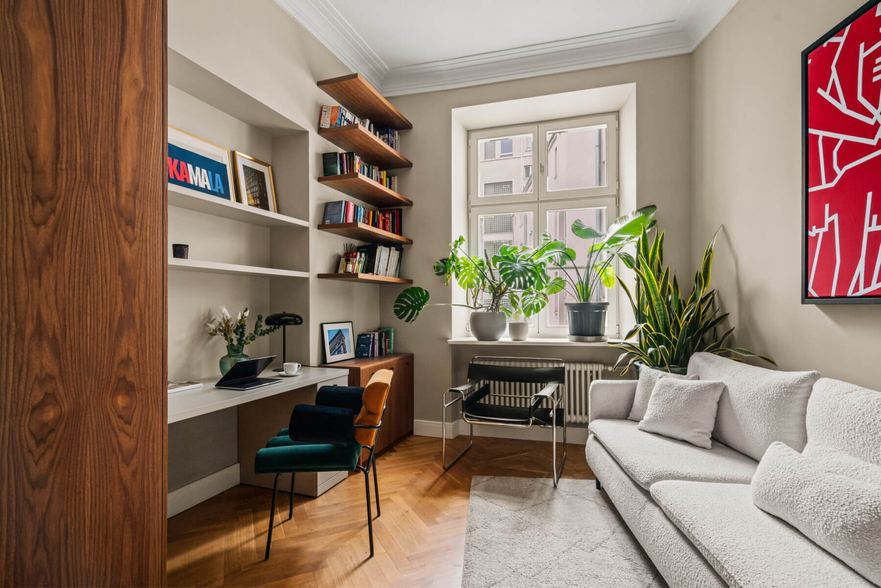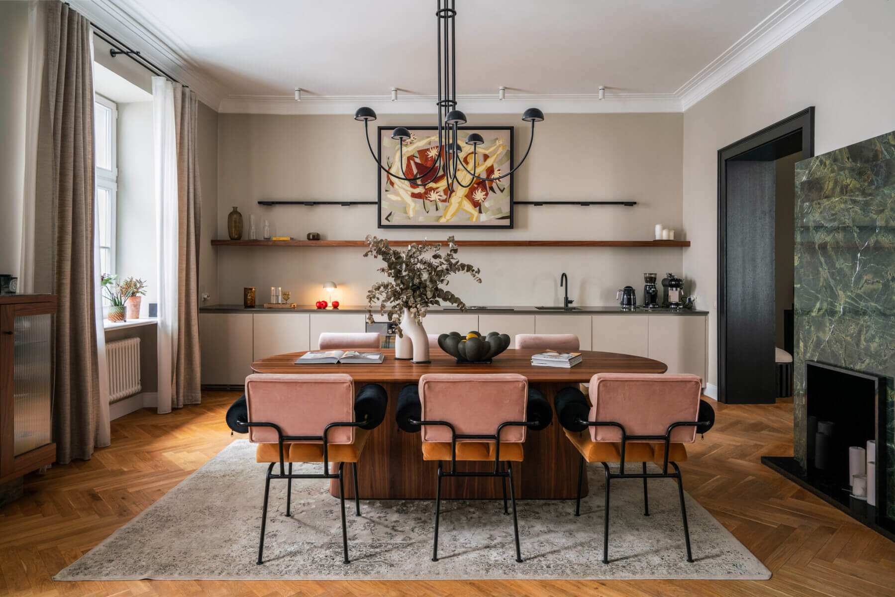 Mieszkanie wykończone z najwyższą dbałością o każdy detal — drewniany parkiet, wyselekcjonowane materiały i spójna aranżacja, którą doceniły międzynarodowe media wnętrzarskie. Wysokość pomieszczeń 320 cm, charakterystyczna dla przedwojennych kamienic, potęguje poczucie przestrzeni i elegancji.