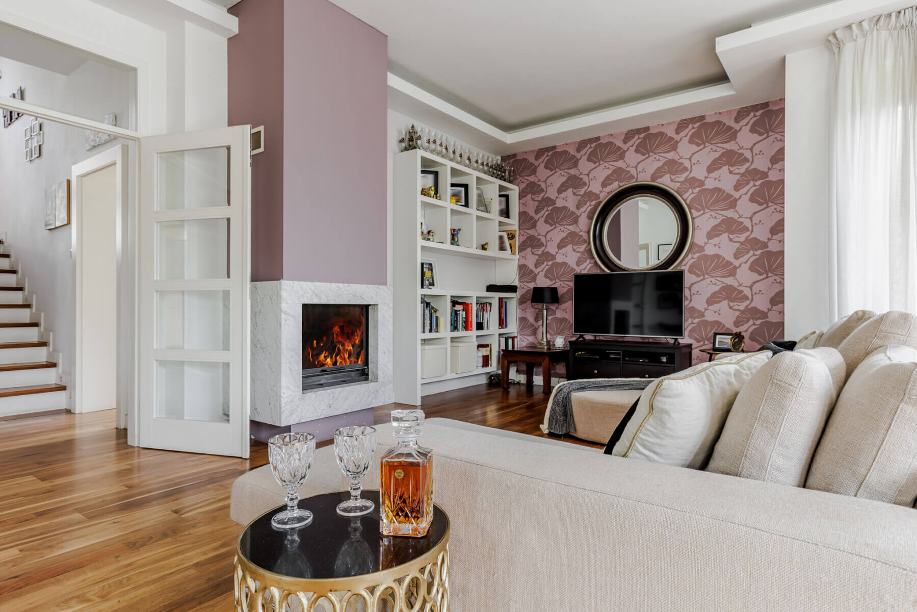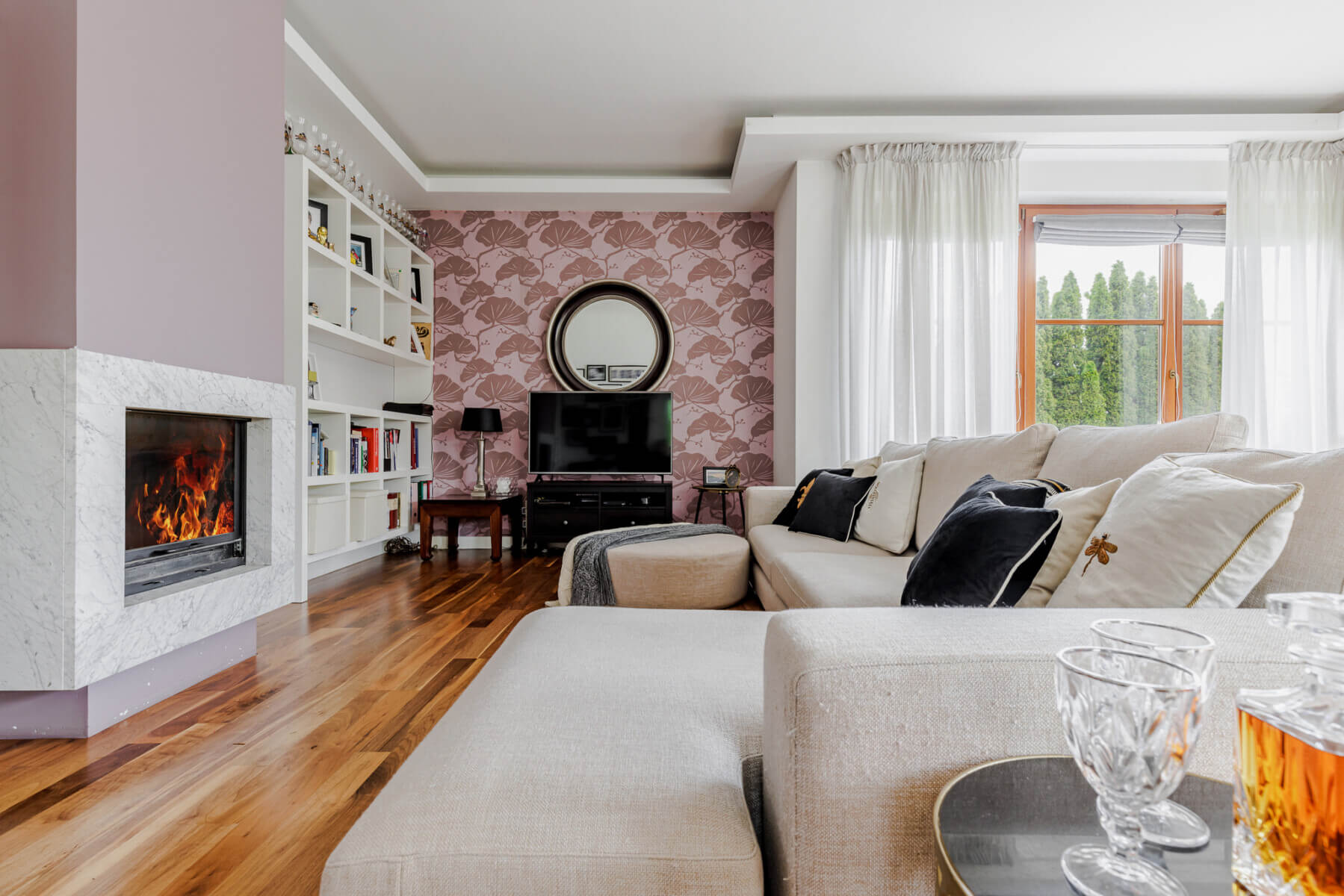 – salon 42 m2 z kominkiem i wyjściem na taras