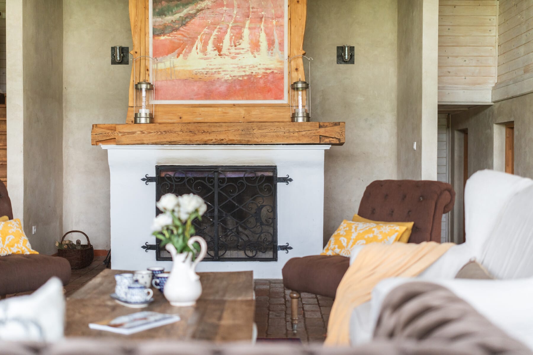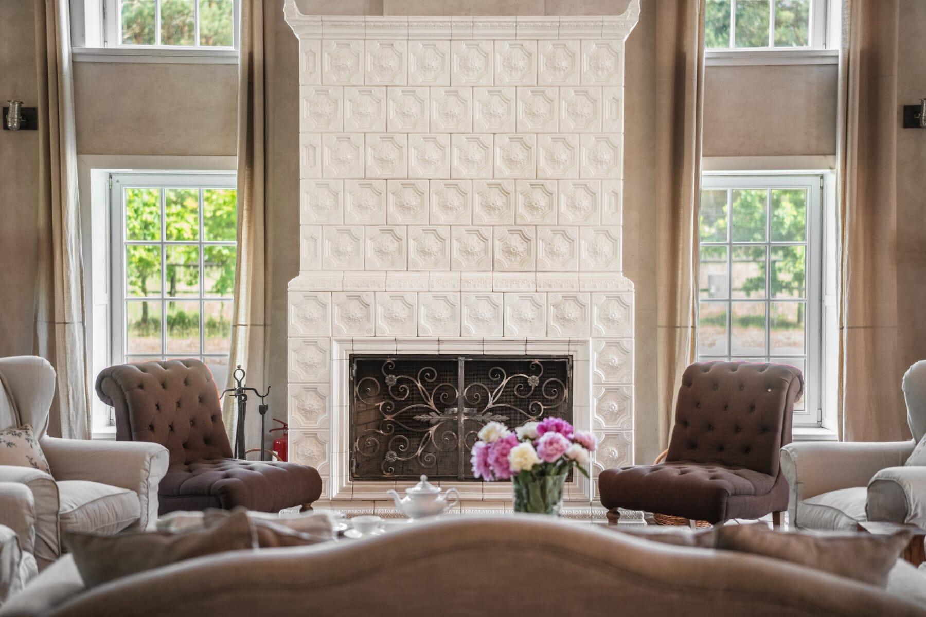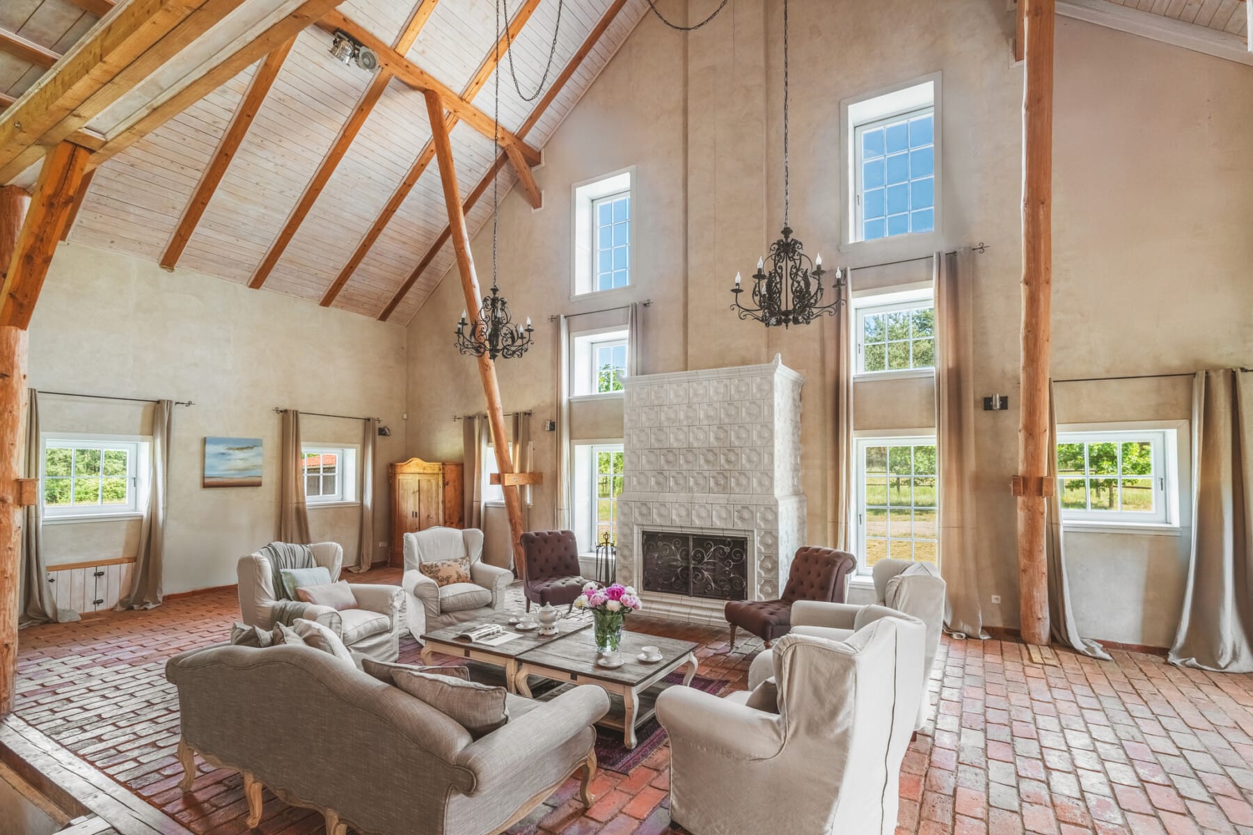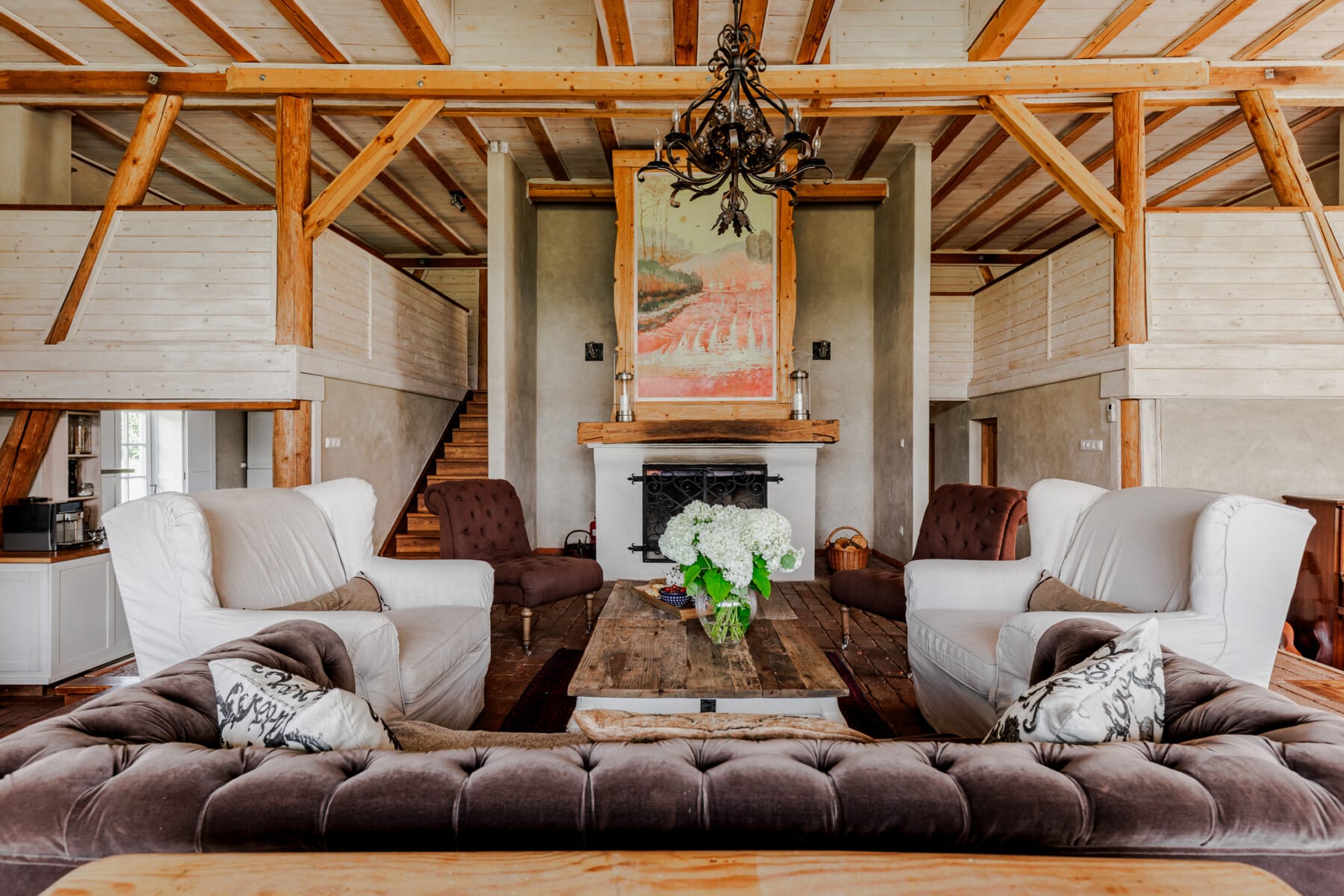 – zjawiskowy salon pełniący funkcję strefy wypoczynkowej, z klimatycznym kominkiem oraz wysokim na 10 m sufitem zapewniającym niezwykłą przestrzeń i lekkość,