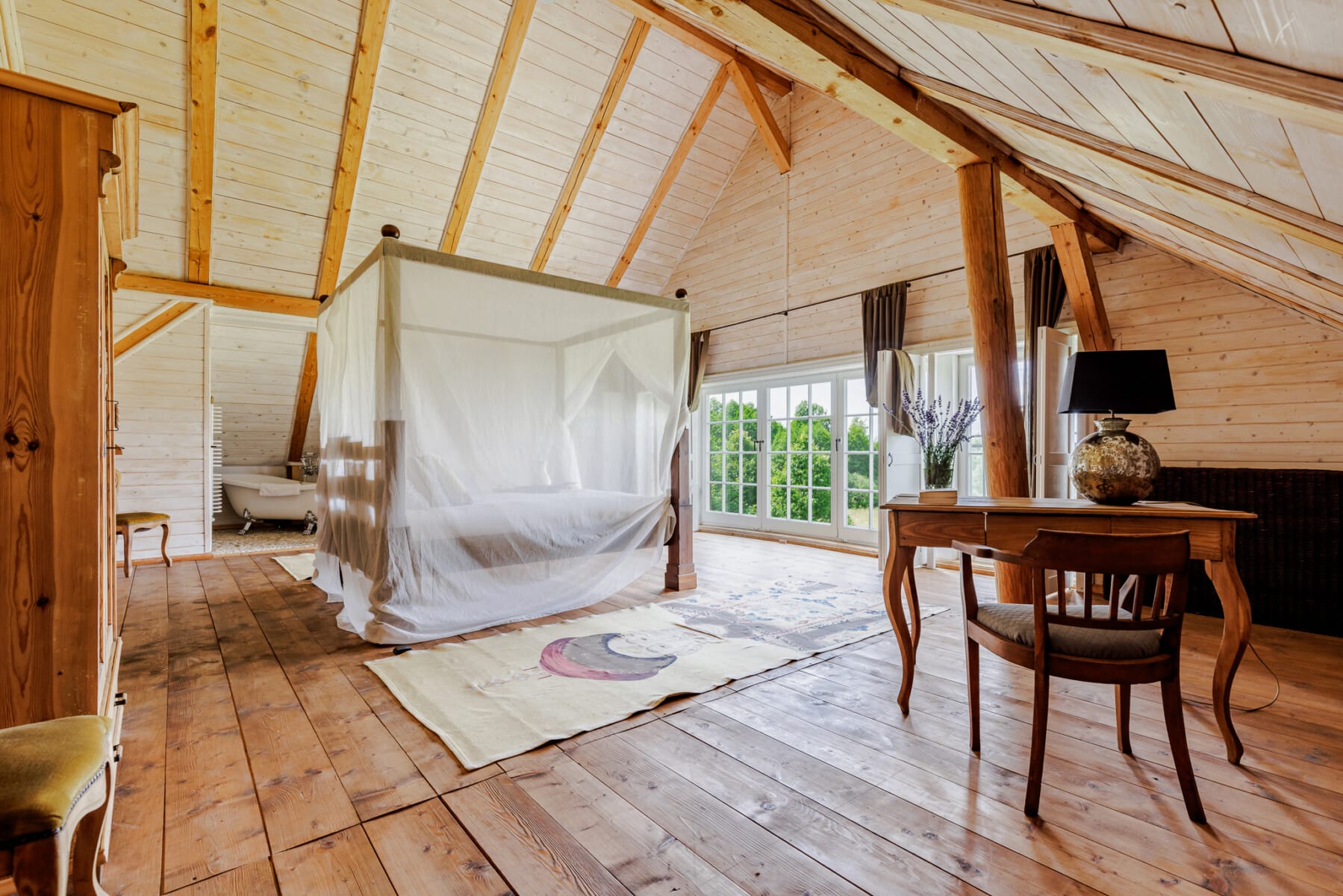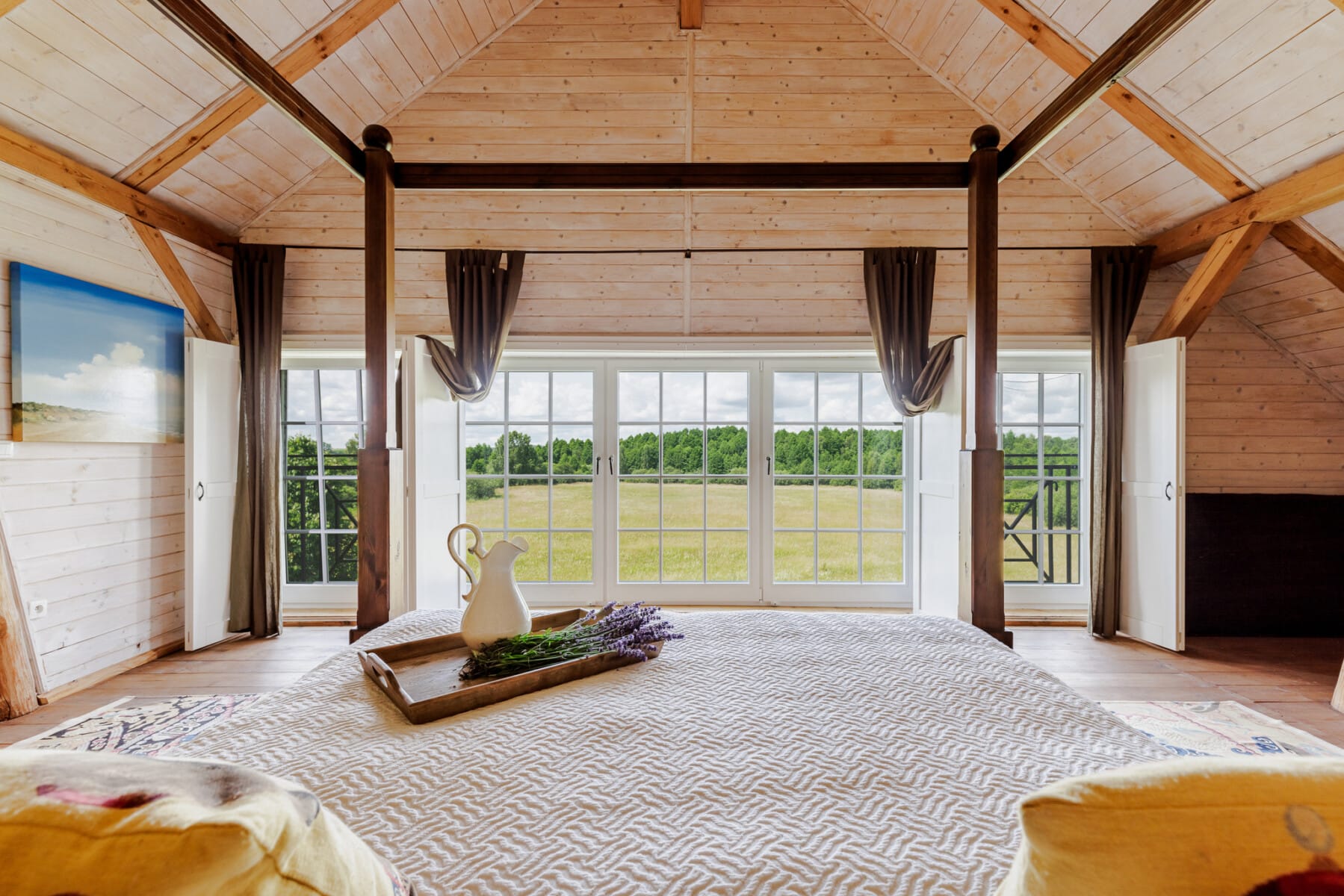 – główna sypialnia typu master z niezwykle komfortowym pokojem kąpielowymi z którego rozprzestrzenia się widok na łąkę i las.