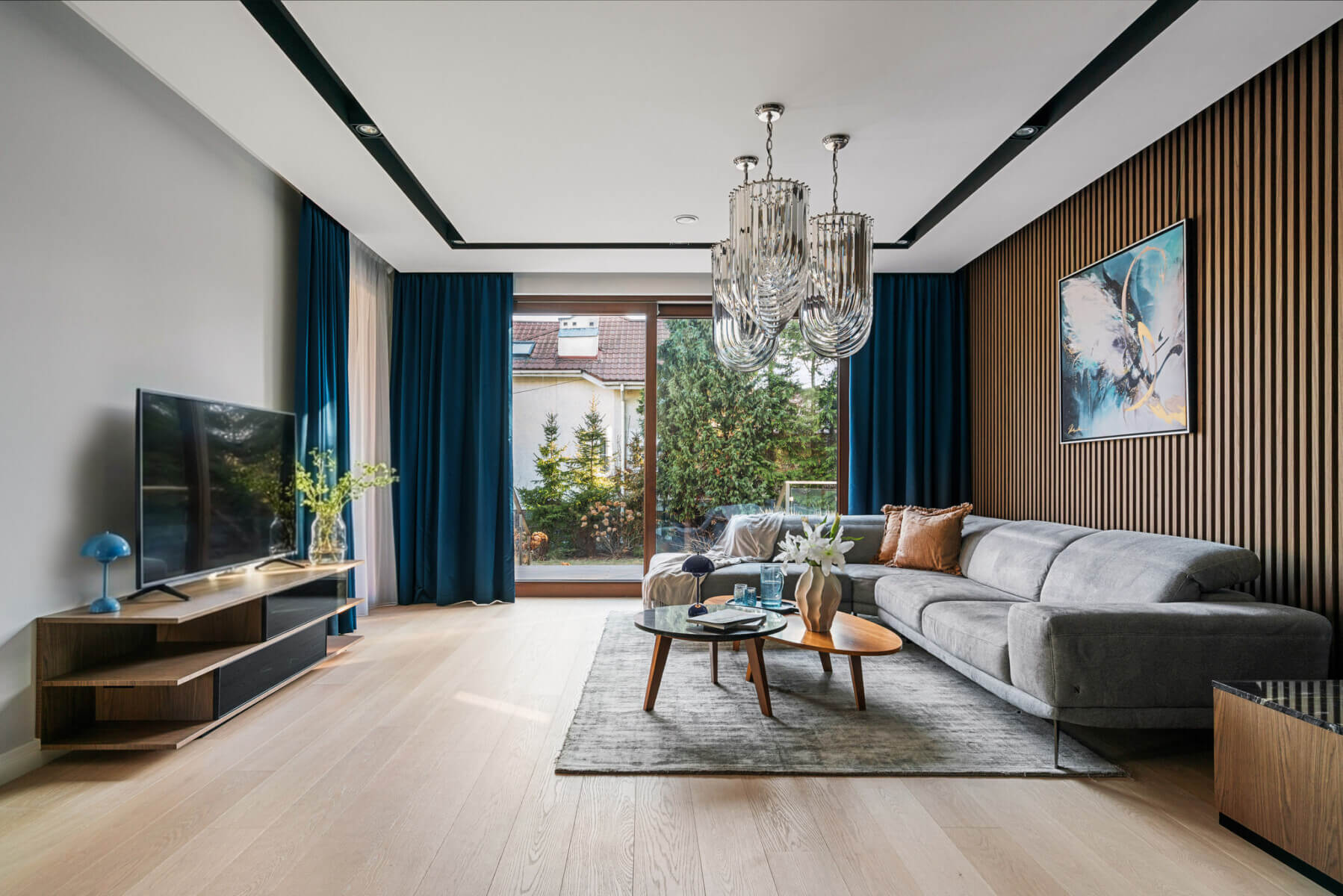Duże przesuwne przeszklenia, południowa ekspozycja części dziennej oraz naturalne drewno sprawiają, że dom jest jasny, elegancki i bardzo przyjemny do życia. Z salonu wyjście na taras (34 m²) i do słonecznego ogrodu z automatycznym systemem nawadniania.