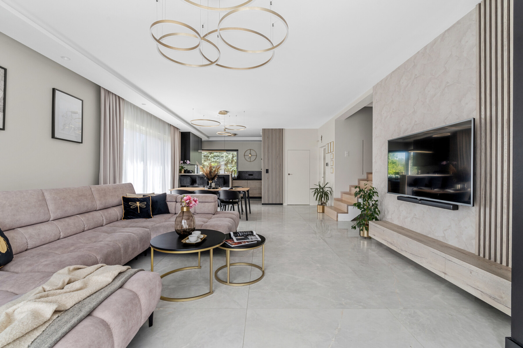 Ta wyjątkowa nieruchomość urządzona jest w niezwykle funkcjonalny sposób oraz z dbałością o najmniejsze detale. Dom położony na pięknej, ustawnej działce o powierzchni 1100 m2.