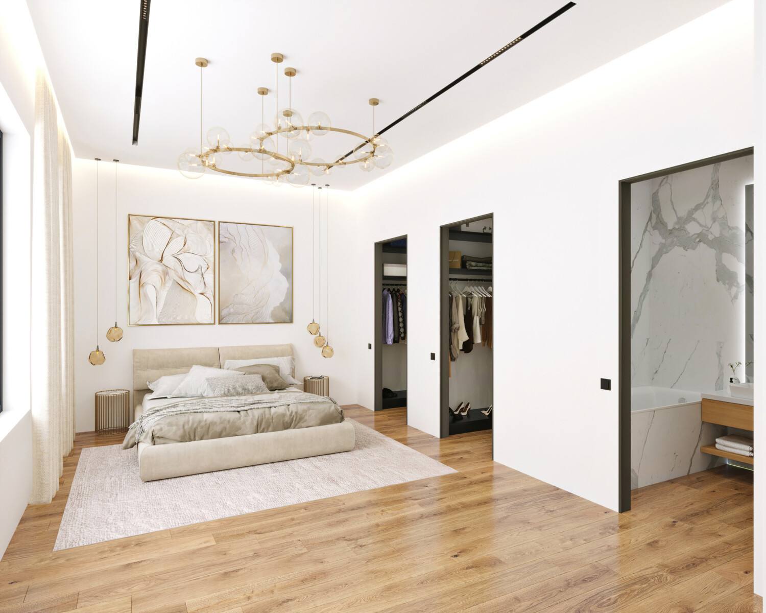 Na piętrze prywatną przestrzeń domownikom zapewniają 3 sypialnie, 2 garderoby i 2 łazienki. Intymna przestrzeń tzw. obszerna master bedroom z garderobą i łazienką (łącznie ok. 30 m2) pozwala jego mieszkańcom stworzyć azyl chroniący od miejskiej dżungli. Idealne miejsce dla osób ceniących sobie komfort życia i wygodę. Ekskluzywny charakter nadają otwarte i wysokie przestrzenie (3,2m2)