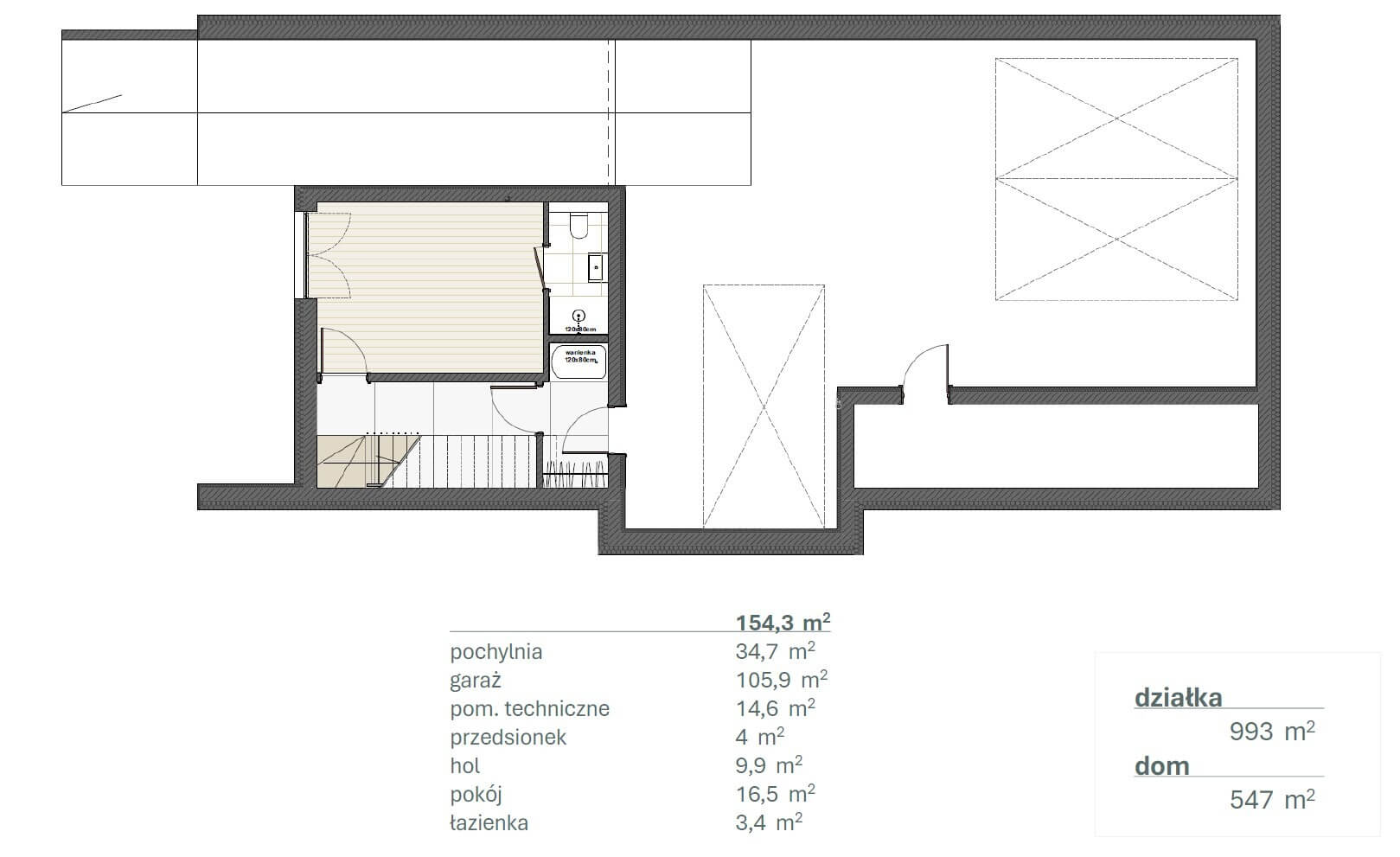 POZIOM -1 (154,3 m²) – STREFA GARAŻOWO-TECHNICZNA I DODATKOWE POMIESZCZENIA