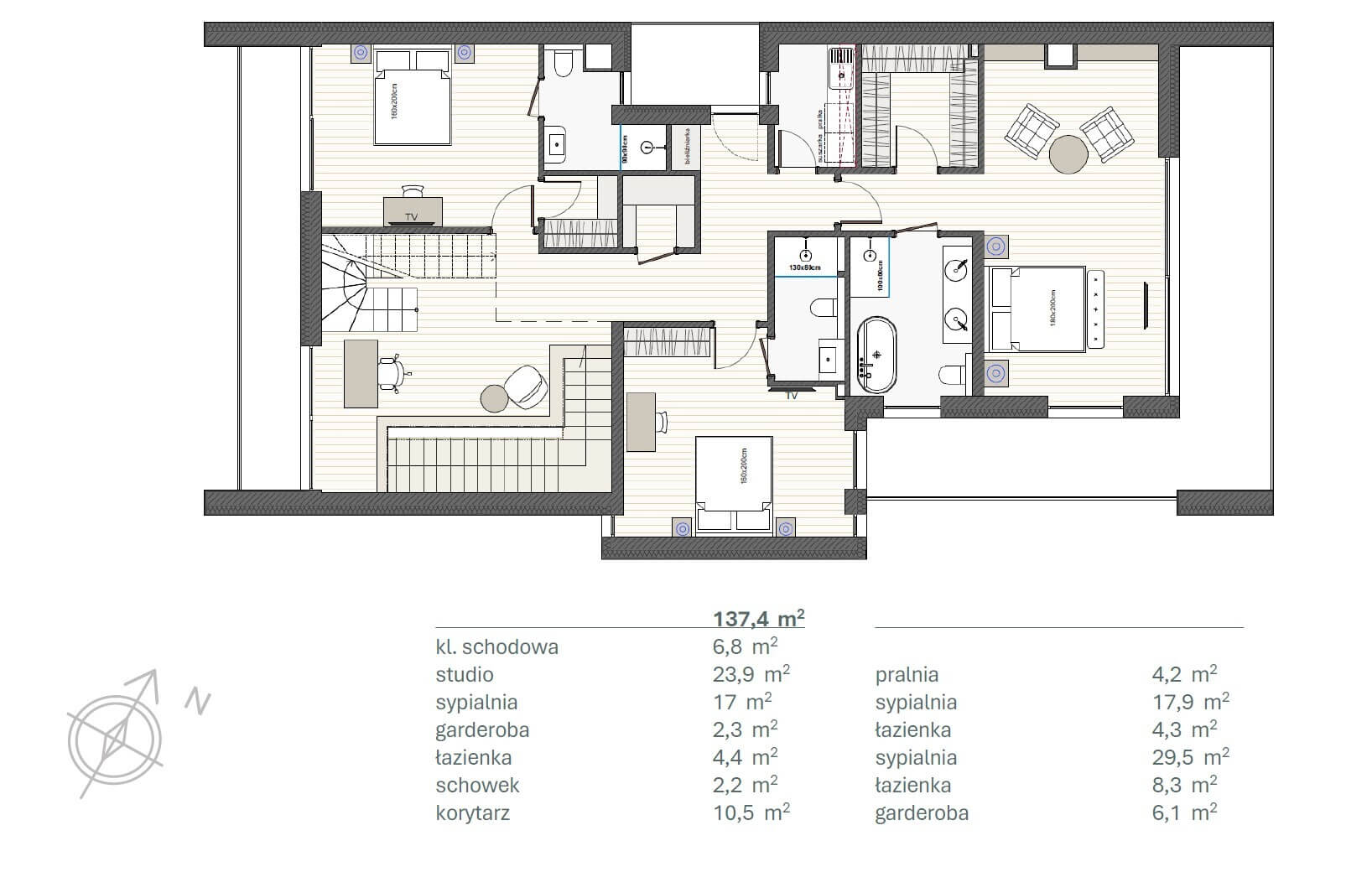 PIĘTRO 1 (137,4 m²) – ROZBUDOWANA STREFA SYPIALNIANA