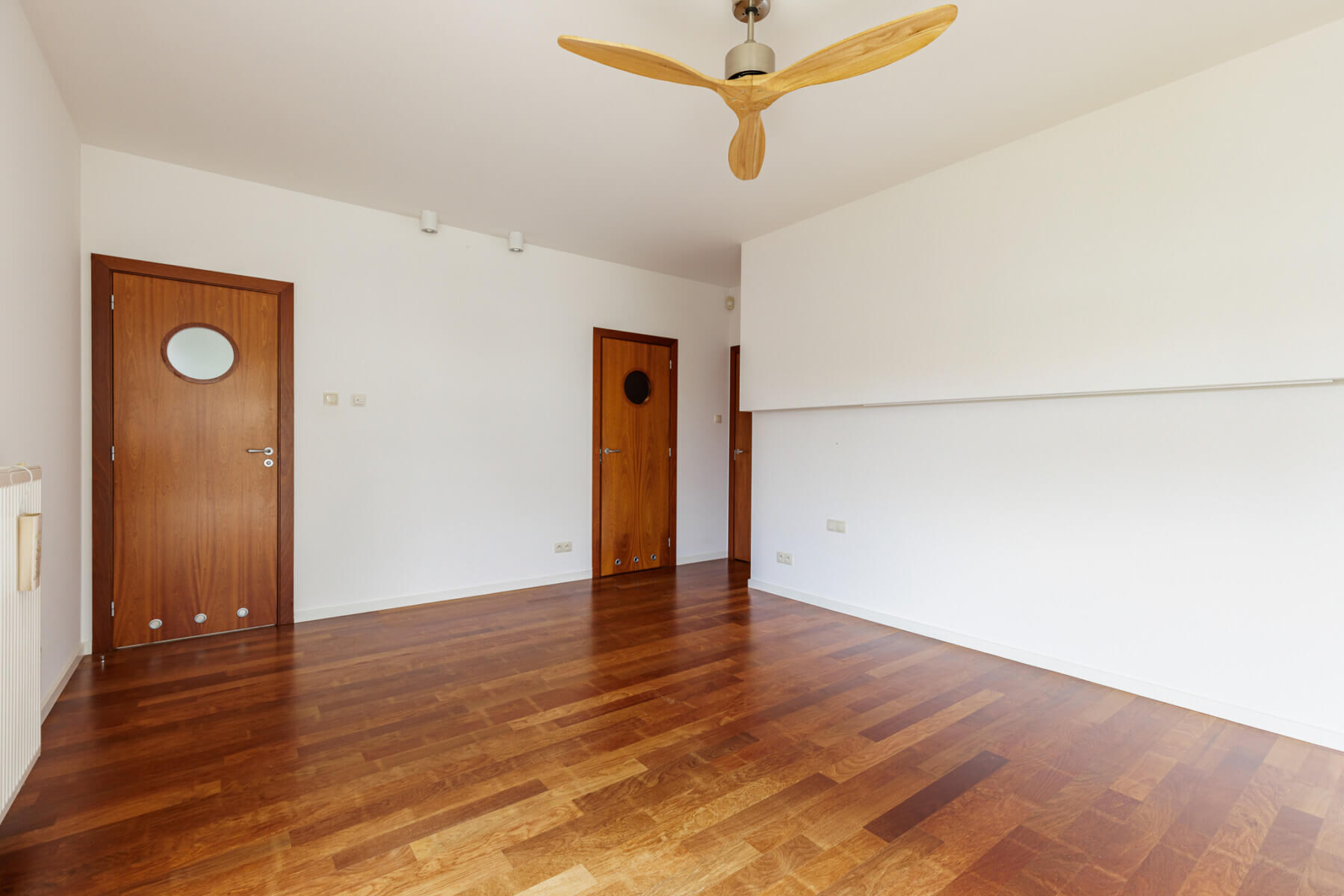 Wnętrza utrzymane w jasnej kolorystyce, z dużą ilością naturalnego światła. Drewniane podłogi, stolarka okienna w ciepłym odcieniu drewna oraz liczne zabudowy stałe (w tym garderoba) podkreślają spójny charakter domu.