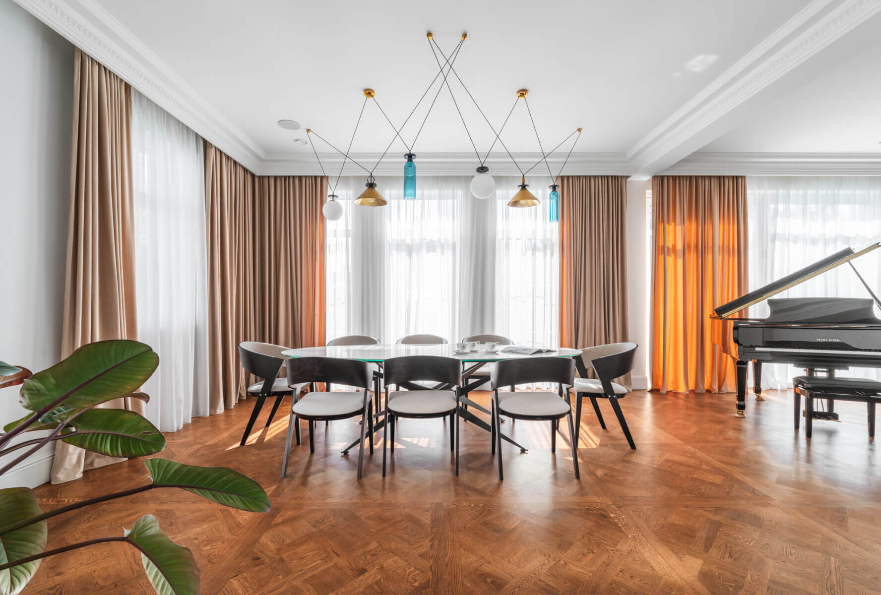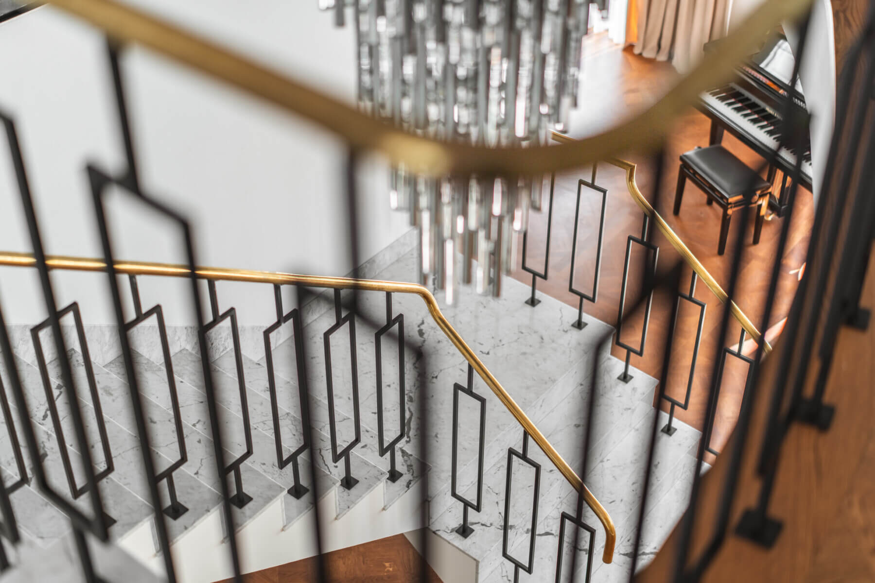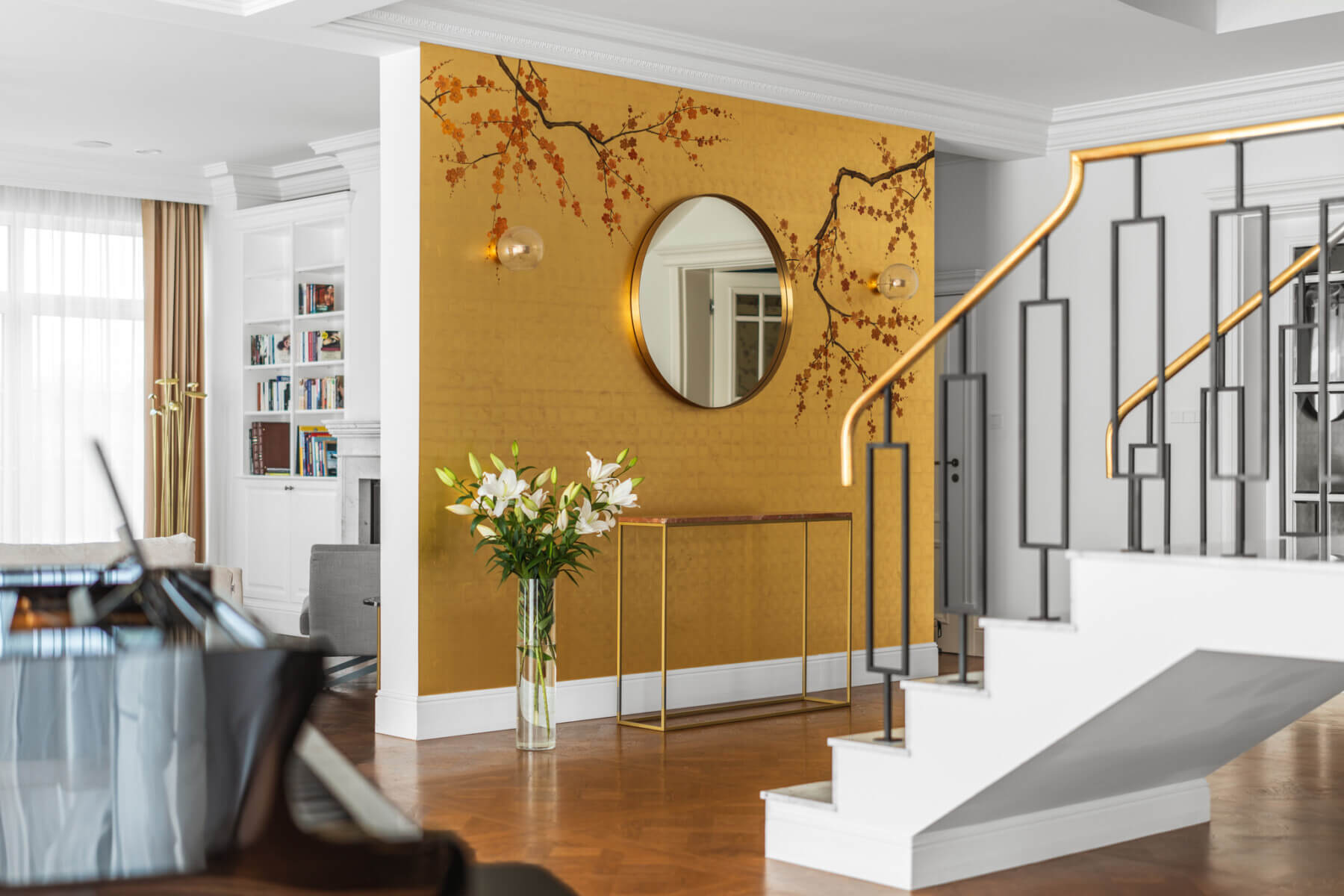 Szczególną uwagę należy zwrócić na projekt korytarza. Przestrzeń ta wita mieszkańców i gości wchodzących z zewnątrz, jednocześnie łącząc salon z jadalnią. Polscy artyści i konserwatorzy dzieł sztuki pracujący w Mediolanie, niemający sobie równych w technikach takich jak fresk czy sgraffito, stworzyli tu niepowtarzalną dekorację ścienną. Praca trwała kilka tygodni. Powierzchnię ściany zabezpieczono najpierw wieloma warstwami glinki bolusowej, a następnie ręcznie pokryto florenckim 24-karatowym złotem płatkowym. Na koniec namalowano na nim motyw kwitnących wiśni – efektowny, a zarazem harmonijny element z bardzo klasycznym charakterem wnętrza. Dopełnieniem efektu były specjalnie zaprojektowane do tej przestrzeni marmurowe schody, mosiężna balustrada oraz dwuskrzydłowe drzwi witające domowników oraz gości.