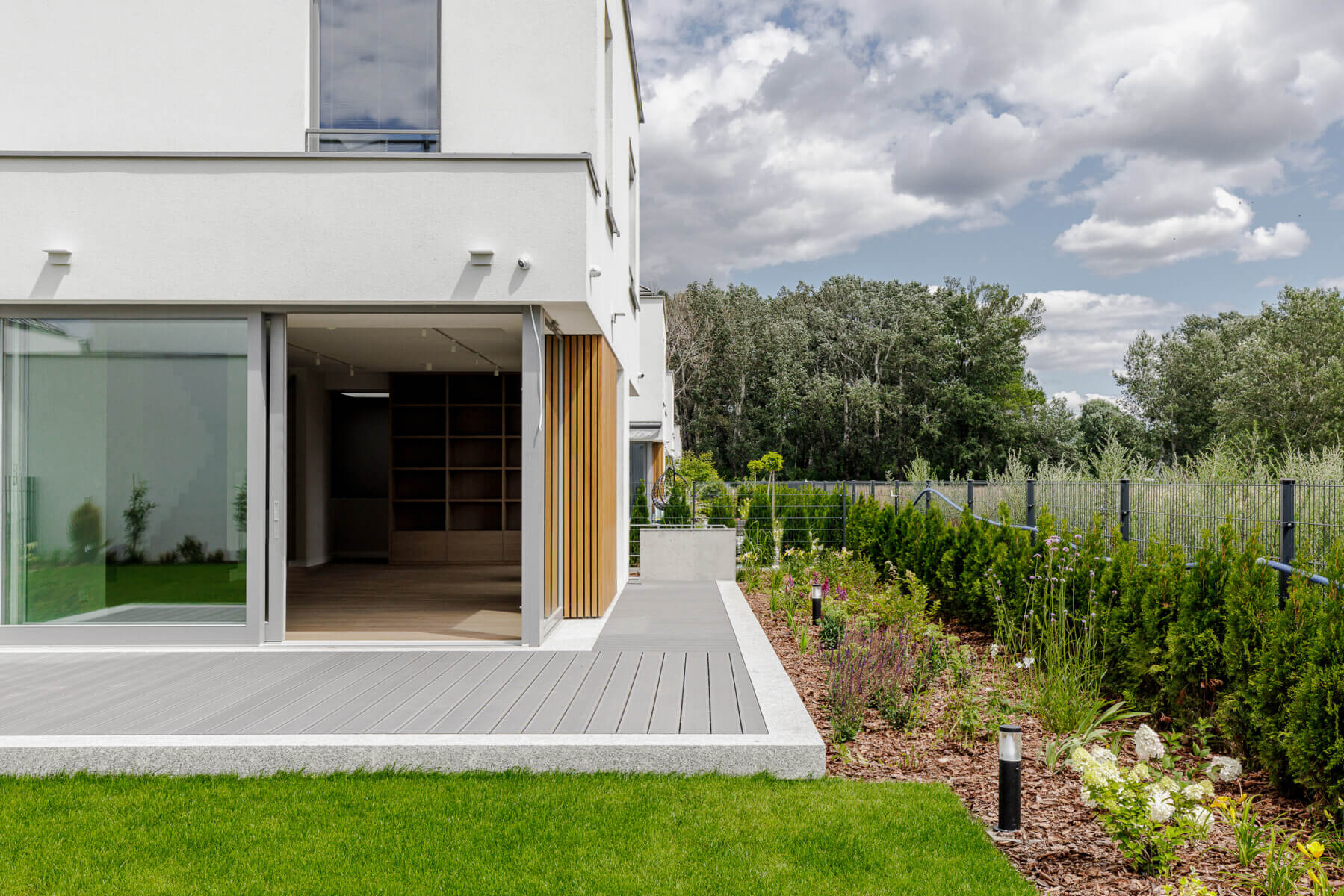 Za domem mieści się zadbany ogród z automatycznym robotem koszącym.